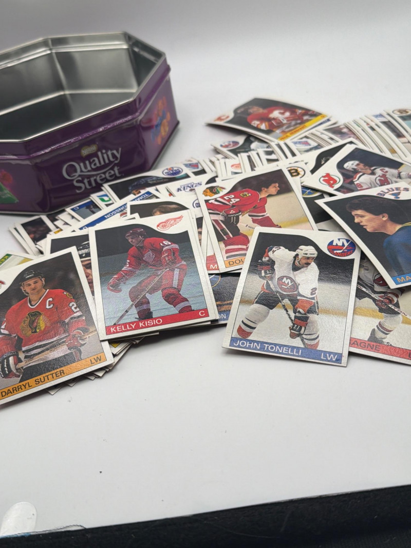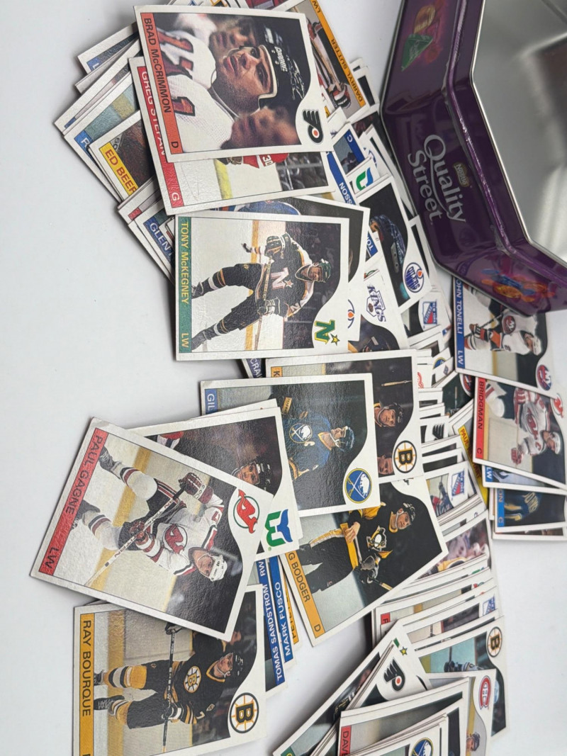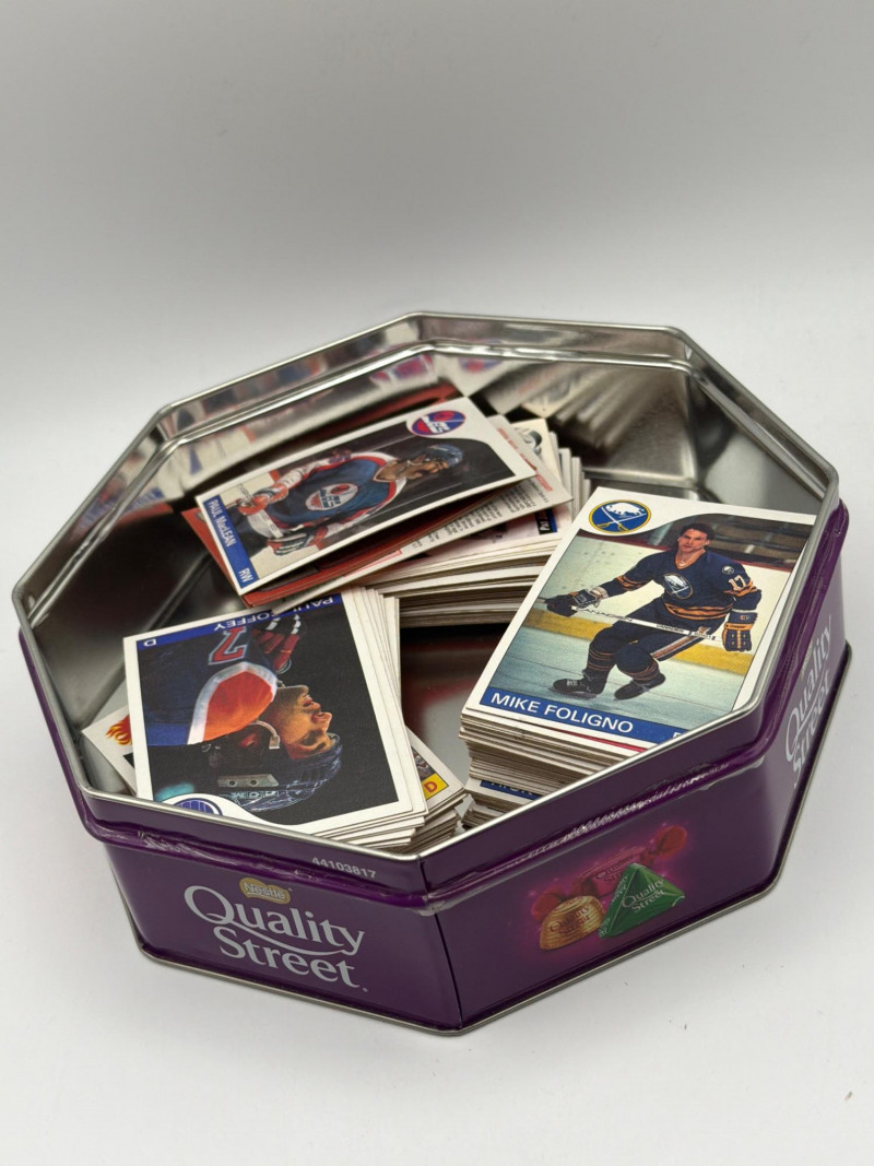 A fun NHL hockey trading card lot featuring a mixed assortment of hockey player cards stored in a decorative Quality Street tin. The cards appear to include players from multiple NHL teams, with recognizable franchises such as the Boston Bruins, New Jersey Devils, Buffalo Sabres, Hartford Whalers, and others visible in the photos. Lots like this are great for collectors, young fans, and hobbyists who enjoy sorting through cards and building team sets or player collections. The included Quality Street tin adds a nice vintage-style container that works well for storing the cards or displaying them. Bulk card assortments like this can be perfect for sorting, trading, collecting, or sharing with young sports fans. With Easter approaching, sports card lots like this can also make fun additions to Easter baskets, egg hunt prizes, or gifts for young collectors. Please review photos carefully for the exact cards and items included. Cards appear to be in mixed pre-owned condition typical of handled trading cards. Some may show minor edge or corner wear. Please review photos for details. Shipping available. Combined shipping offered for multiple auction wins whenever possible. Hockey trading cards have long been a popular collectible among NHL fans. Bulk card lots like this are commonly enjoyed by collectors who like sorting cards, completing team sets, trading duplicates, or introducing younger collectors to the hobby.