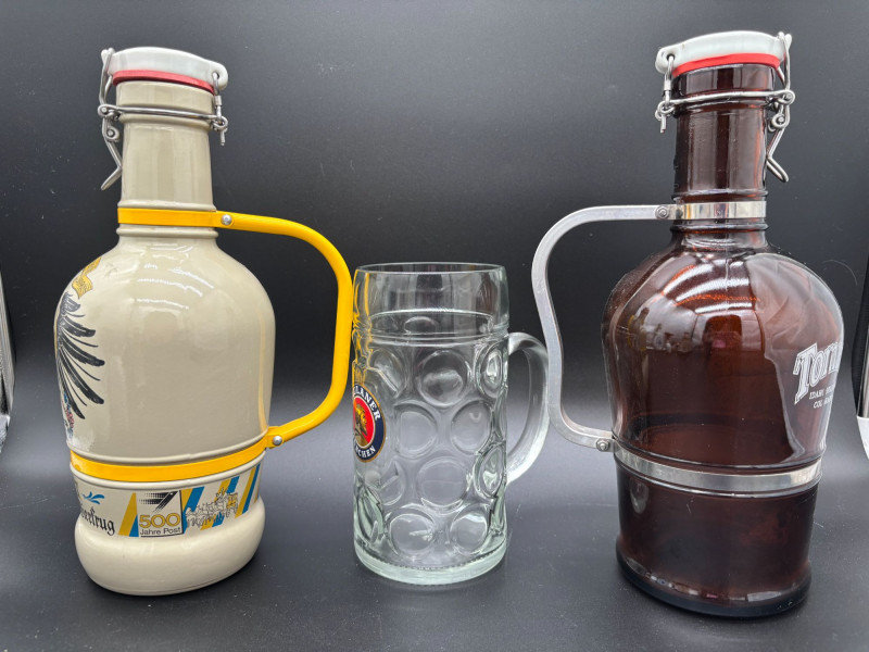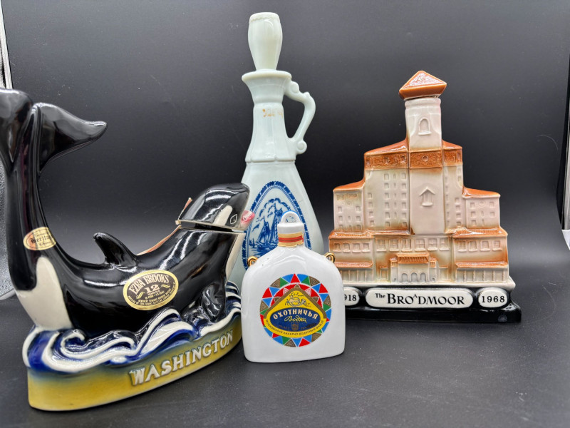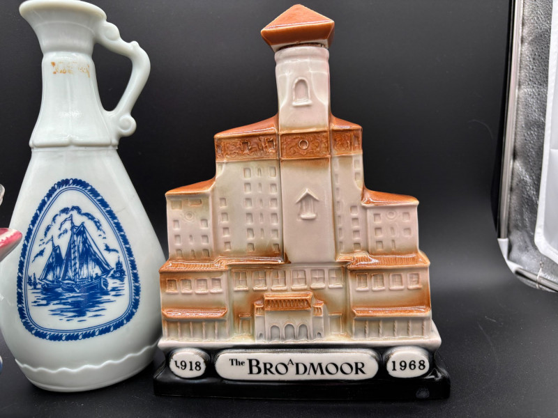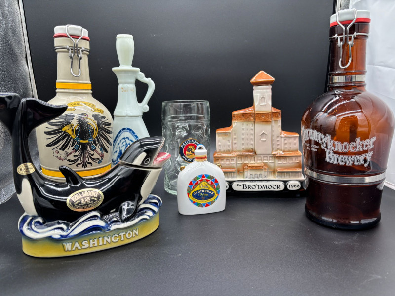 SHIPPABLE Offered as one combined lot, this unique collection features a mix of vintage decanters, souvenir bottles, and collectible barware pieces. Included in This Lot: Ezra Brooks Washington whale decanter Jim Beam-style tall ceramic sailing ship decanter Brodmoor 1918–1968 commemorative building decanter White ceramic Russian-themed bottle (Охотничья Vodka) German-style ceramic beer stein bottle (500 Jahre Post motif) Amber glass handled jug (Tom… label) Large glass beer stein mug A great mix of mid-century and later collectible bar pieces, souvenir decanters, and novelty bottles. Perfect for display, bar décor, collectors, or upcycling projects. Condition: Nice variety lot with strong visual appeal — all selling together.