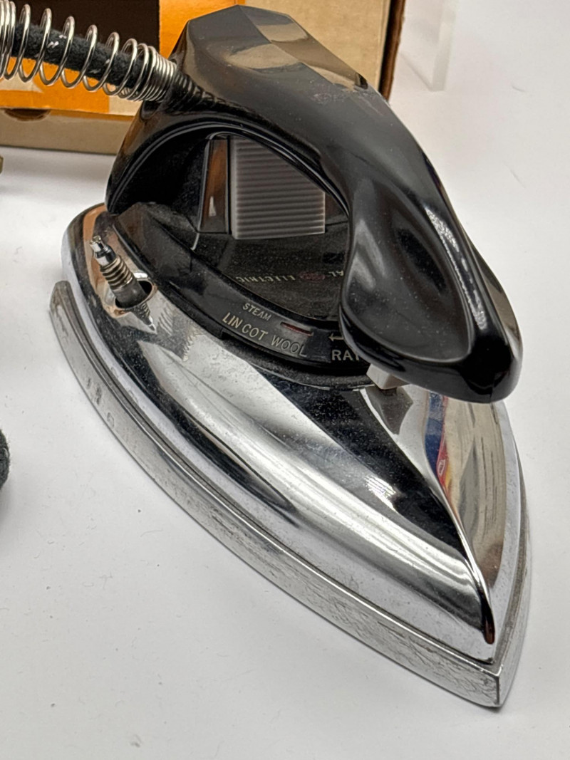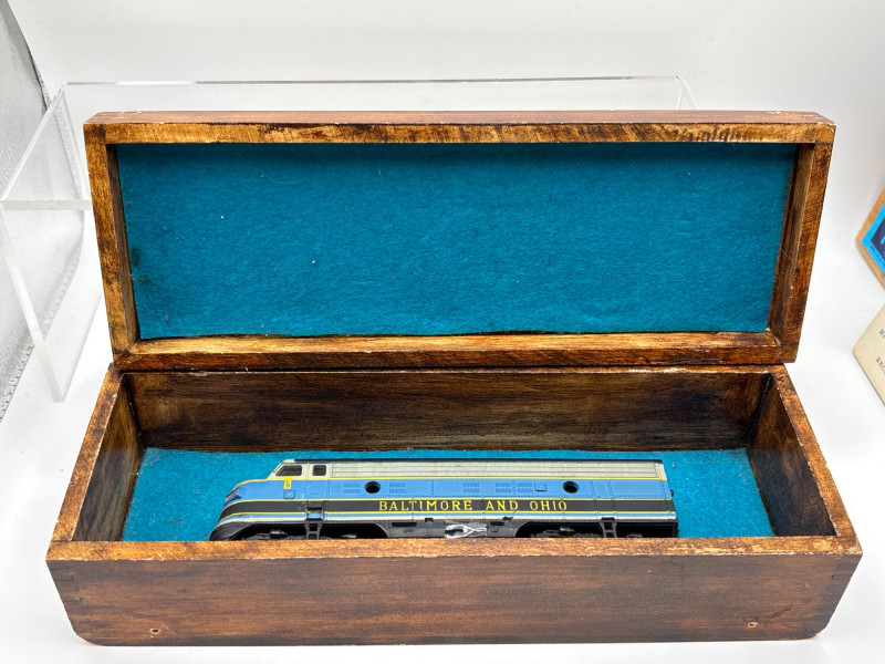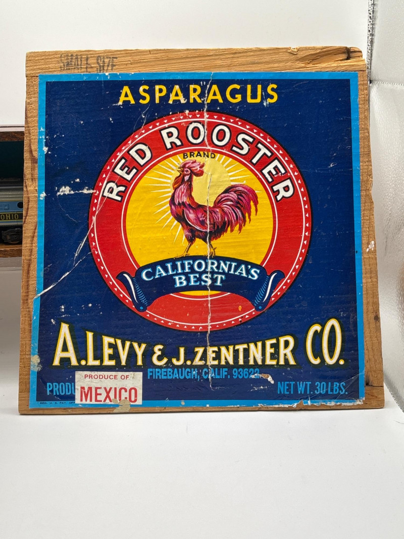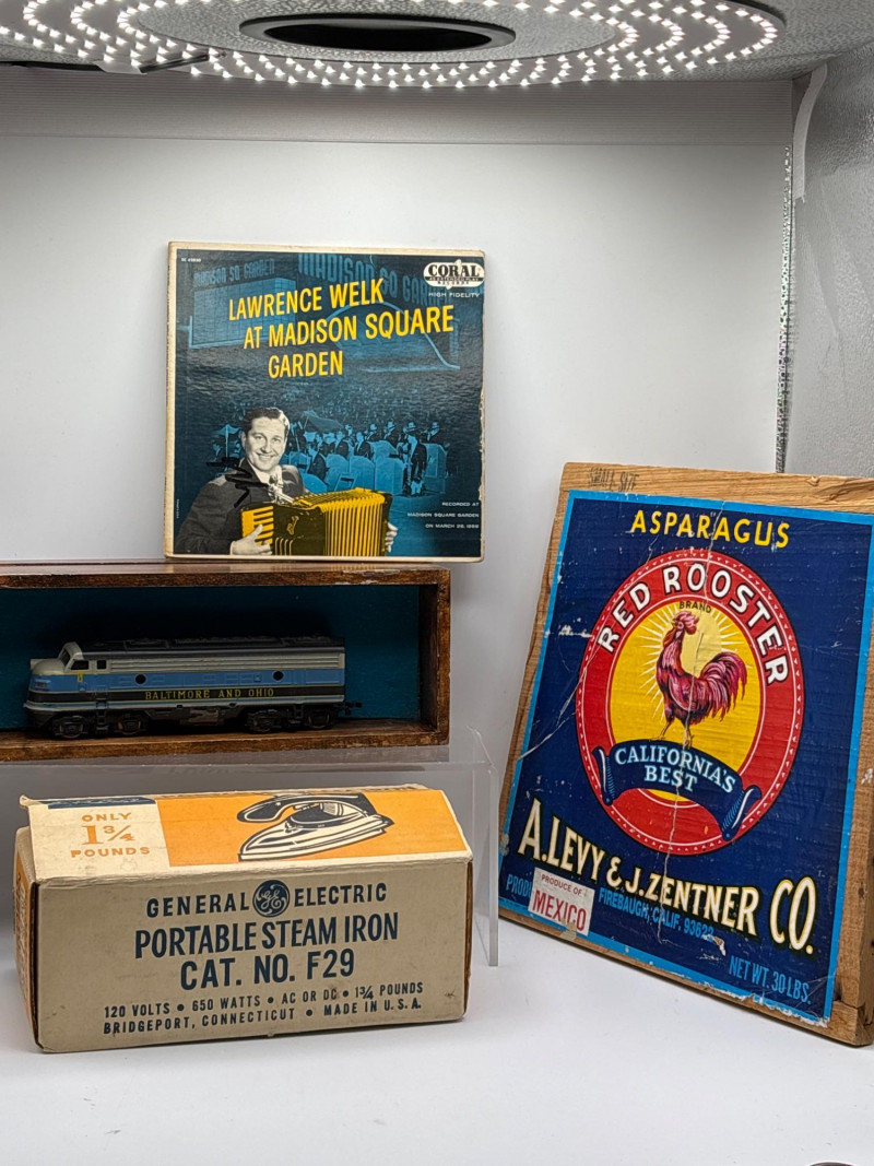 An eclectic vintage collectible lot featuring a model train locomotive, wooden display box, colorful fruit crate label, vintage record, and a boxed General Electric travel steam iron. This assortment brings together several mid-century style pieces that appeal to collectors of railroad memorabilia, advertising graphics, and vintage household items. Included is a Baltimore and Ohio diesel locomotive model displayed in a fitted wooden box, along with a striking “Red Rooster” asparagus crate label from A. Levy & J. Zentner Co. of Firebaugh, California—a classic example of colorful produce advertising artwork. The lot also features a Lawrence Welk “At Madison Square Garden” Coral Records LP, plus a General Electric portable steam iron (Cat. No. F-29) in its original box. Mixed collectible lots like this are especially fun because they bring together different areas of vintage collecting—railroad memorabilia, advertising labels, music history, and mid-century appliances. With Easter approaching, some smaller collectible items like these can also make unique additions to Easter baskets or fun treasures for collectors to discover. Please review photos carefully to see the exact items included in this lot. Vintage pre-owned condition with wear consistent with age and storage. Packaging and paper items show age-related wear. Untested items are sold as collectible display pieces. Please review photos for details. Shipping available. Combined shipping offered for multiple auction wins whenever possible. Mid-century collectibles such as fruit crate labels, model trains, and early electric appliances remain popular with collectors because they represent a time when advertising art, household design, and transportation memorabilia all carried distinctive style and craftsmanship.Description