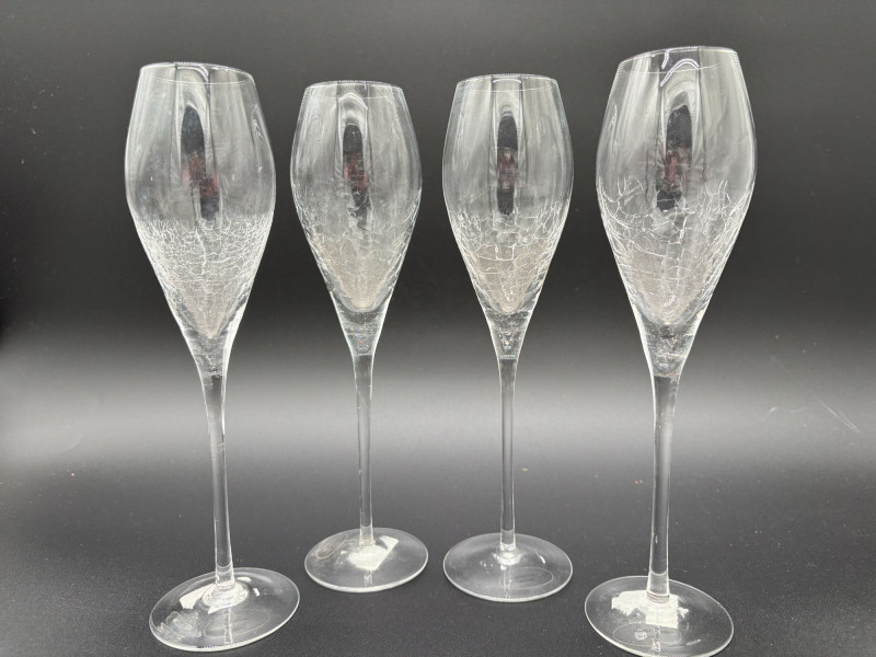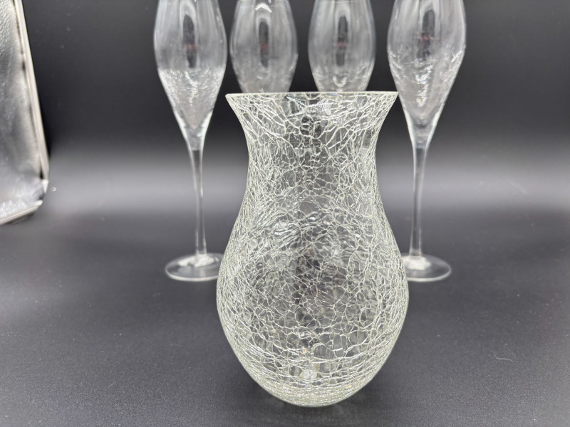 Lot # 33 - Modern Crackle Glass Vase with 4 Champagne Flutes –