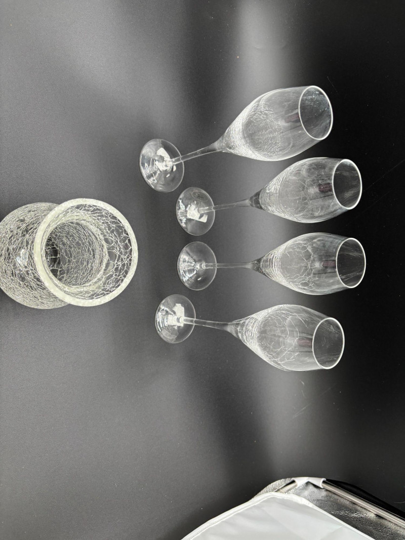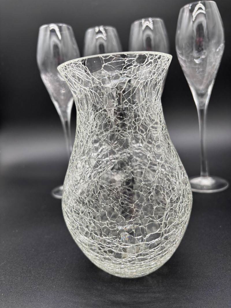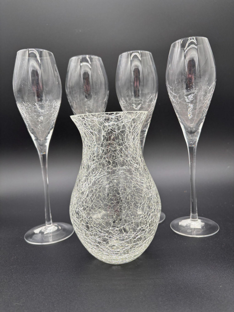 SHIPPABLE Beautiful coordinated glass lot featuring a decorative crackle glass vase paired with four tall champagne flutes. Included: 1 clear crackle glass vase 4 tall clear champagne flutes The vase features a stunning crackle glass design with a softly curved silhouette — perfect for floral arrangements or as a statement décor piece. The four slender champagne flutes add an elegant touch, ideal for celebrations, weddings, or upscale entertaining. Condition: Perfect for: Wedding décor Special occasions Barware upgrade Home staging Gift giving A classy, modern glassware set offered together as one lot.