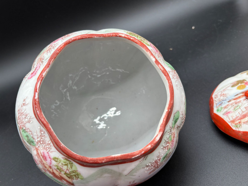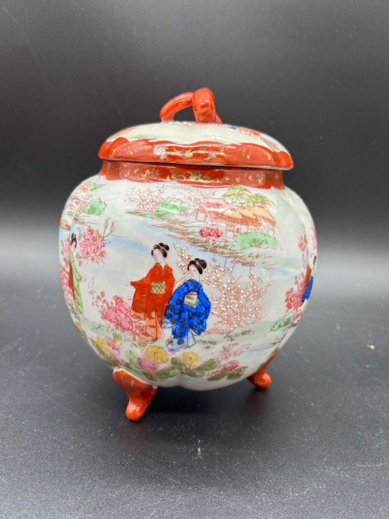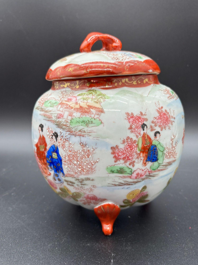 Shippable Beautiful hand-painted porcelain ginger jar featuring delicate figural and landscape scenes in soft red, green, and blue tones. The artwork depicts traditionally dressed women in a garden setting with florals and architectural elements in the background. Details include: Hand-painted decoration throughout Domed lid with red accent trim and finial handle Three small decorative feet Gold scroll detailing around the rim No maker’s mark Condition: A charming decorative piece perfect for Asian-inspired décor, collectors of vintage porcelain, or as a display accent. Please review all photos carefully, as they are part of the description. Measurements are approximate.