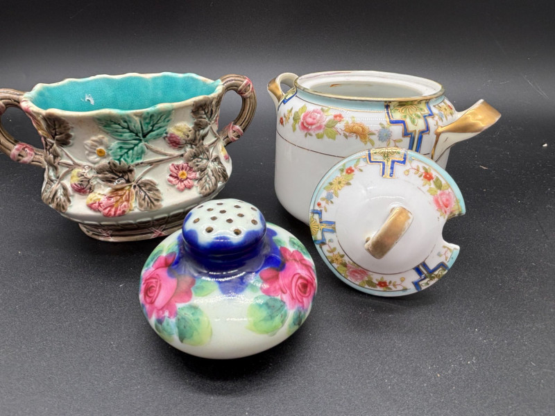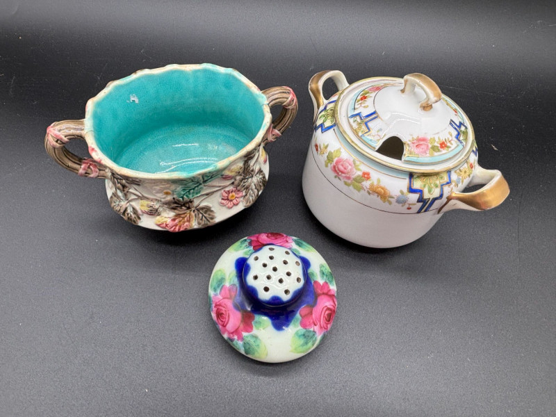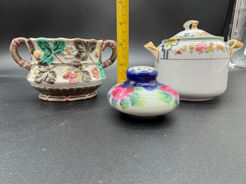 SHIPPABLE Charming vintage porcelain lot featuring three beautifully detailed decorative pieces, including marked Nippon and Wedgwood! This eye-catching trio includes: • 🌸 Hand-Painted Nippon Double-Handled Vase – Richly decorated with raised floral details and soft pastel tones. Classic antique Nippon styling with beautiful dimensional blossoms and elegant handles. Marked on bottom. • 💙 Wedgwood Lidded Sugar Bowl – Clean, timeless white porcelain accented with delicate florals and refined detailing. Marked Wedgwood on the base. A lovely display piece or addition to a collection. • 🌹 Hand-Painted Floral Shaker – Vibrant pink and blue roses with soft blended coloring and a glossy finish. Adds a sweet pop of color to the group! All three pieces display beautifully together and offer a mix of texture, color, and classic craftsmanship. Perfect for collectors, vintage décor lovers, or anyone who appreciates fine porcelain. Condition: Vintage condition with typical age-related wear. Please review photos for details. A lovely decorative lot with recognizable names and timeless appeal — don’t miss this one!