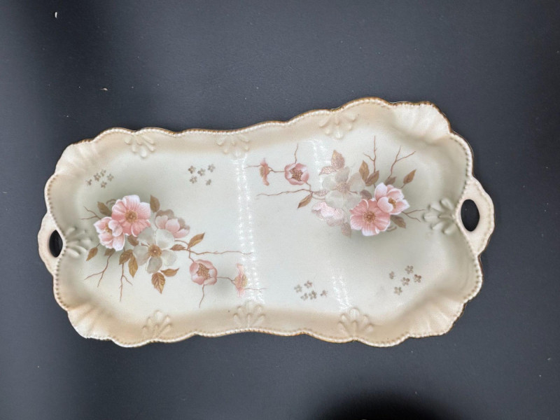 Elegant rectangular tray with soft blush florals and scalloped edges. The delicate raised detailing and classic styling give it timeless appeal. Marked Hummel on the underside. A lovely accent for vanity display, tea service, or seasonal décor.
