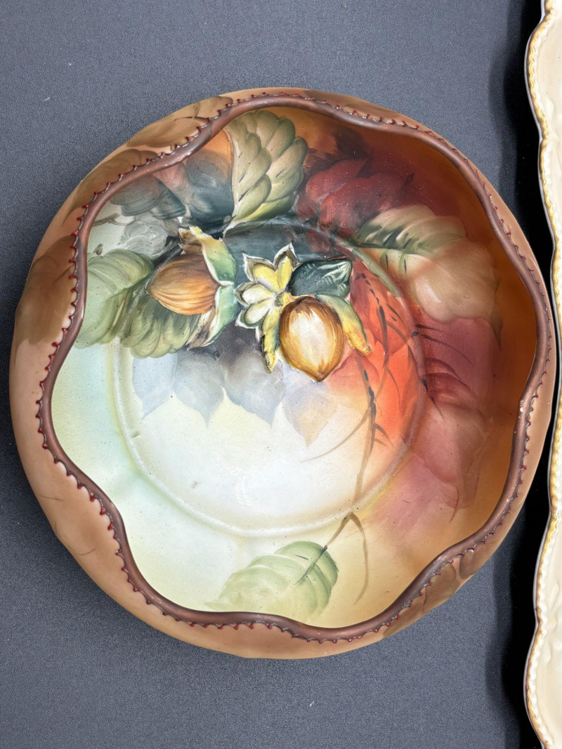 Richly colored in warm autumn tones, with detailed walnut and foliage artwork. The hand-painted shading and sculpted rim add depth and character. Marked Nippon on the base.