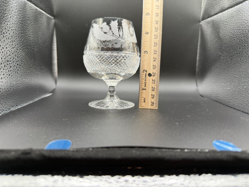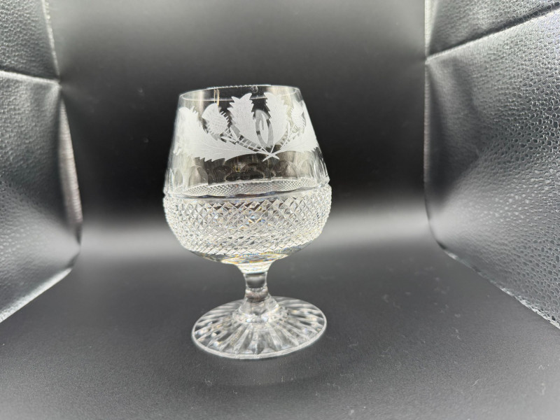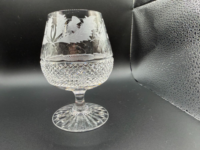 Shippable Elegant Edinburgh Crystal stemmed glasses featuring the classic etched thistle motif, a traditional Scottish design. The bowls are beautifully etched with detailed thistles, paired with a diamond-cut lower section and radiating cut foot. These have a substantial feel and excellent clarity typical of fine British crystal. Details: Maker: Edinburgh Crystal Pattern: Thistle Material: Cut and etched lead crystal Stemmed design with starburst cut base Condition: Perfect for whisky, brandy, or elegant after-dinner drinks. A lovely addition to a bar cart or crystal collection.