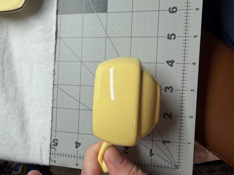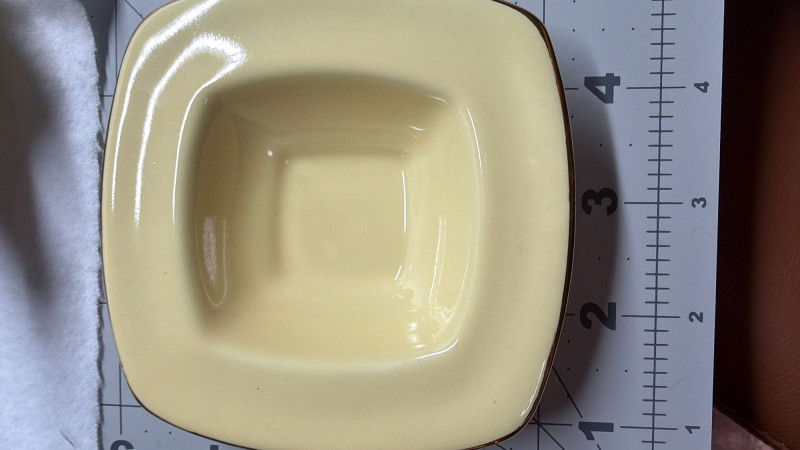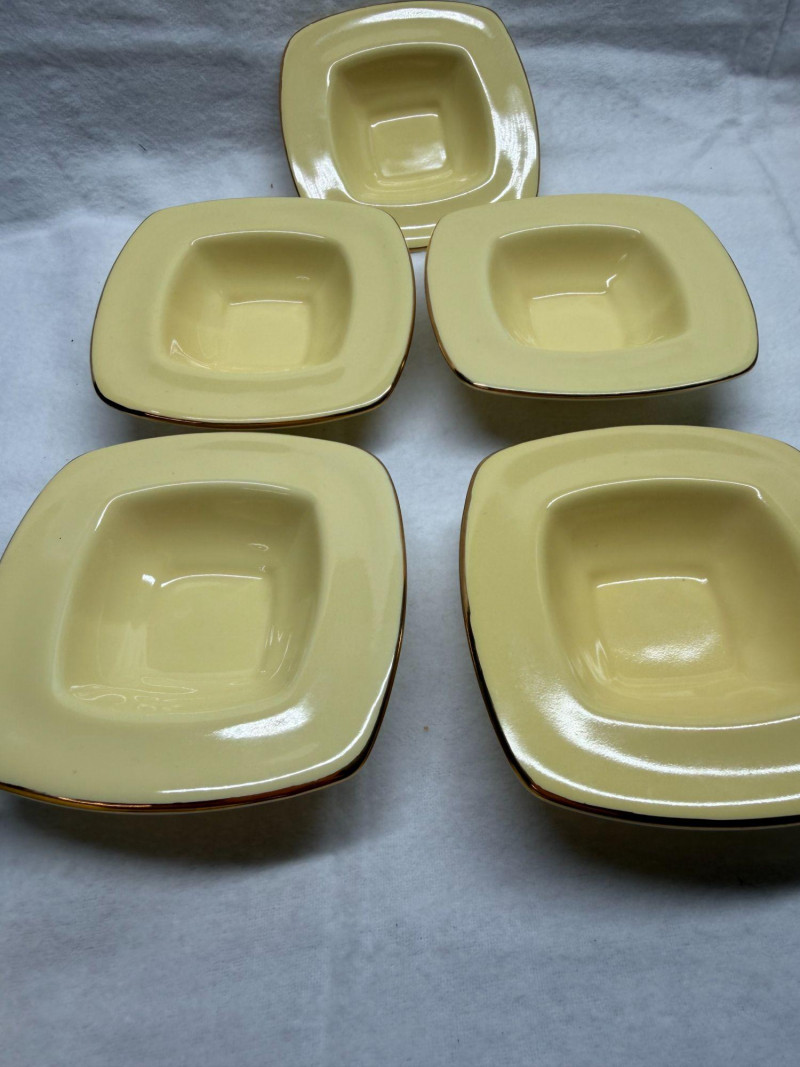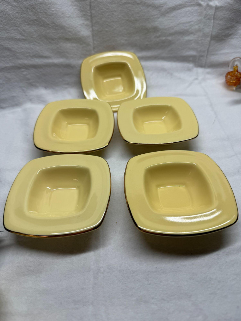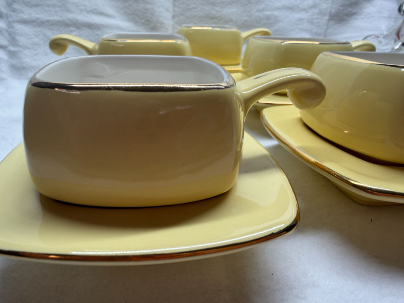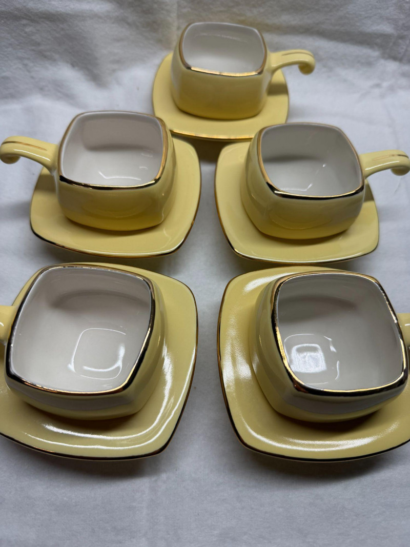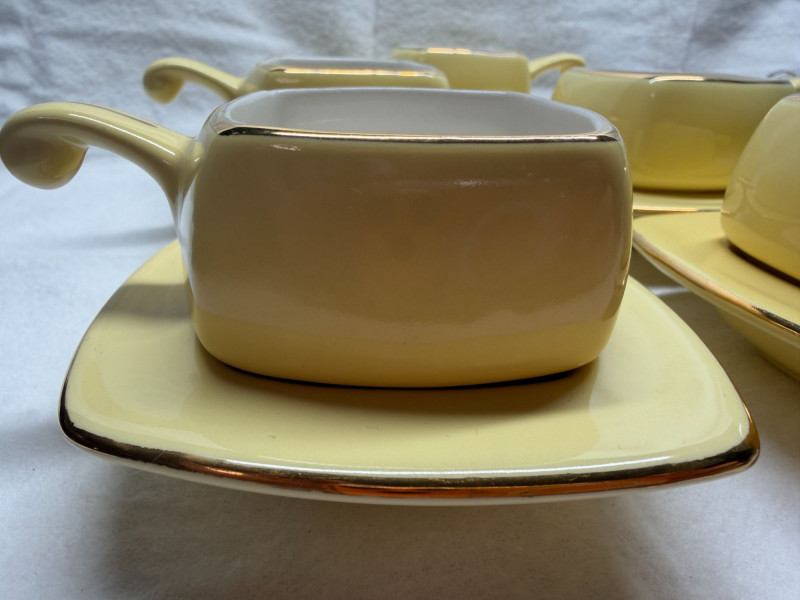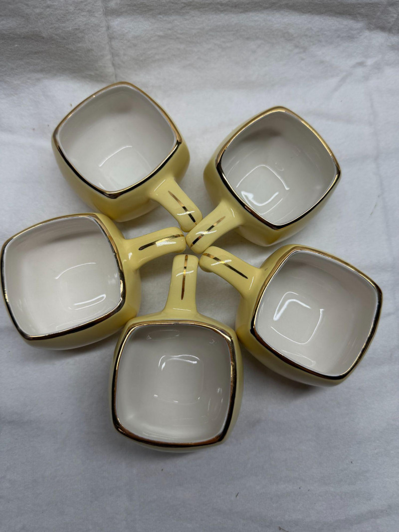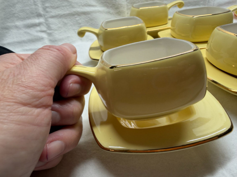 SHIPPABLE Charming mid-century modern demitasse set featuring five square yellow cups with matching square saucers and elegant gold trim. The soft butter-yellow glaze paired with the clean geometric shape gives this set a sleek 1950s–1960s aesthetic. Each cup has a white interior with gold rim detail and a matching gold accent on the saucers. The square form and sculpted handles make these perfect for espresso, after-dinner coffee, or a stylish display. Details: Set includes 5 cups & 5 matching saucers Color: Soft yellow with white interior Gold trim accents Square/geometric form Approx. cup height: 3” (see photo for scale) Condition: Perfect for MCM collectors, retro kitchen décor, or entertaining in style.