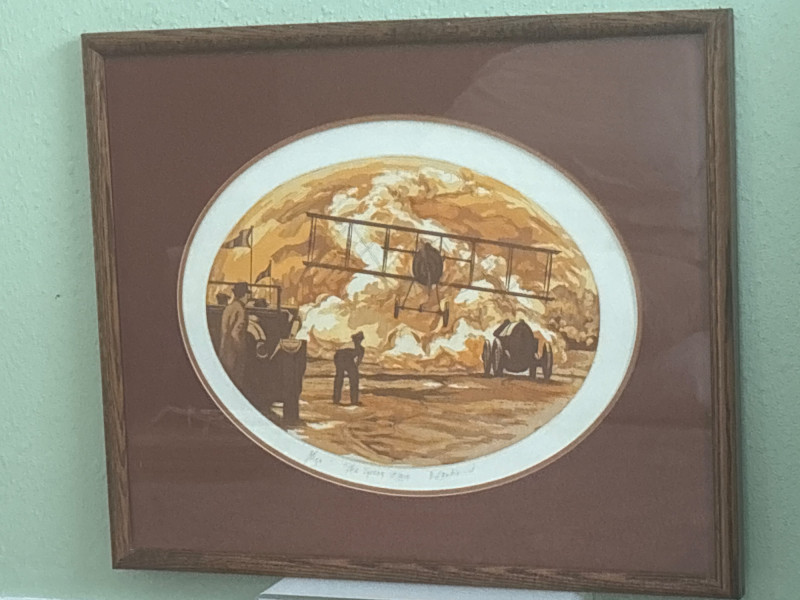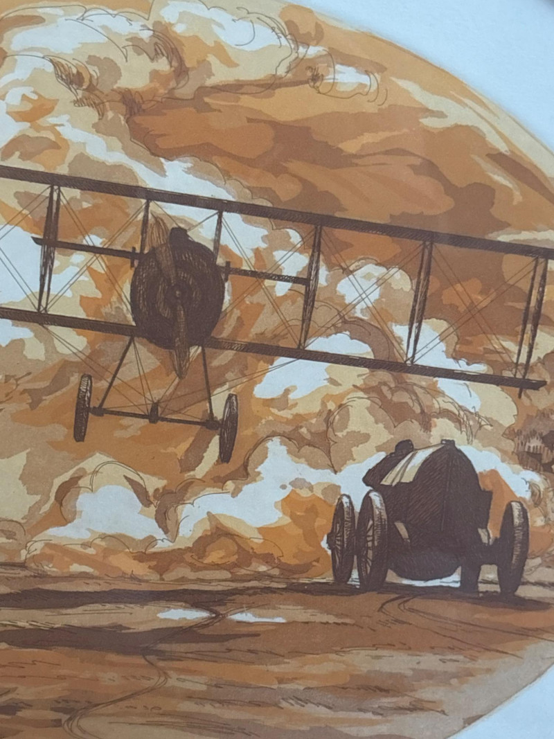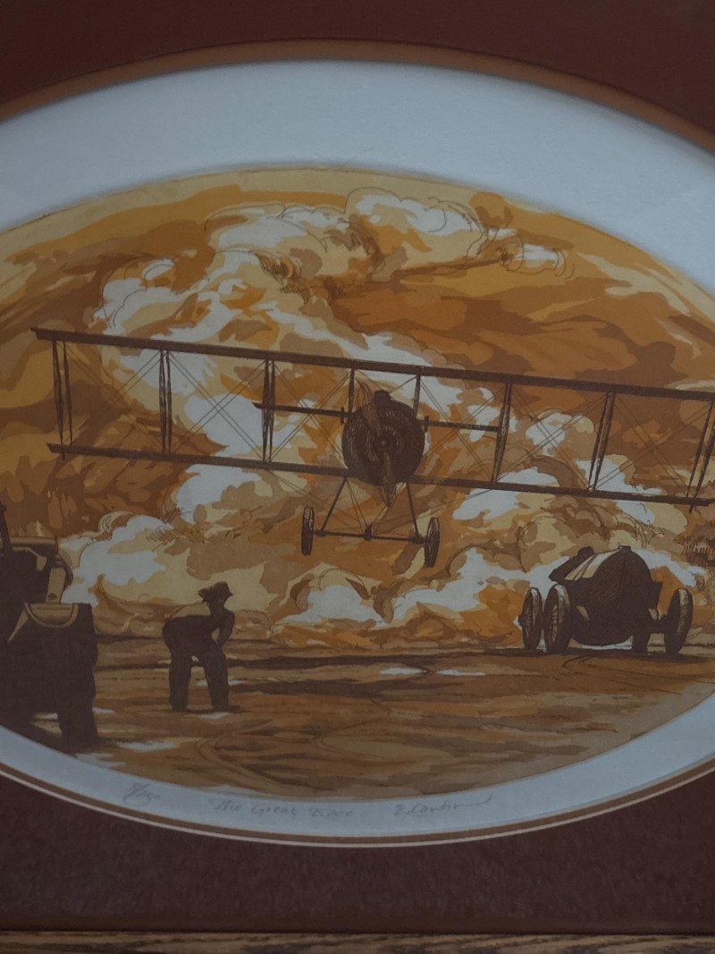 A dramatic moment frozen in time—early aviation meets speed and history. This piece beautifully depicts a vintage aircraft descending amidst a dramatic sky, with early race cars and figures on the ground—an evocative moment that blends innovation, competition, and history. ✔️ Signed & Numbered Etching The warm sepia tones and dynamic composition give this artwork a timeless, almost cinematic presence—perfect for collectors of: 👉 This is not just decor—it’s a conversation piece that captures a pivotal era of human progress.o Please review all photos carefully—pictures are part of the description. 🚚 Shipping Shipping Available – Nationwide 📦 Please email or text to request shipping. Once your invoice is paid, a second invoice will be sent for the actual shipping cost.