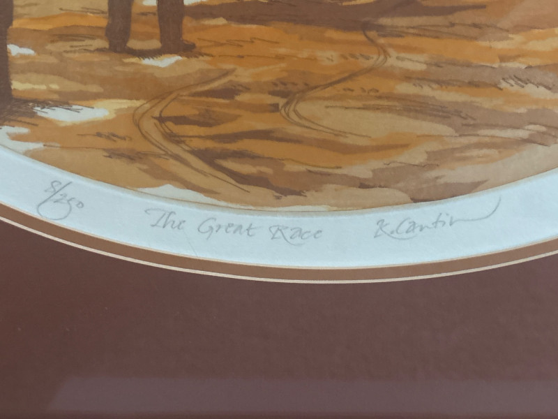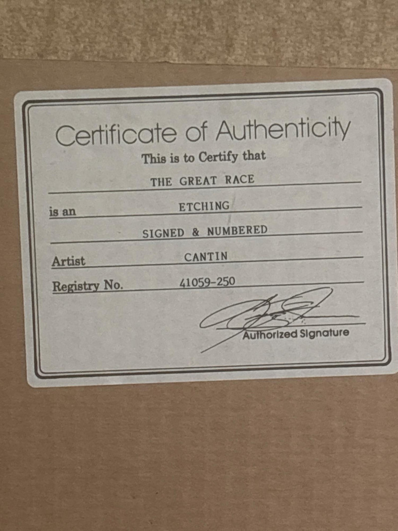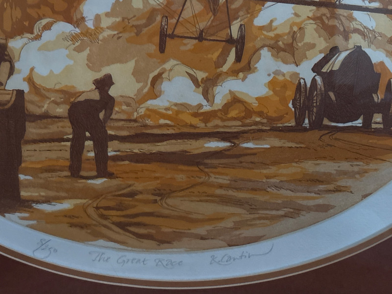 Signed and numbered Cantin etching with certificate—ready to display.Striking framed etching titled “The Great Race” by listed artist Cantin, capturing a powerful scene from the early days of aviation and motor racing.