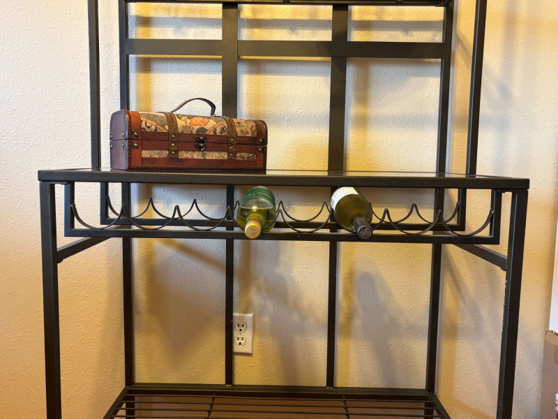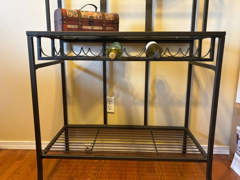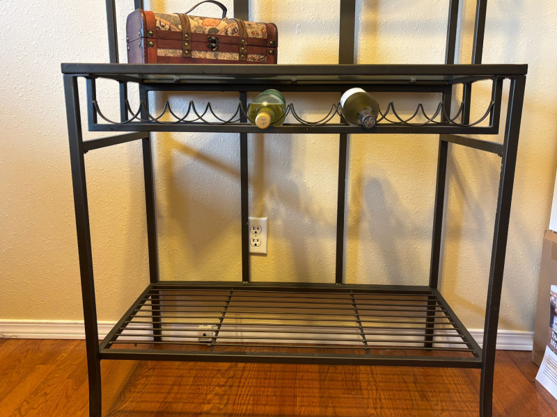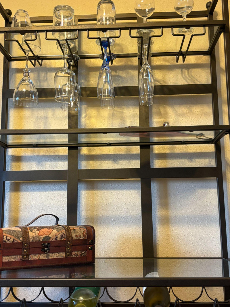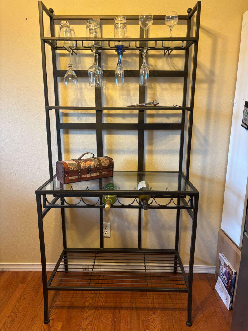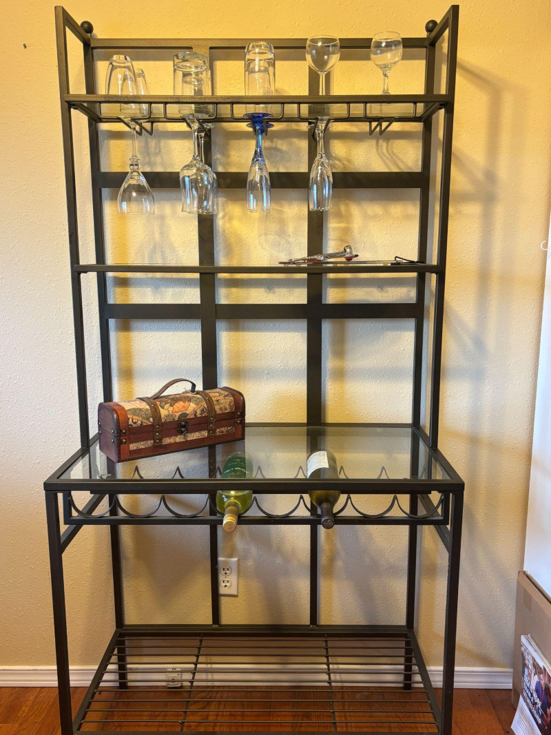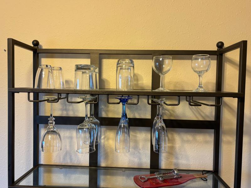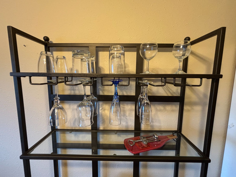 Everything you need to create a stylish, ready-to-use bar setup. Complete bar cart bundle featuring a sleek metal and glass shelving unit with hanging stemware storage, paired with a curated mix of barware and decor. This is a turnkey entertaining setup designed to elevate your space instantly. Includes: Thoughtfully styled and ready to use—perfect for a home bar, Airbnb or rental upgrade, or as a functional statement piece in a kitchen or dining space. Wine bottles shown are NOT included (no alcohol included in this lot). Overall very good condition with light wear consistent with normal use. Glassware appears intact. Local pickup only due to size and glass components.
