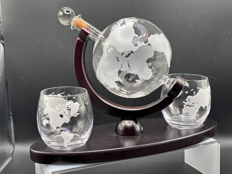 Lot # 9 - World Globe Whiskey Decanter Set w 2 Glasses Bar Display