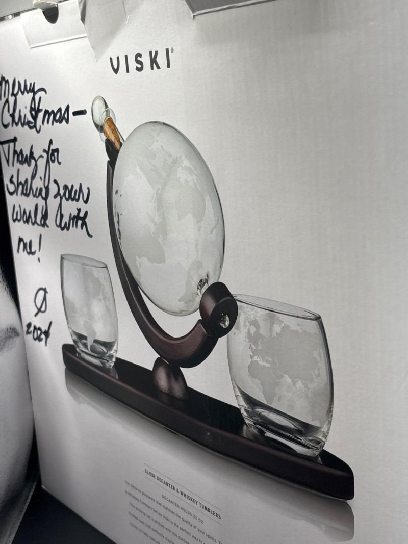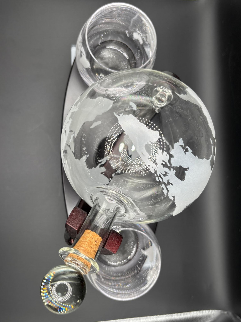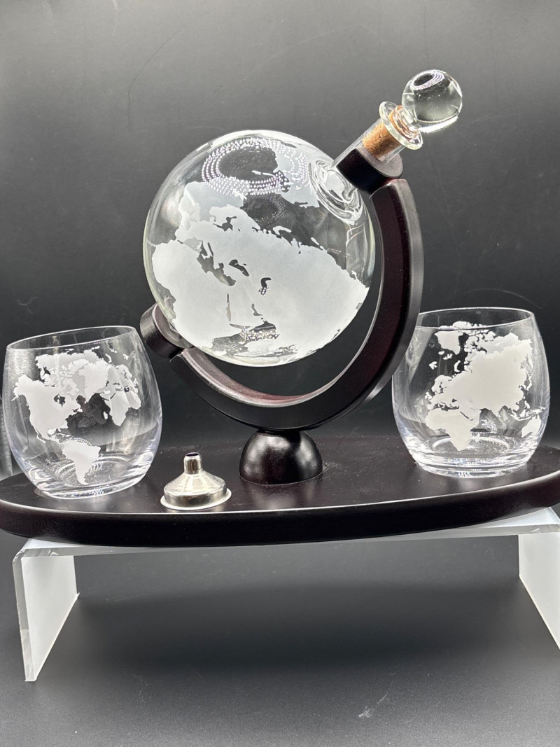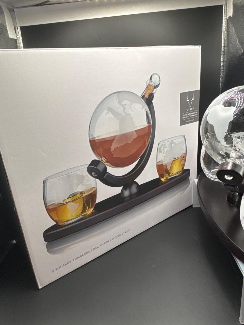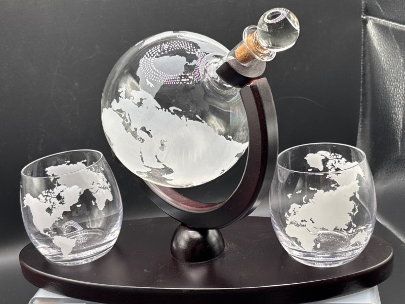 A true statement piece—this world globe decanter set turns any bar into a conversation starter. Beautiful globe-style whiskey decanter set featuring an etched world map design, mounted on a rich wood-tone stand with matching base. Includes two coordinating lowball glasses, also etched with a world map motif for a cohesive, elevated look. The decanter tilts smoothly within its frame, making it both visually striking and easy to use. Perfect for whiskey, bourbon, or your favorite spirits. Includes: Ideal for: Very good condition with minimal wear. No visible cracks or chips noted. Shipping available. Please email or text to request shipping. Once your invoice is paid, a second invoice will be sent for actual shipping costs.