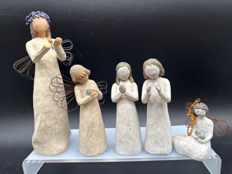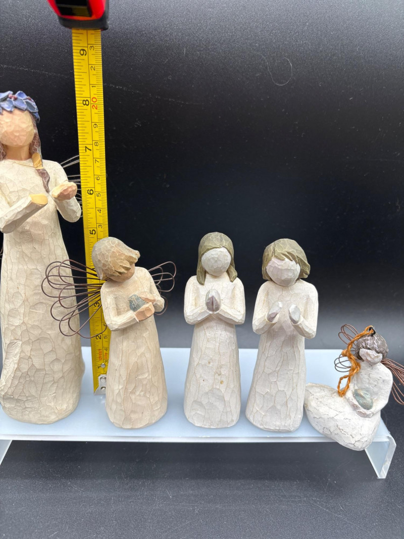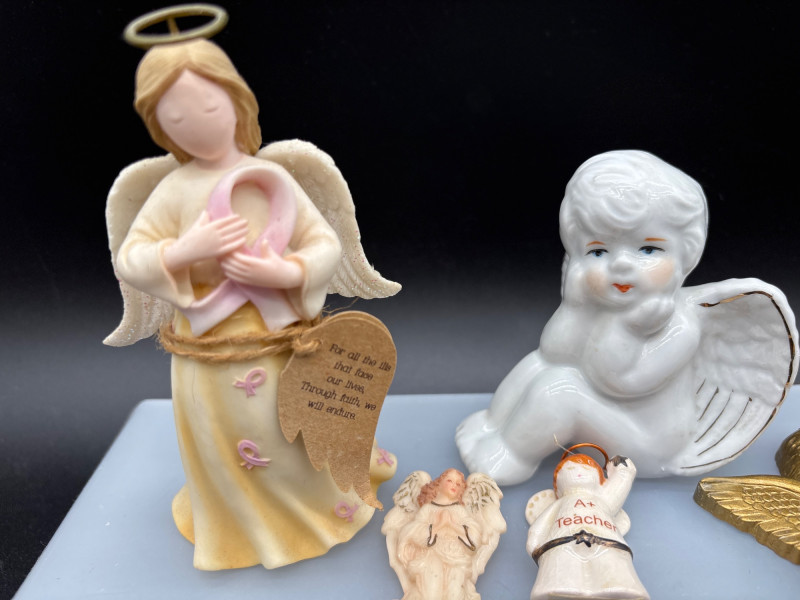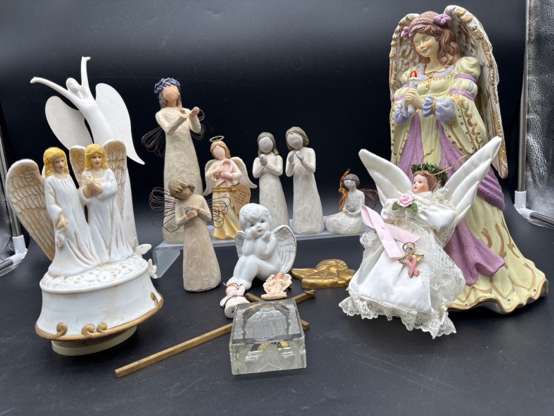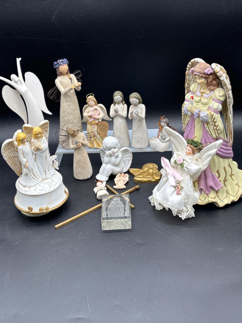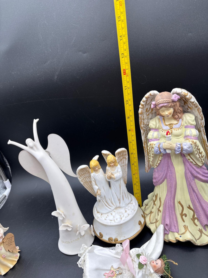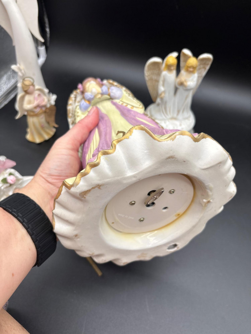 A beautiful collection of angel figurines—several with working music boxes. Large angel figurine collection featuring a mix of styles, including multiple wind-up music box bases, cherubs, and decorative angel figures. Includes: 👉 Several pieces feature mechanical wind-up music boxes on the underside (as shown), adding both collectible and functional appeal. Perfect for: The soft tones and detailed designs create a peaceful, cohesive display when grouped together. Good overall condition with light wear consistent with normal use. Please review all photos carefully—pictures are part of the description. Shipping available. Please email or text to request shipping. Once your invoice is paid, a second invoice will be sent for actual shipping costs.