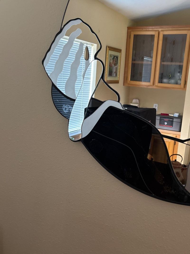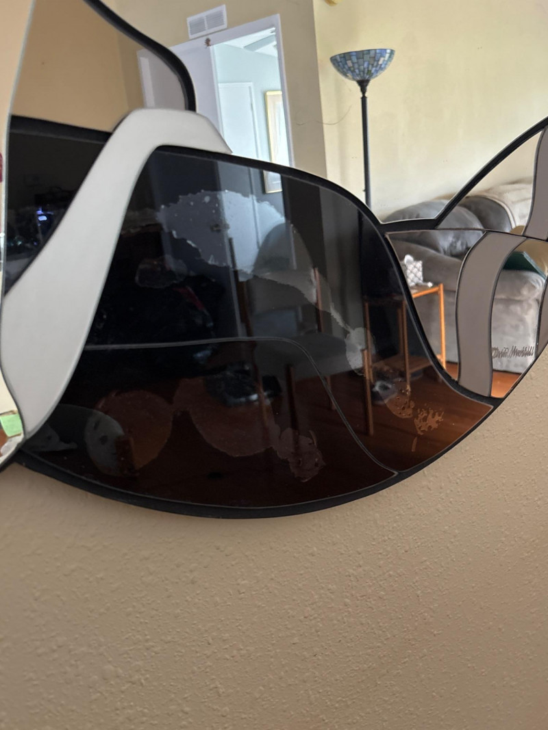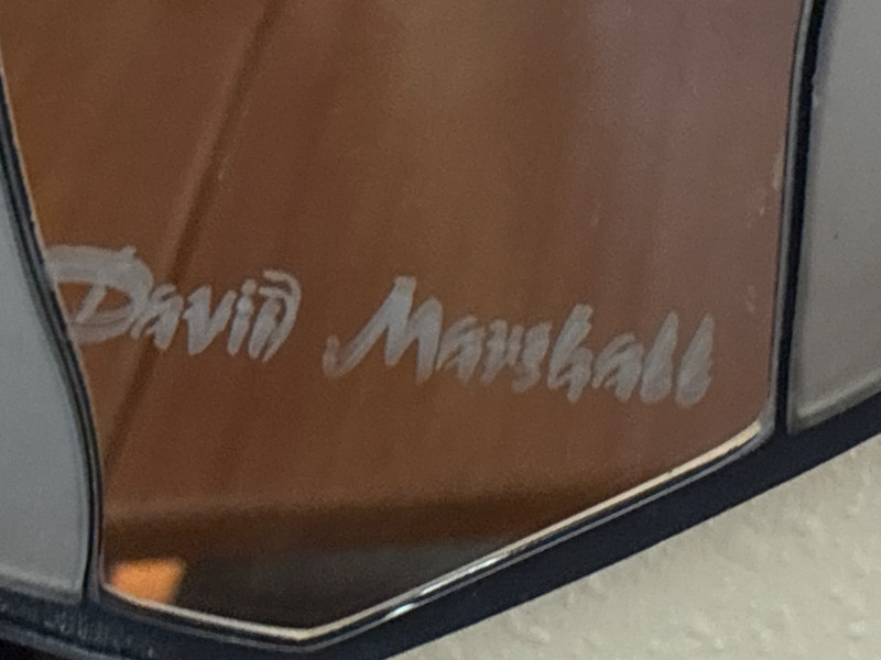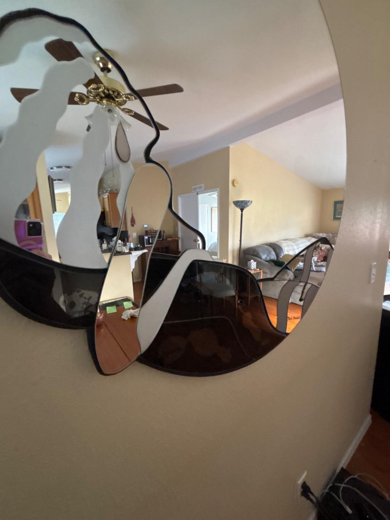 A striking signed statement piece, this David Marshall art mirror blends sculptural design with functional decor—perfect for creating a focal point in any space. This round mirror (~36" diameter) features a bold, modern silhouette accented with an abstract, layered design element that gives it depth and artistic presence. The contrast of reflective surface and sculptural detailing makes it far more than just a mirror—it’s wall art. Signed David Marshall, a name known for distinctive decorative pieces, this mirror carries both aesthetic appeal and designer recognition. ✔️ Large 36" round statement size Pieces like this are highly sought after for entryways, living rooms, and designer-inspired interiors, where one standout item can define the entire space. Good overall condition. No major damage noted. May show light wear consistent with use. No shipping available for this item.