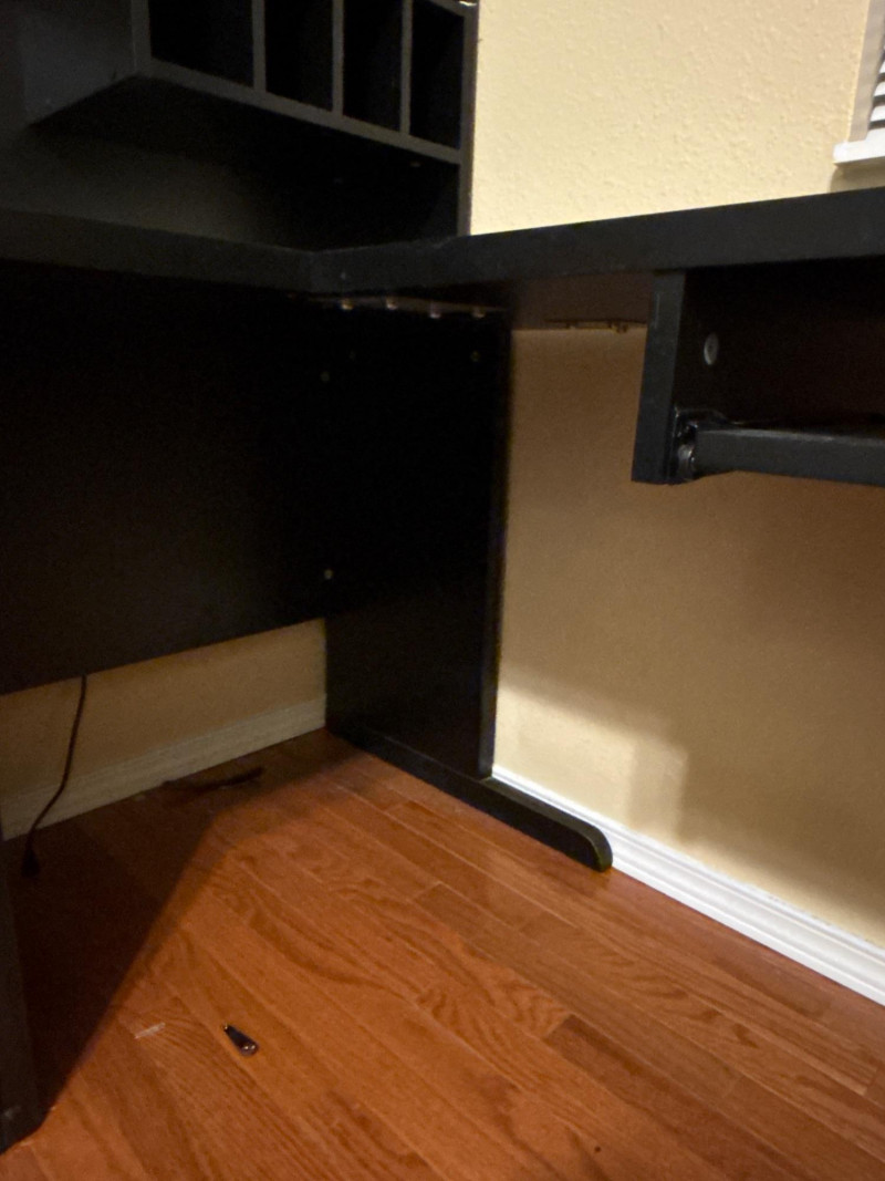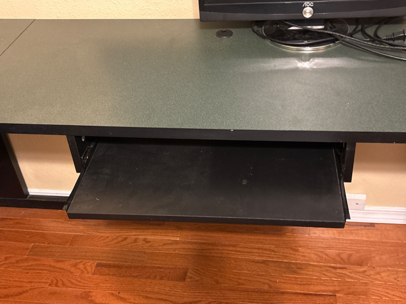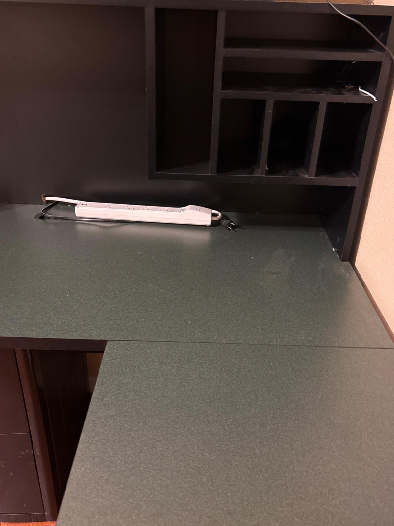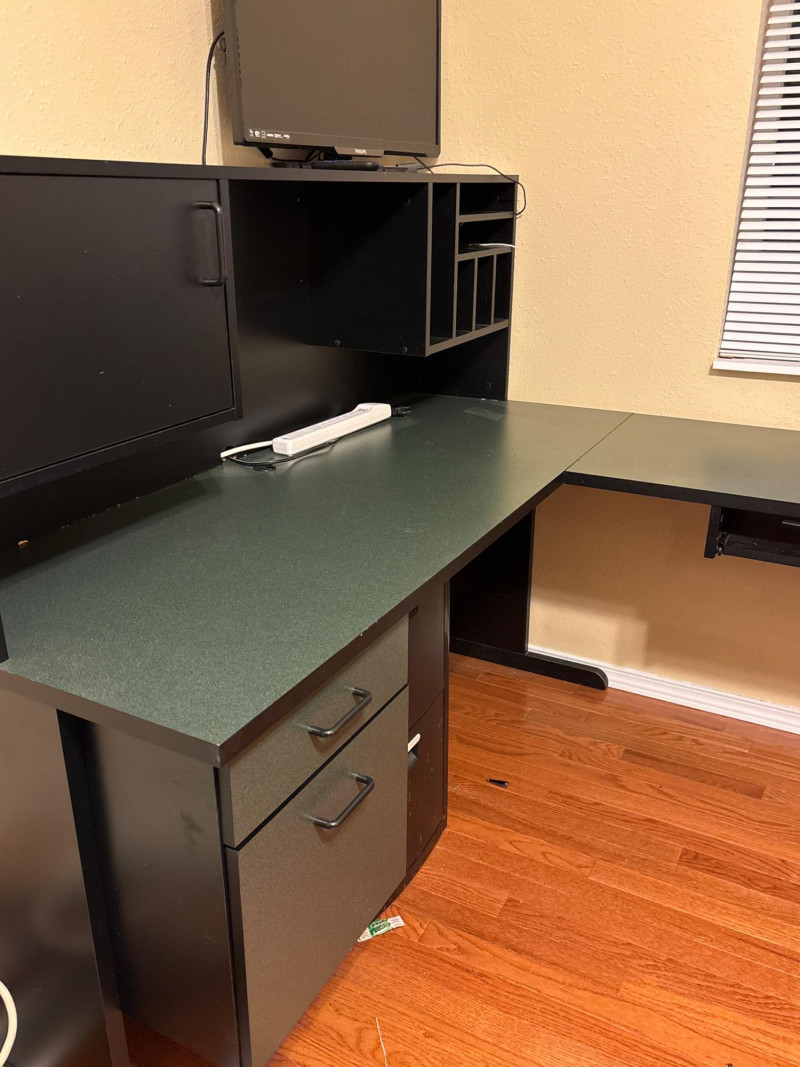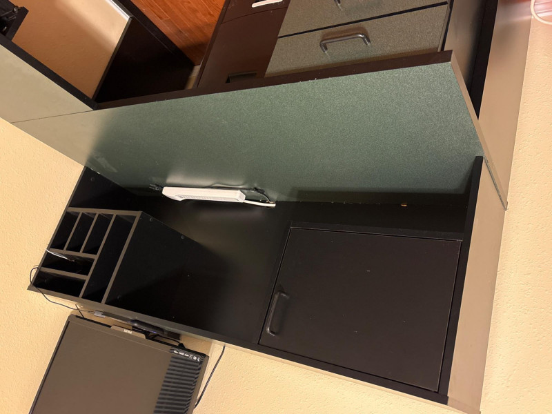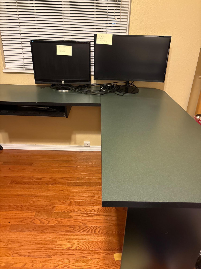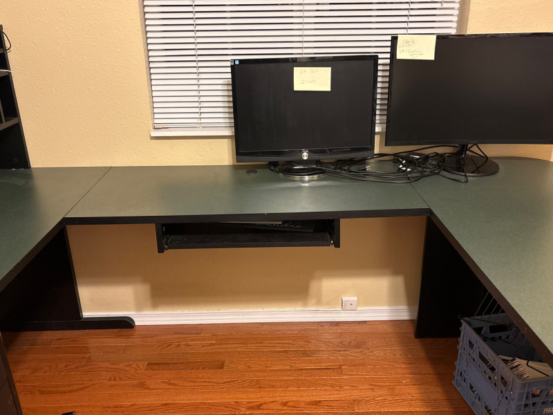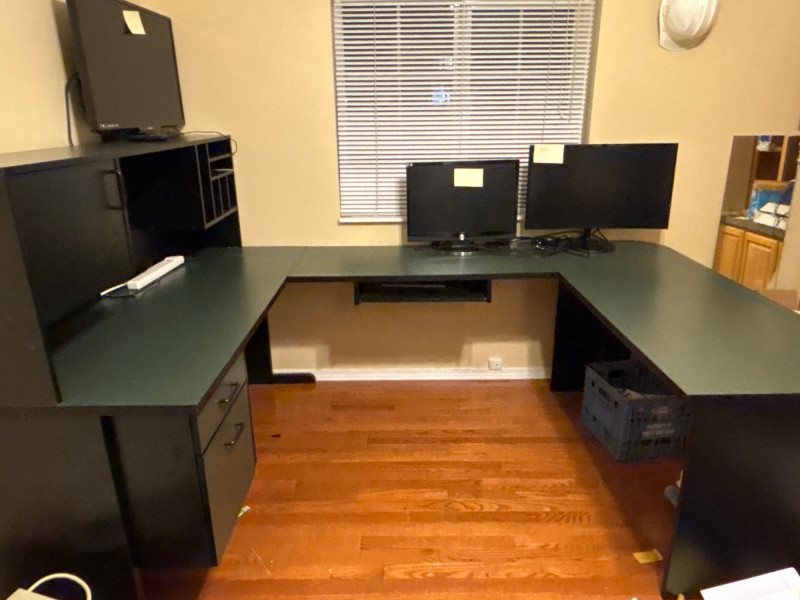 Upgrade your workspace with this large L-shaped desk workstation, designed to provide maximum surface area and functional organization for home or office use. With its spacious layout, this desk is ideal for multitasking, dual-monitor setups, or creating a dedicated and efficient work environment. ✔️ Expansive L-shaped design for optimal workspace Dimensions: The layout allows for multiple work zones, making it easy to separate computer work, paperwork, and storage within one cohesive setup. ⚠️ Desk only—monitors and accessories shown are not included. Good pre-owned condition. May show light wear consistent with normal use. No shipping available for this item.