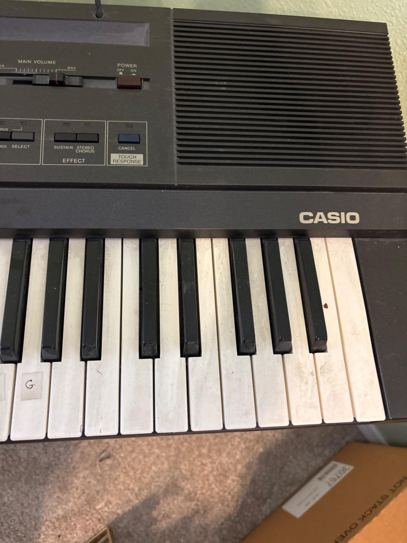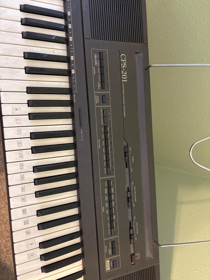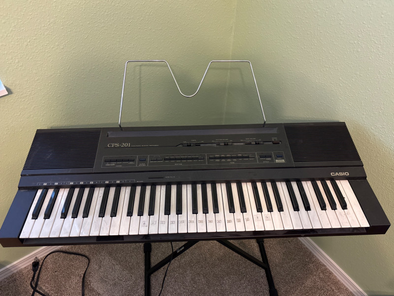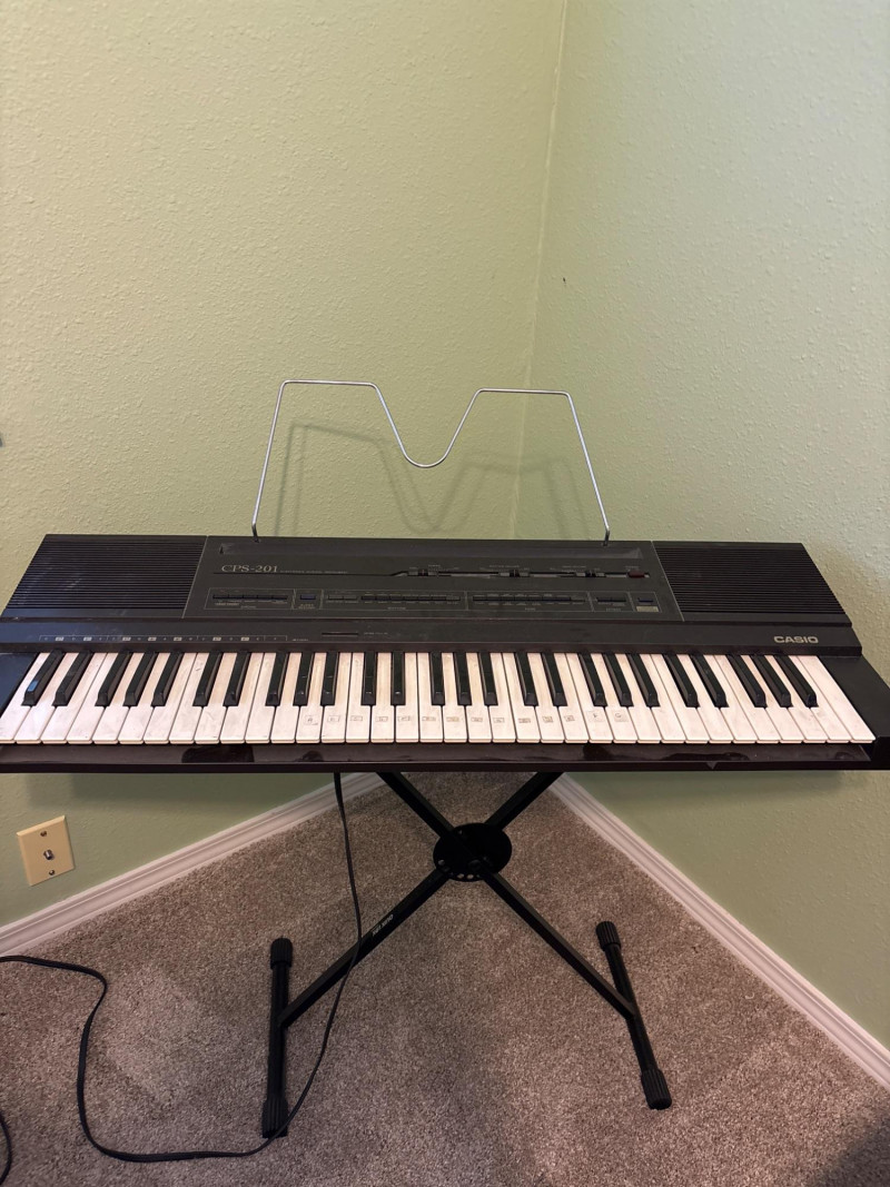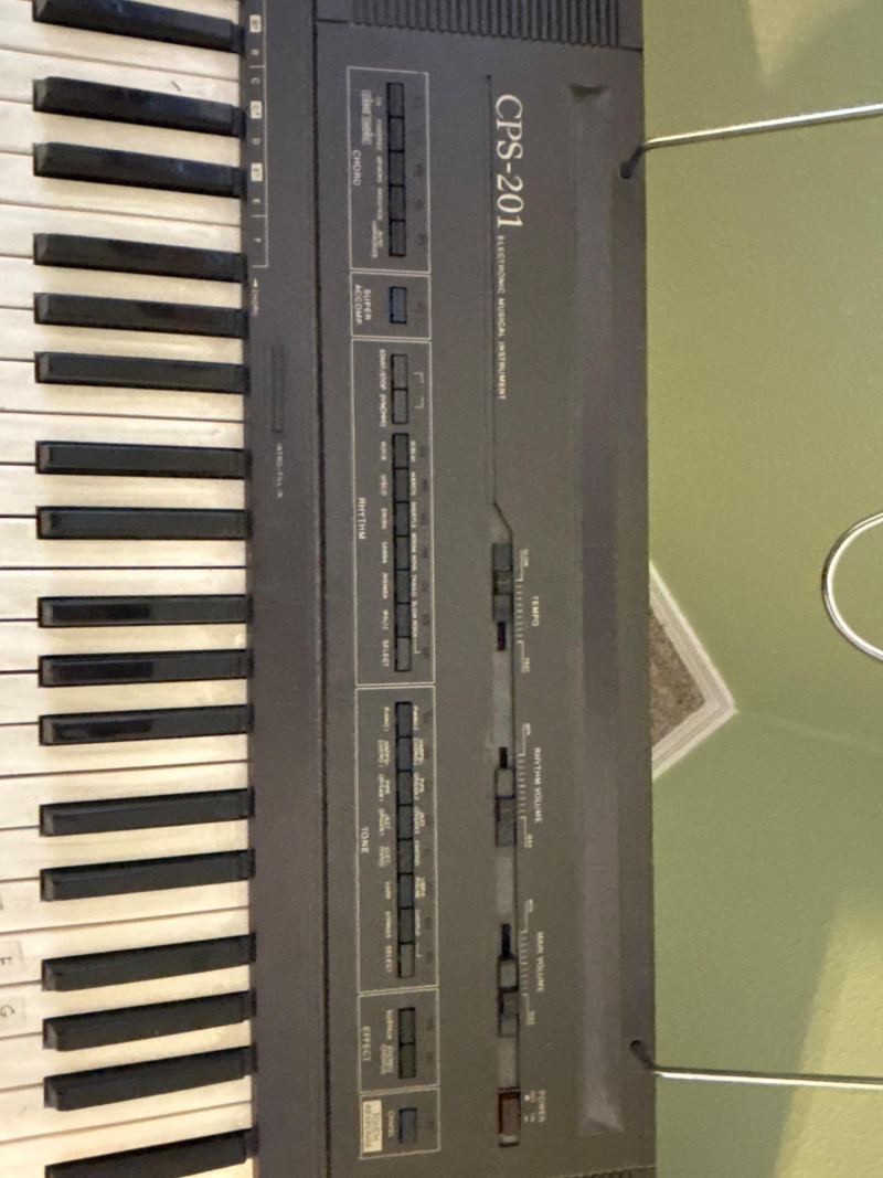 A classic Casio CPS-201 electronic keyboard, a vintage model known for its simple functionality and approachable design—perfect for beginners, casual players, or retro music enthusiasts. This full-size keyboard includes a stand, making it ready for setup in a home, practice space, or studio. ✔️ Casio CPS-201 electronic keyboard Casio keyboards from this era are appreciated for their durability and straightforward controls, making them a solid entry-level instrument or fun addition to a collection. Pre-owned condition. Tested—keyboard powers on and produces sound when played. Shows typical wear consistent with age and use. Stand and accessories included as shown. Please review all photos carefully—pictures are part of the description. No shipping available for this item. Local pickup only. Please bring appropriate help and transport.