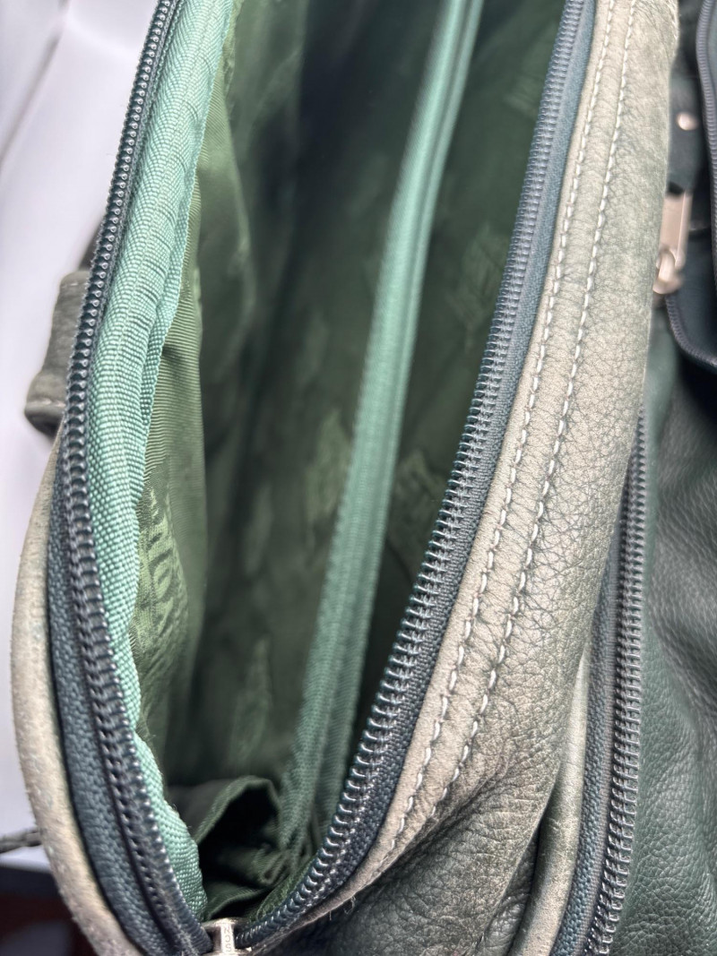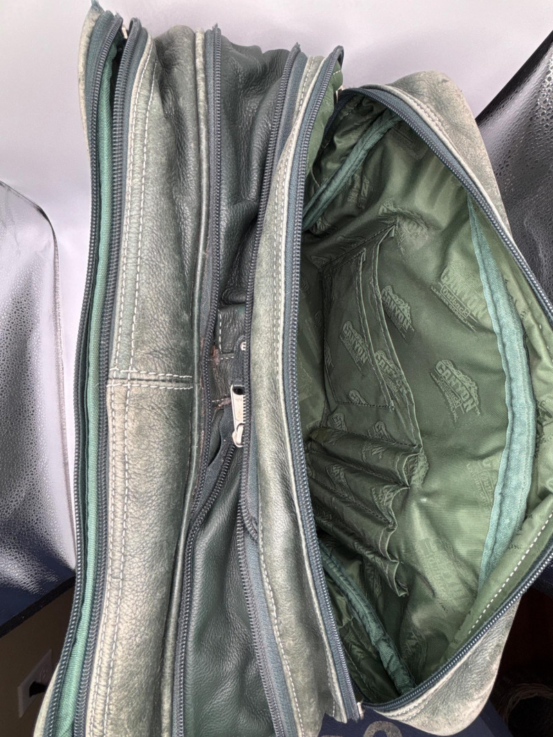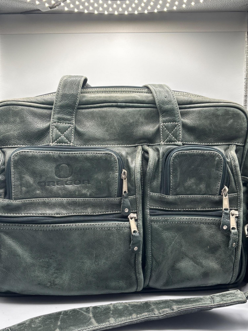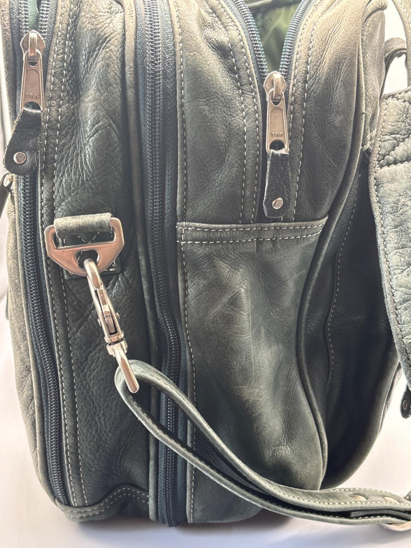 That perfectly broken-in leather look—without the wait. A stylish green leather bag with that sought-after worn, broken-in look that only gets better with time. This piece blends rugged character with everyday functionality, making it perfect for work, travel, or daily use. Featuring multiple zippered compartments and pockets, this bag offers plenty of space to stay organized while keeping everything easily accessible. The soft leather exterior has a naturally distressed finish, giving it a relaxed, vintage vibe that pairs effortlessly with both casual and professional styles. Carry it by hand or use the adjustable shoulder strap for added versatility—this is the kind of bag that looks just as good in the office as it does on the go. Good used condition. Natural wear and patina throughout, consistent with use and part of the desired distressed look. Zippers and hardware appear functional. Please review photos for full details. Shipping available. We are happy to combine shipping on multiple items when possible.