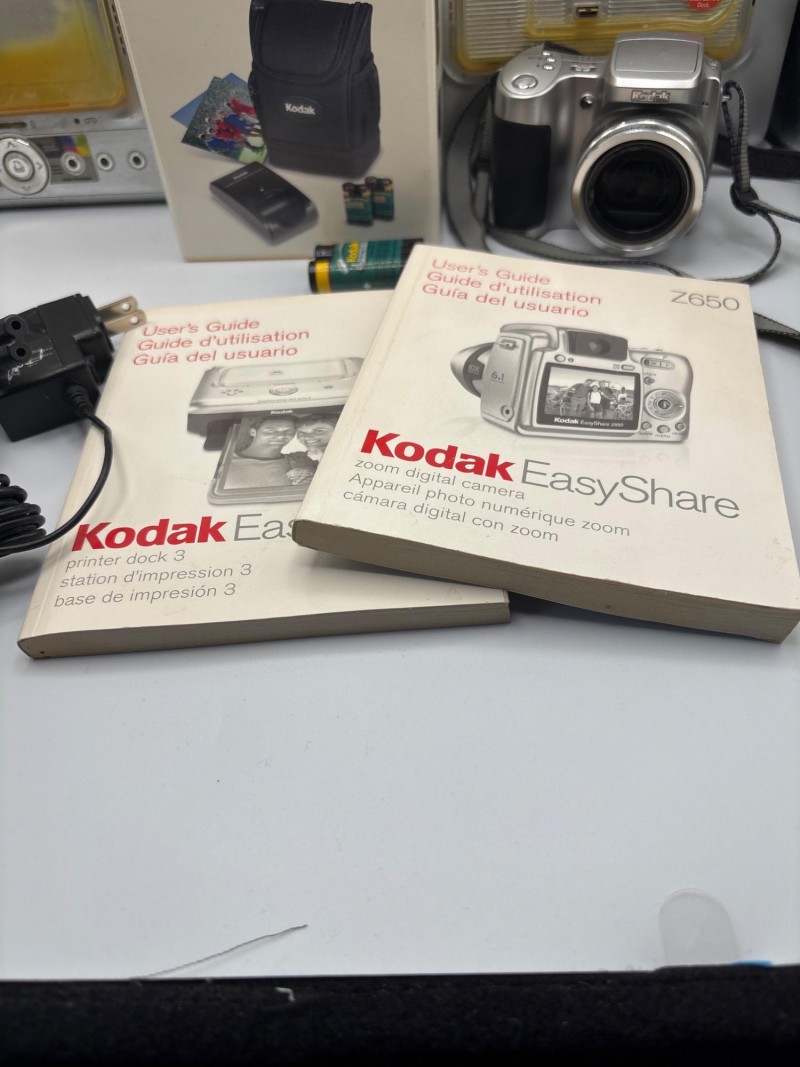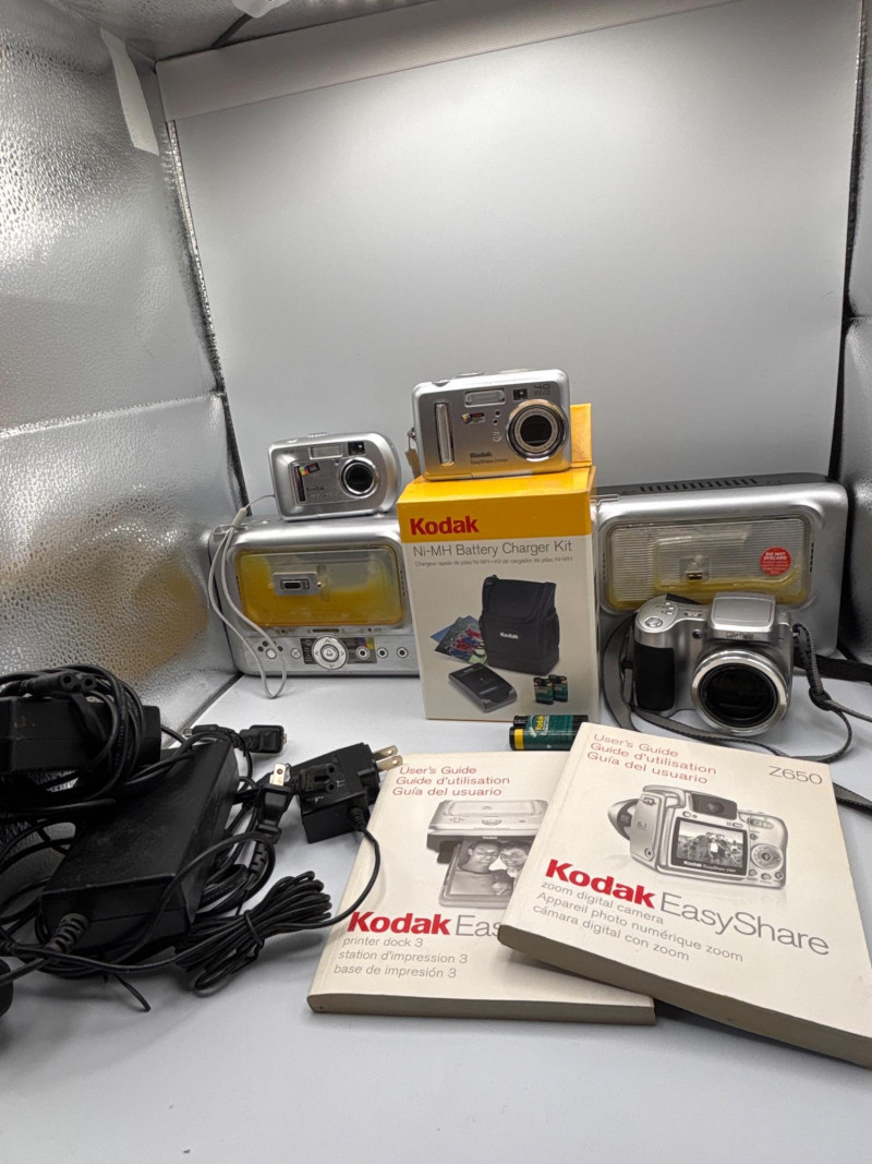 A complete early digital camera setup—perfect for collectors or retro tech lovers. A fun and nostalgic Kodak EasyShare camera bundle featuring multiple digital cameras, accessories, manuals, and charging equipment—all in one lot. This collection captures the early days of digital photography, making it appealing for collectors, resellers, or anyone interested in retro tech. Included are multiple Kodak cameras along with an EasyShare dock system, battery charger kit, cables, and original manuals—offering both display and potential functional value. Whether you're looking to explore vintage digital photography, harvest parts, or resell individually, this is a versatile and interesting lot with plenty of potential. Turned on, but other wise Untested. Items show typical use and storage wear. Functionality unknown. Sold as-is. Please review photos carefully for full contents and condition. Shipping available. We are happy to combine shipping on multiple items when possible.