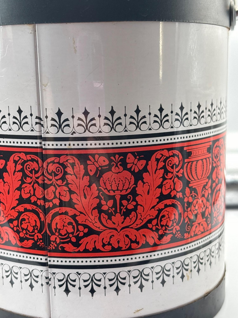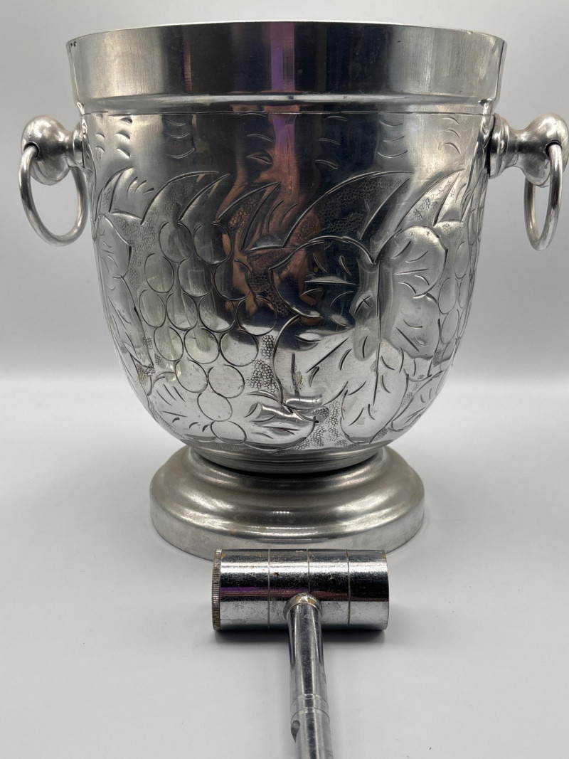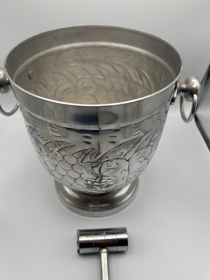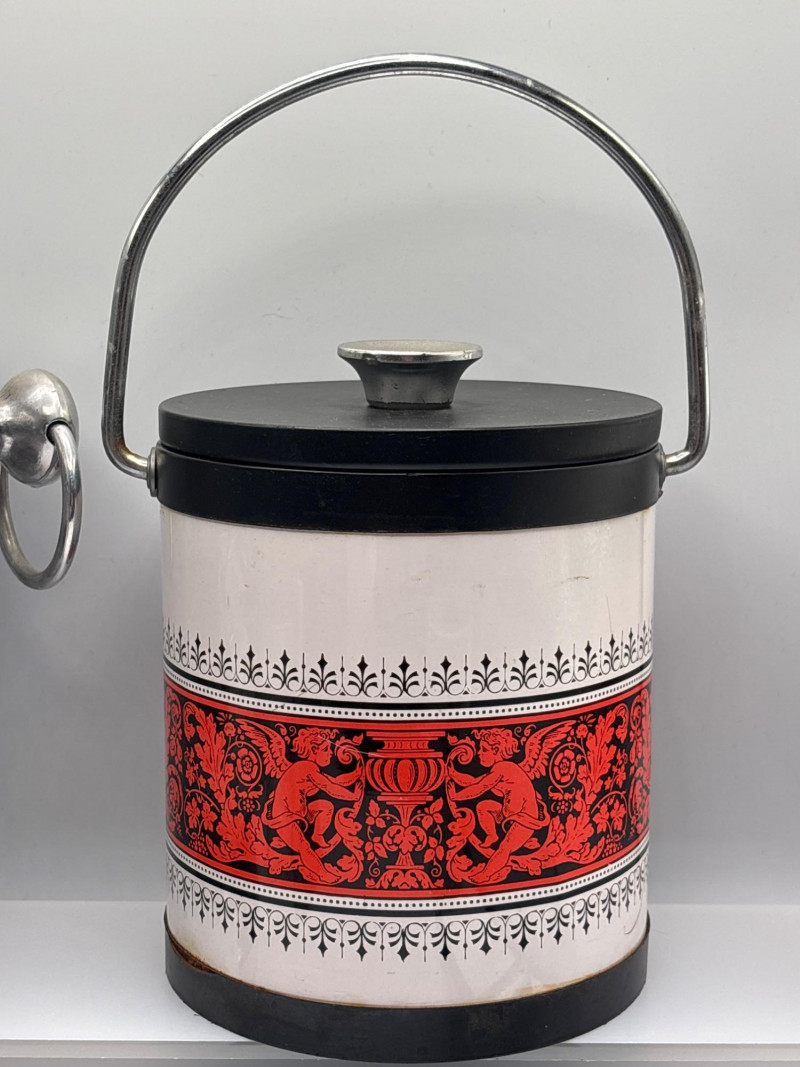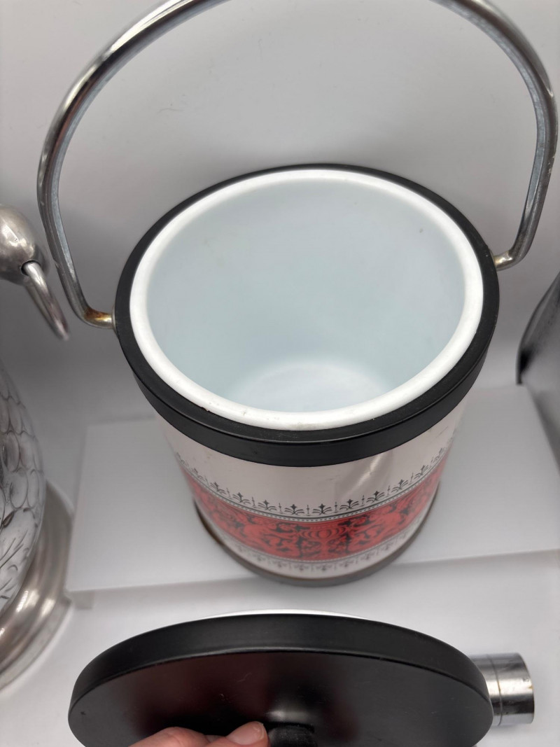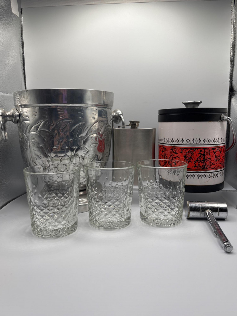 Everything you need to pour, serve, and impress. A stylish mid-century inspired barware collection that brings classic cocktail culture right into your home. This curated set includes everything you need to serve drinks with vintage flair. The standout metal ice bucket features an embossed design and sturdy side handles, perfect for chilling bottles or ice. Paired with three textured rocks glasses, a stainless steel flask, a retro insulated ice bucket with bold red patterning, and a bar tool, this set blends function with timeless style. Whether you're building a home bar, hosting guests, or creating a statement display, this lot delivers both practicality and visual appeal. Good vintage condition with light wear consistent with use. Clean and displays well. Please review photos for full details. Shipping available. We are happy to combine shipping on multiple items when possible.