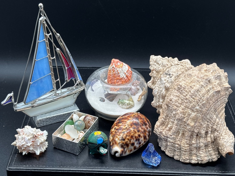 Lot # 83 - Coastal Decor Lot Shells Sailboat Glass Orb Beach Display Set