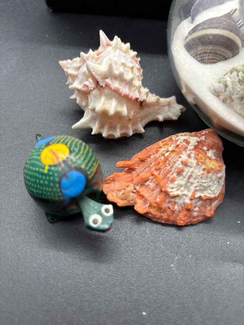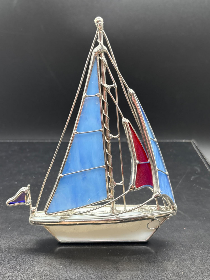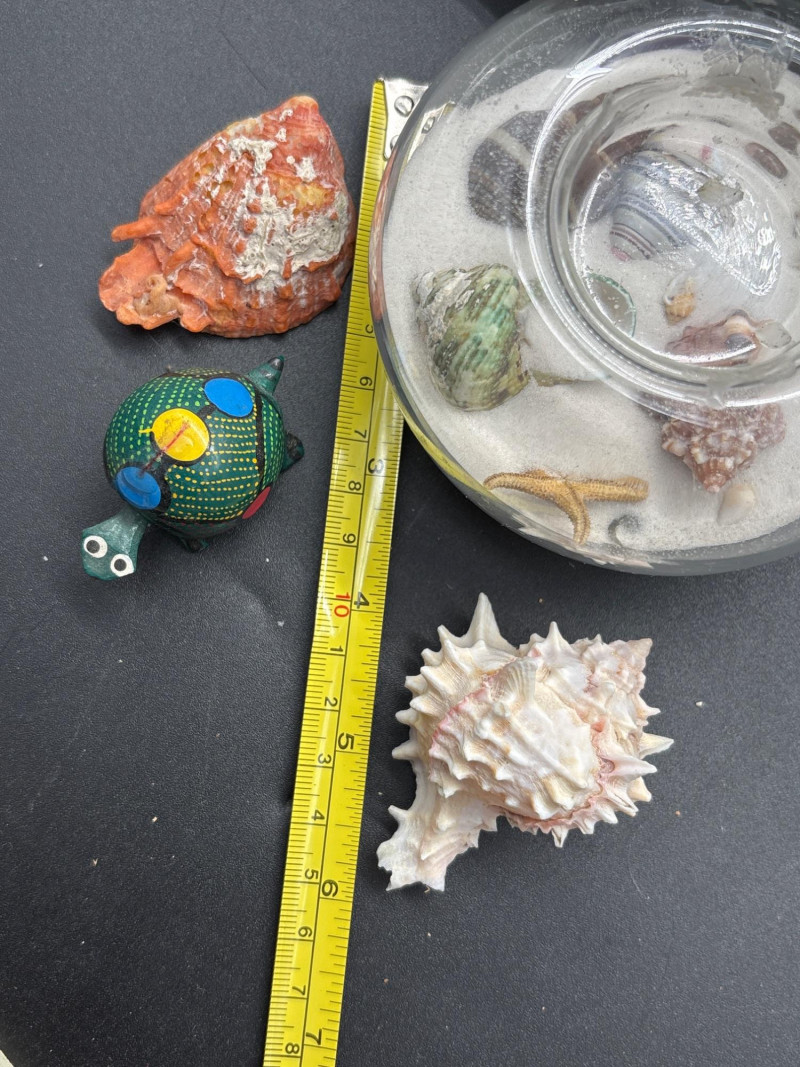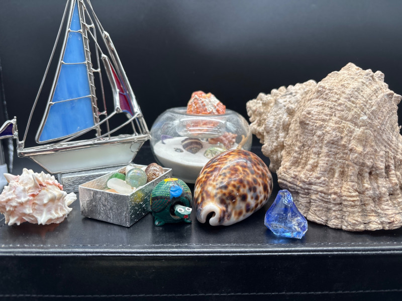 Bring the beach home with this beautiful coastal décor lot, featuring a mix of natural shells, glass accents, and a standout decorative sailboat. The highlight of the lot is a stained glass-style sailboat (~9–10” tall) with vibrant blue and red panels, perfect for catching light and adding a nautical touch to any space. Paired with a curated collection of large natural seashells, including an impressive oversized shell (~10” wide), this set offers instant coastal charm. Also included is a glass orb display filled with sand and shells, a small tray of assorted shells and decorative glass pieces, and additional accent items—ideal for shelf styling, beach homes, or themed décor. Pre-owned with light wear consistent with display use. No major damage noted. Natural shells may show organic variation. Sold as-is—photos are part of the description. No – Local pickup only.