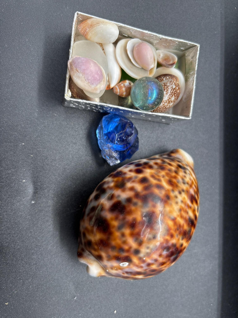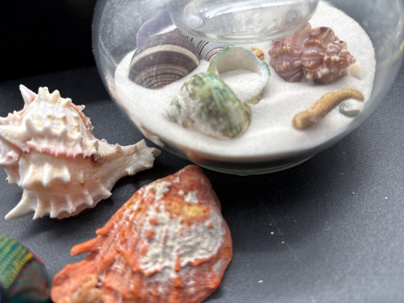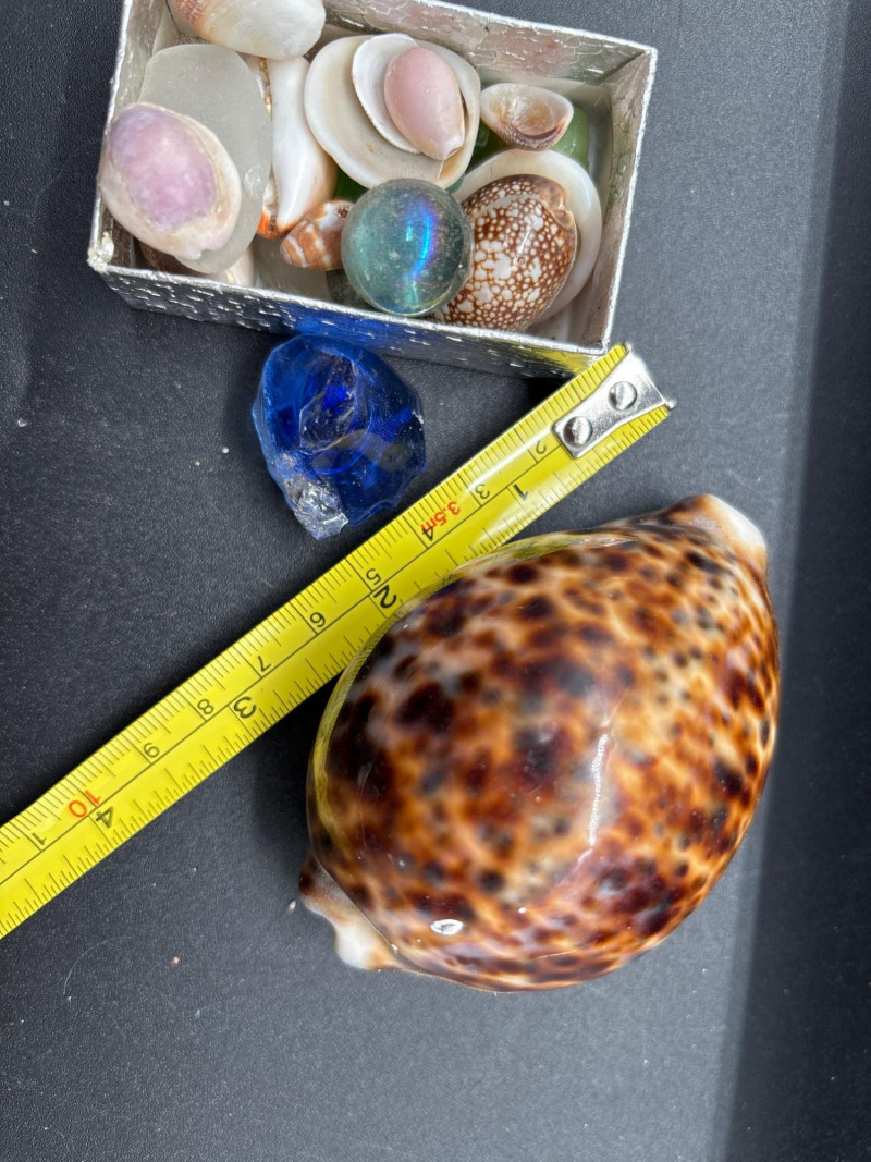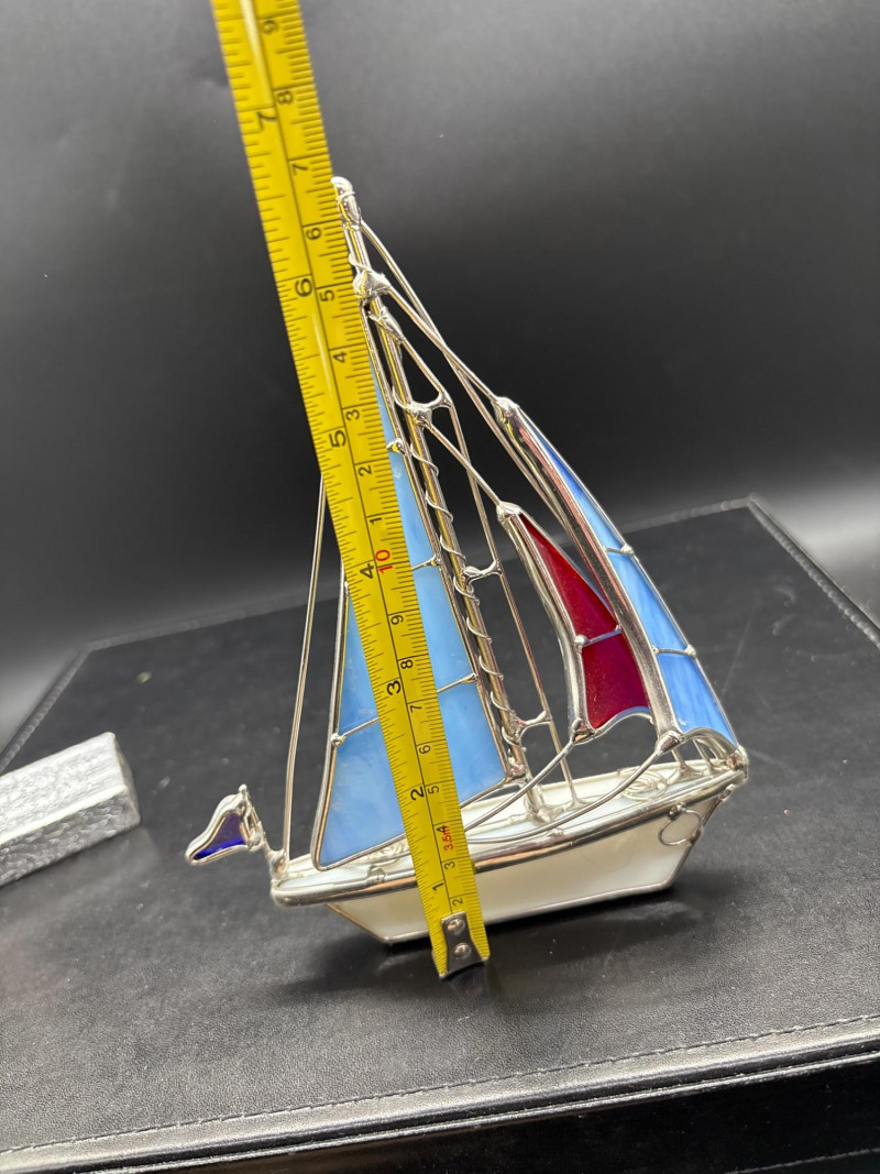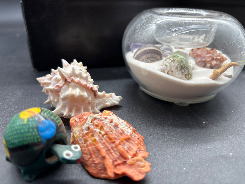 Bring the beach home with this beautiful coastal décor lot, featuring a mix of natural shells, glass accents, and a standout decorative sailboat. The highlight of the lot is a stained glass-style sailboat (~9–10” tall) with vibrant blue and red panels, perfect for catching light and adding a nautical touch to any space. Paired with a curated collection of large natural seashells, including an impressive oversized shell (~10” wide), this set offers instant coastal charm. Also included is a glass orb display filled with sand and shells, a small tray of assorted shells and decorative glass pieces, and additional accent items—ideal for shelf styling, beach homes, or themed décor. Pre-owned with light wear consistent with display use. No major damage noted. Natural shells may show organic variation. Sold as-is—photos are part of the description. No – Local pickup only.
