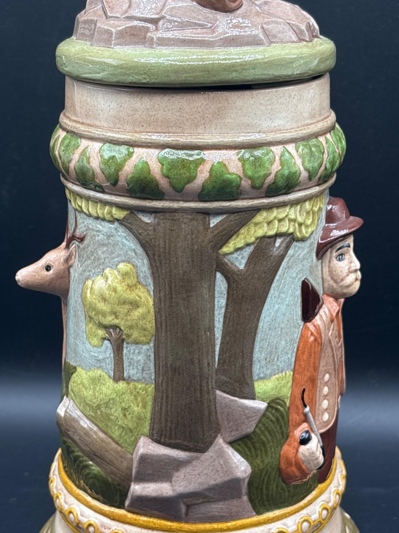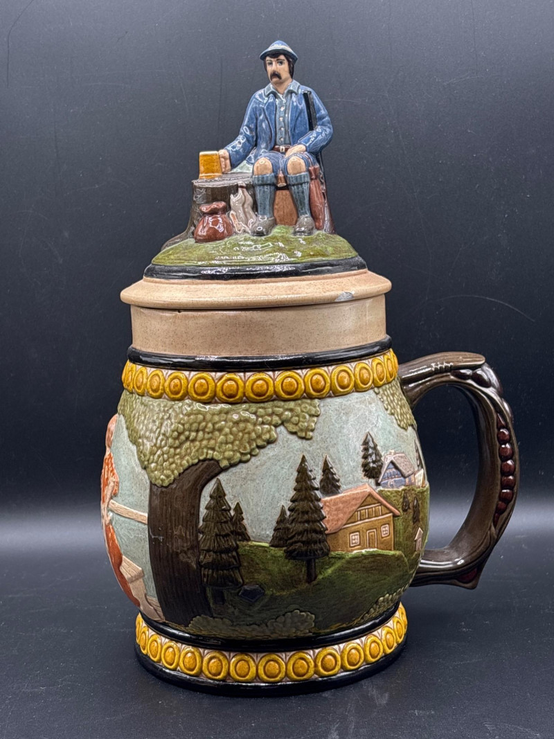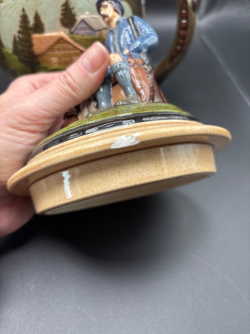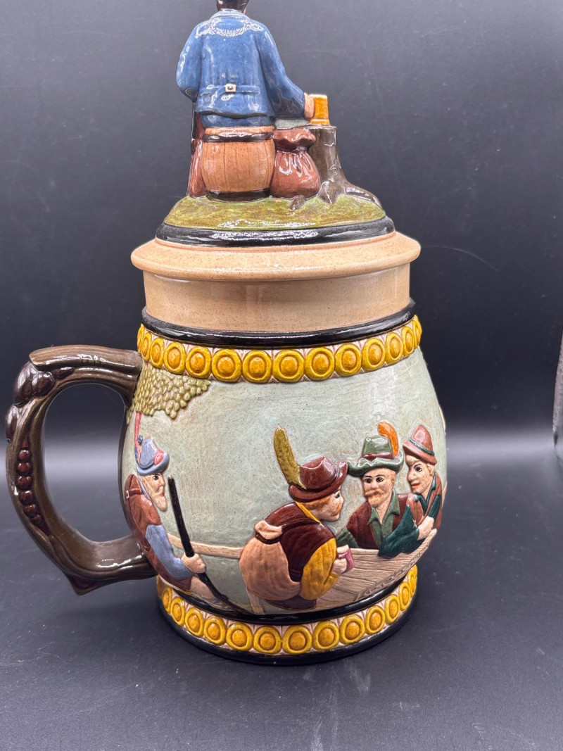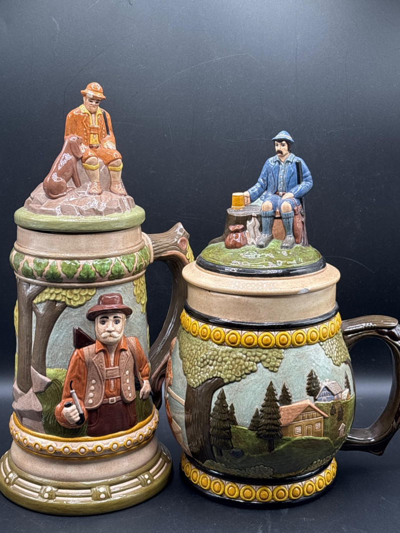 Character, craftsmanship, and classic beer hall charm. A unique pair of vintage figural beer steins featuring detailed raised scenes and character lids, perfect for collectors or display. One stein is hand-marked on the base “Ruby Teter 1987,” adding a personal and dated touch. Both pieces showcase classic European-style design with scenic relief work, textured details, and hinged lids topped with seated figures. These have great display presence and a nostalgic, old-world feel—ideal for a shelf, bar décor, or collection. Both steins show chips consistent with age and use. One lid has a larger, more noticeable chip. Overall still display well. Please review photos carefully for condition details. Sold as-is. Shipping available. We are happy to combine shipping on multiple items when possible.