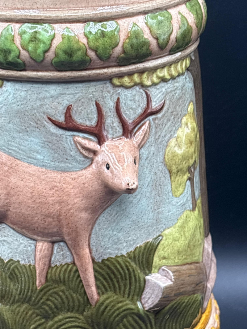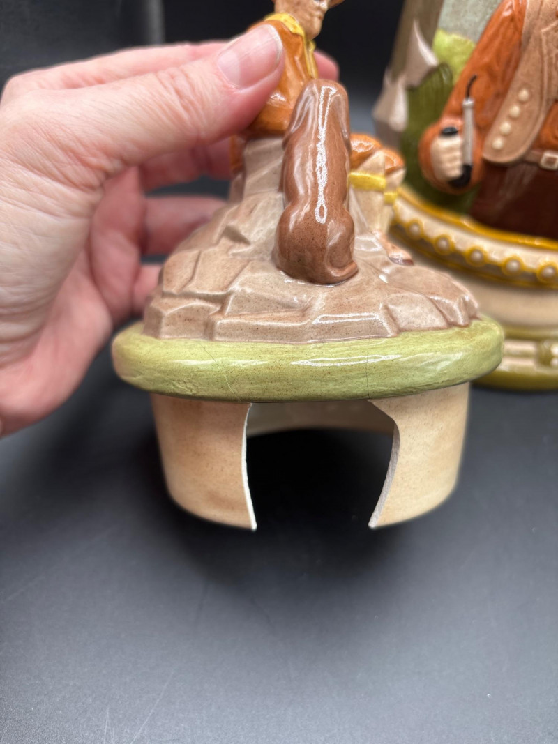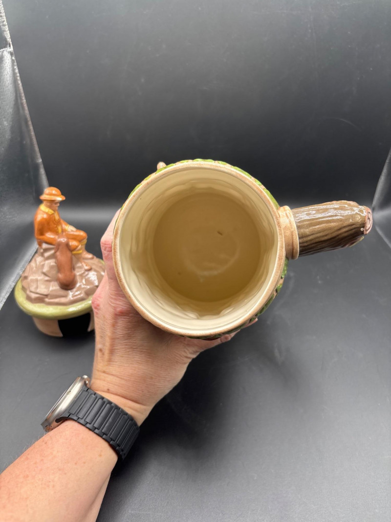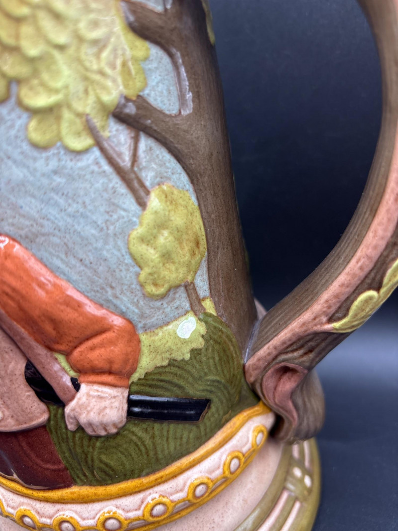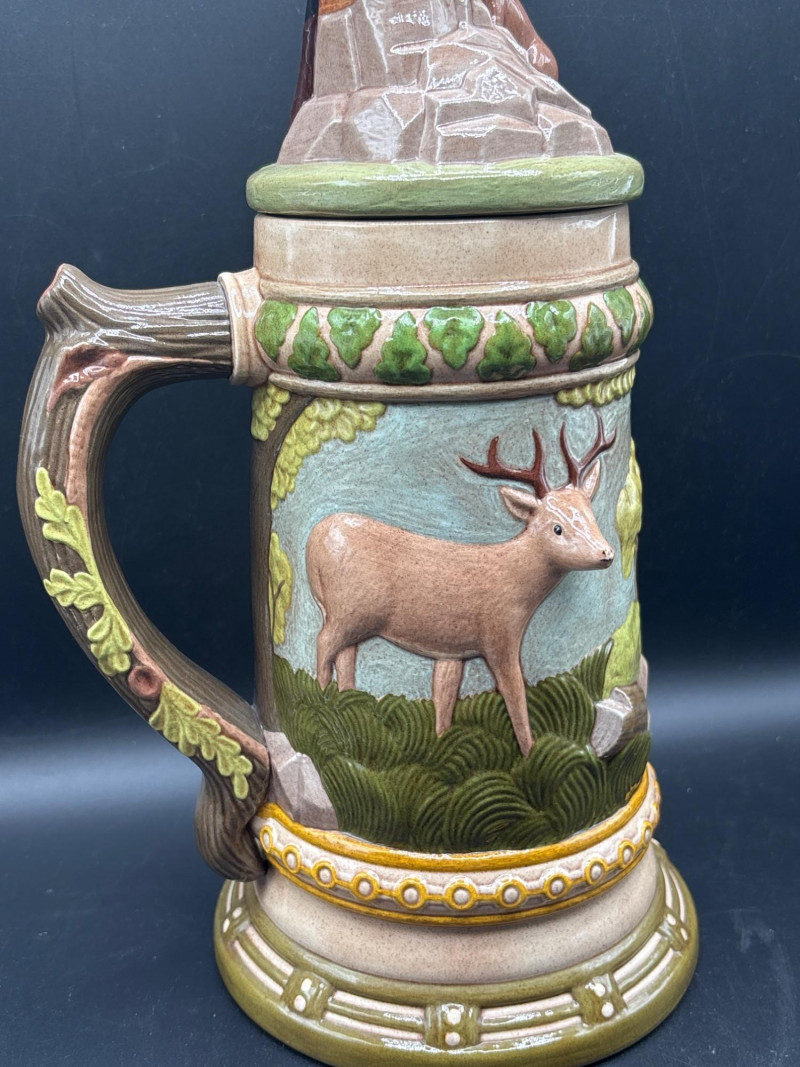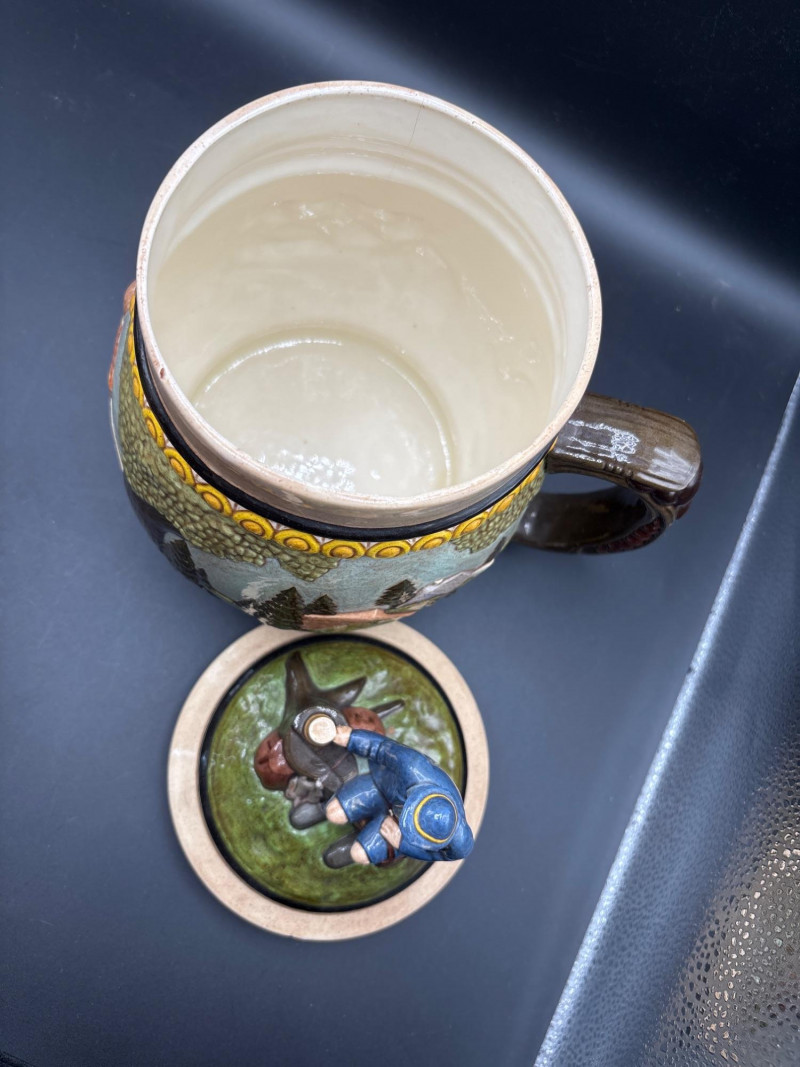 Character, craftsmanship, and classic beer hall charm. A unique pair of vintage figural beer steins featuring detailed raised scenes and character lids, perfect for collectors or display. One stein is hand-marked on the base “Ruby Teter 1987,” adding a personal and dated touch. Both pieces showcase classic European-style design with scenic relief work, textured details, and hinged lids topped with seated figures. These have great display presence and a nostalgic, old-world feel—ideal for a shelf, bar décor, or collection. Both steins show chips consistent with age and use. One lid has a larger, more noticeable chip. Overall still display well. Please review photos carefully for condition details. Sold as-is. Shipping available. We are happy to combine shipping on multiple items when possible.