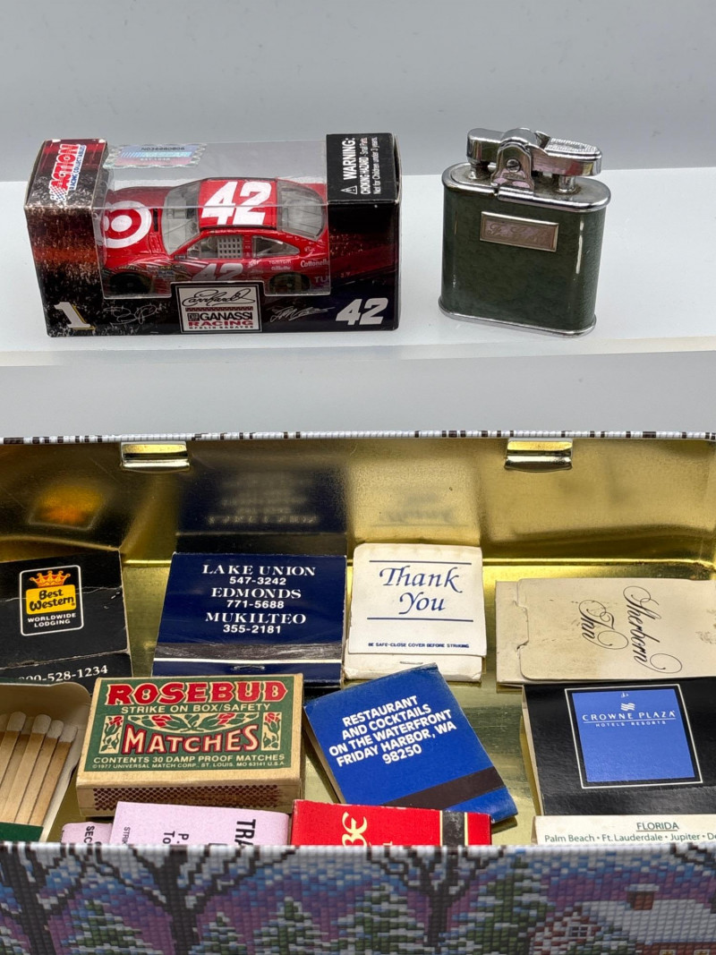 Lot # 91 - Vintage Matchbook Lot + Lighter, Tin & Diecast Car Bundle