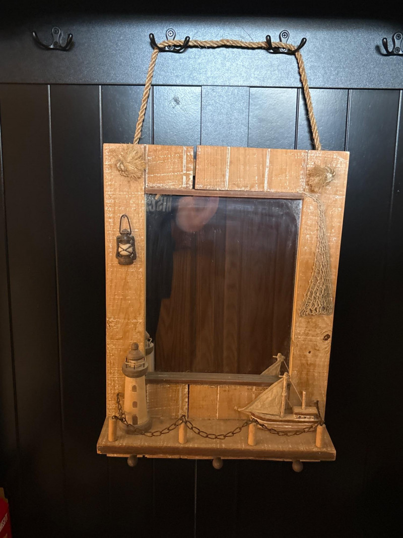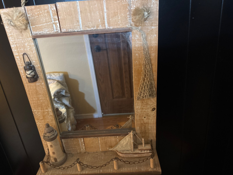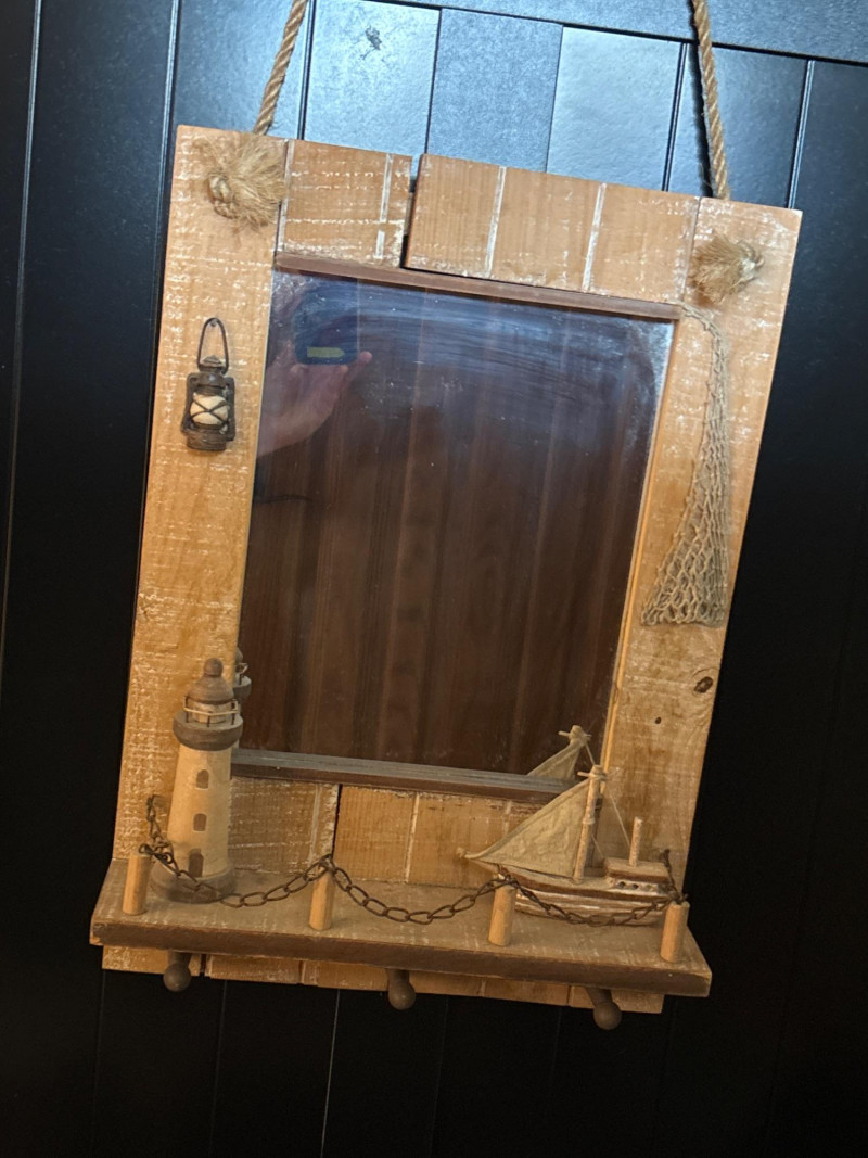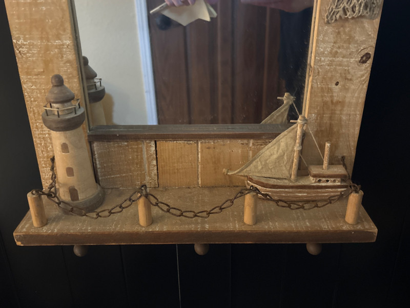 Bring coastal charm to any space. Charming nautical-themed wall mirror featuring a rustic wood frame with coastal accents, including a lighthouse, sailboat, netting, and lantern details. The design captures a seaside aesthetic, making it a great addition to beach homes, cabins, or anyone who loves maritime décor. The built-in shelf adds both visual interest and functionality—perfect for displaying small items or adding decorative touches. The rope hanger completes the look and makes it easy to display. A great statement piece for entryways, bathrooms, or themed rooms. Good overall condition with light wear consistent with use. Minor cosmetic wear adds to the rustic charm. Mirror surface shows typical signs of age. Sold as-is. Please review photos for details. Shipping available. We are happy to combine shipping on multiple items when possible.