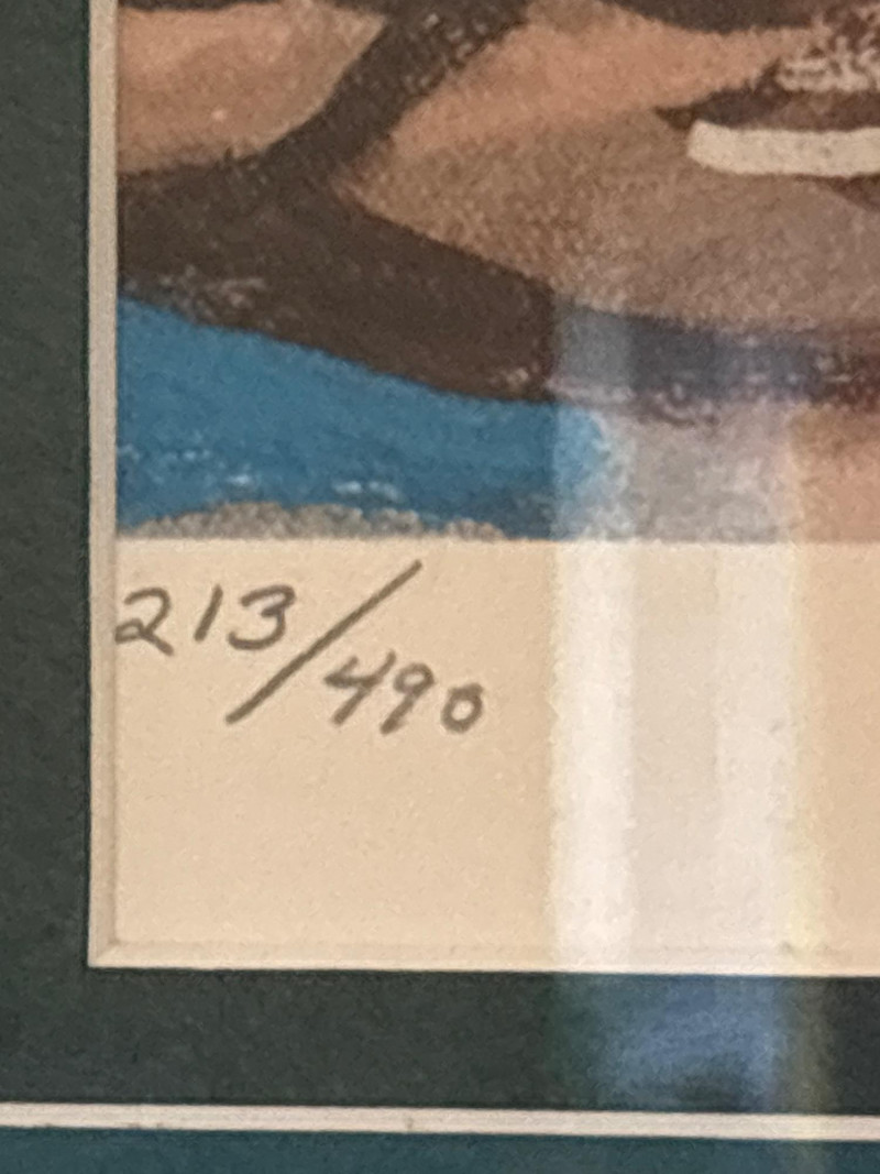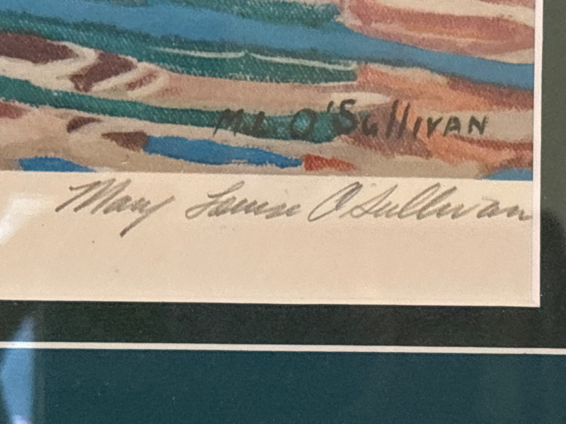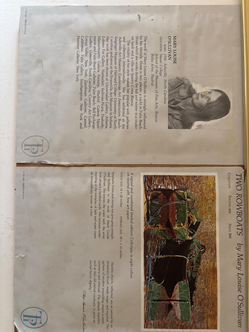 Signed, numbered, and ready to display. Beautiful framed limited edition print titled “Two Rowboats” by listed artist Mary Louise O’Sullivan. This colorful coastal scene features weathered rowboats resting on the water, rendered in rich, textured tones that bring warmth and movement to the piece. The print is hand-signed by the artist and numbered 213/490, making it a desirable limited edition work. O’Sullivan’s work has been exhibited internationally and is known for its expressive color and coastal themes. Professionally framed and ready to hang, this piece makes a striking addition to any home, office, or coastal-inspired space. Good overall condition. Frame and glass show light wear consistent with age. Paper backing shows some discoloration. Print presents well. Sold as-is. Please review photos for details. Shipping available. We are happy to combine shipping on multiple items when possible.
