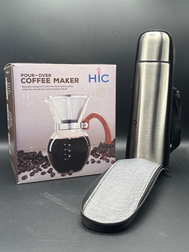 Brew it fresh, take it anywhere. A practical and stylish coffee bundle featuring a pour-over coffee maker and a stainless steel thermos—perfect for coffee lovers at home or on the go. The HIC pour-over coffee maker allows for a clean, rich brew using the classic manual method, while the stainless thermos keeps your coffee hot for hours. Ideal for morning routines, travel, camping, or office use. A great set for anyone who enjoys quality coffee without the fuss. Good condition. Items appear lightly used. Box shows minor wear. Thermos and accessories show light signs of use. Sold as-is. Please review photos for details. Shipping available. We are happy to combine shipping on multiple items when possible.