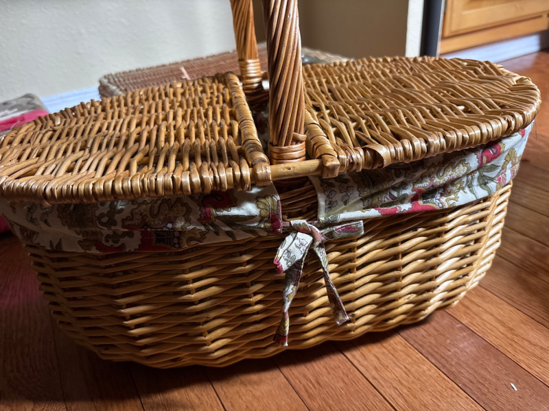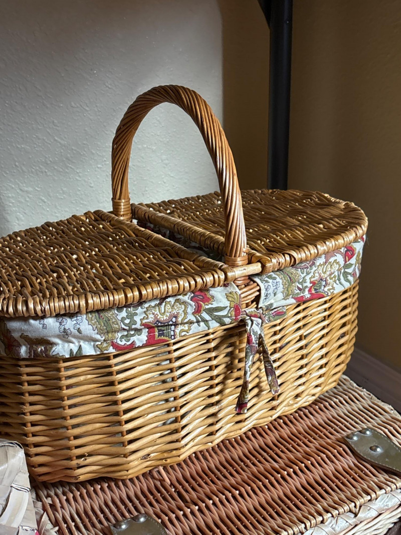 Charming, ready-for-adventure picnic set—just grab and go! 🌿 This beautiful 3-piece wicker lot includes a classic picnic basket with handle, a vintage-style suitcase basket, and a woven picnic blanket wrapped with a decorative floral tie. The lined basket adds a cozy, traditional touch, while the suitcase-style basket offers both storage and display appeal. ✔️ 1 handled wicker picnic basket with fabric lining Perfect for outdoor outings, Airbnb styling, event staging, or simply adding a warm cottage-core look to your space. Good pre-owned condition. Light wear consistent with use. No major damage noted. Please review photos carefully—pictures are part of the description. Shipping available. Combined shipping offered when possible.