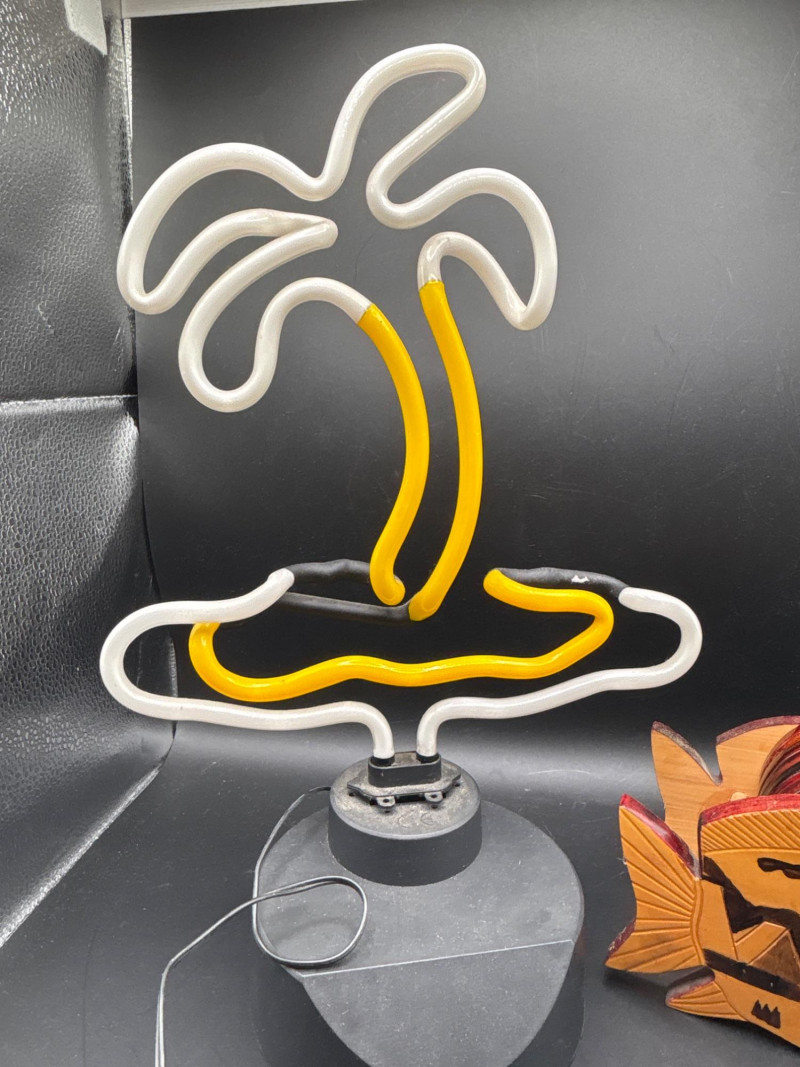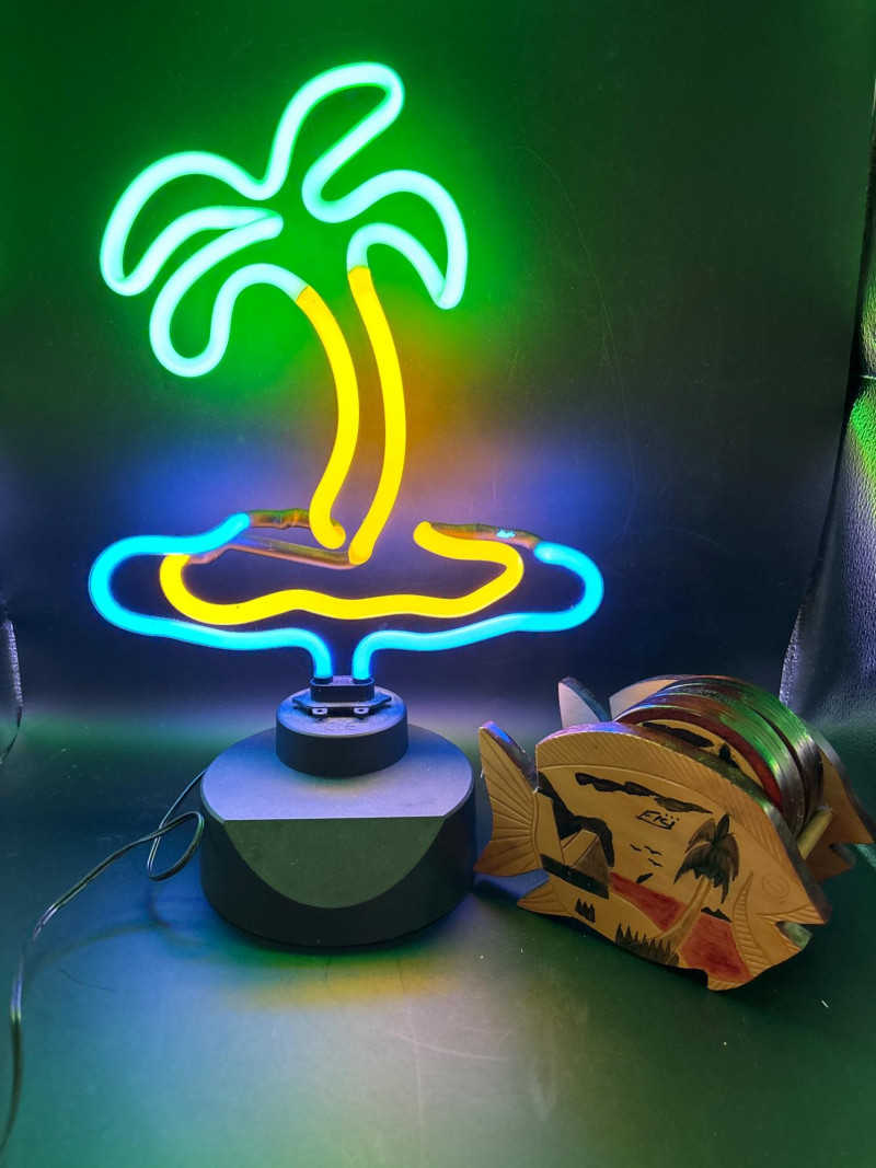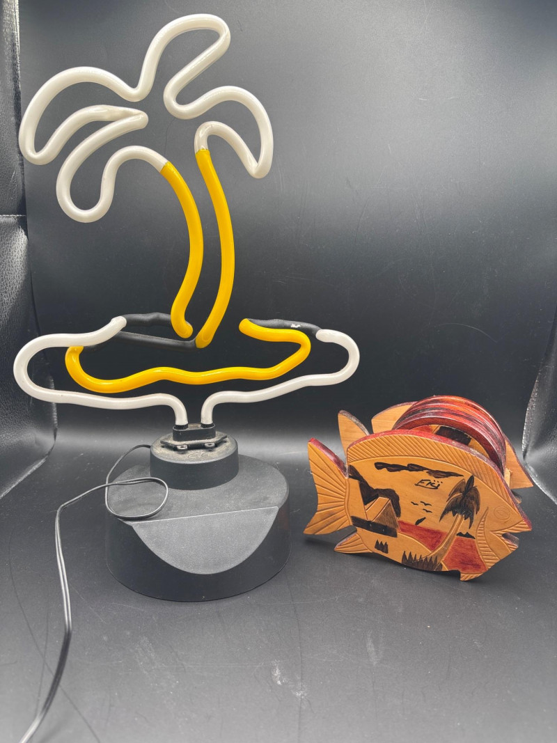 Lot # 108 - Neon Palm Tree Light w Fish Coaster Holder Tropical Decor Lot