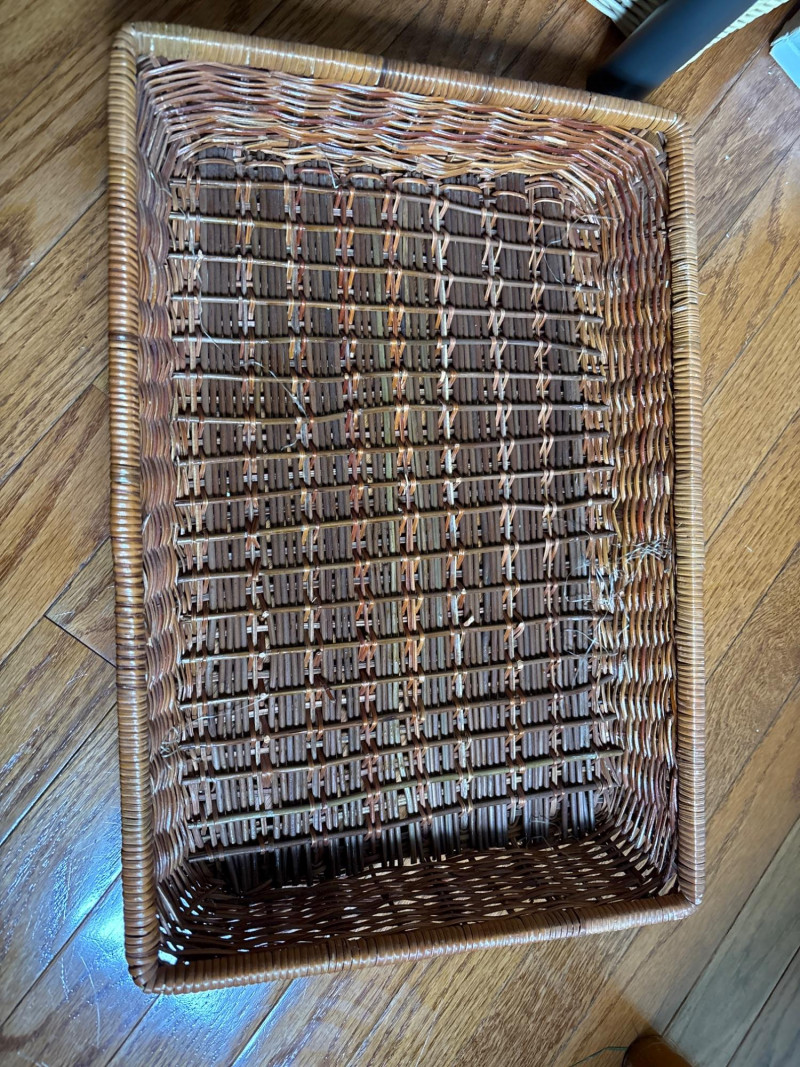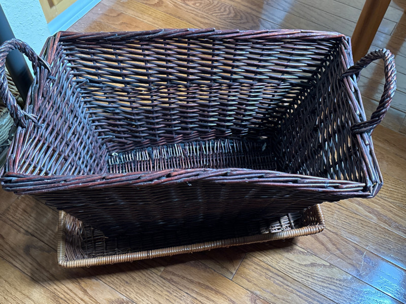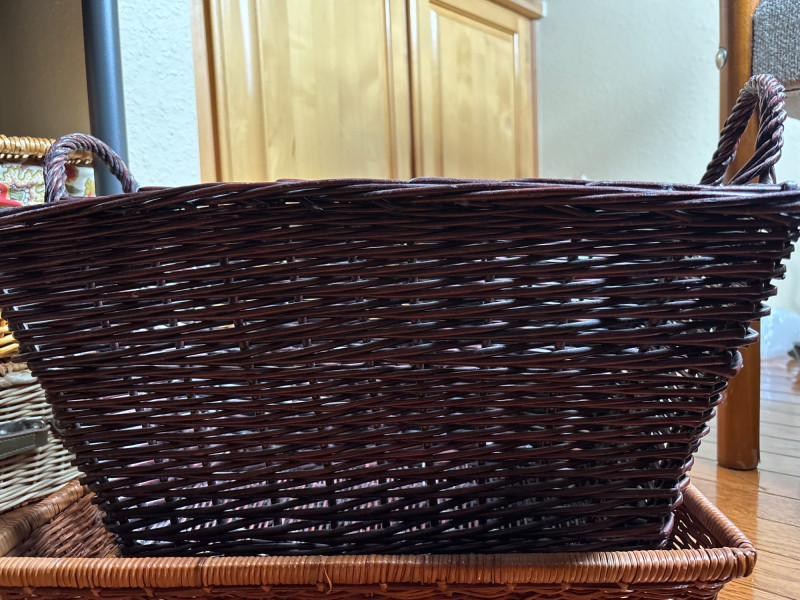 Classic, functional, and ready to organize—this 2-piece wicker basket set features a rich dark stain and versatile nesting style design. These rectangular baskets are perfect for storage, serving, or display, offering both style and practicality for any space. ✔️ Set of 2 matching wicker baskets Approximate Measurements: Ideal for use in kitchens, living rooms, offices, or as decorative storage in a farmhouse or rustic setting. Pre-owned condition with light wear consistent with use. No major damage noted. Please review photos carefully—pictures are part of the description. Shipping available. Combined shipping offered when possible.
