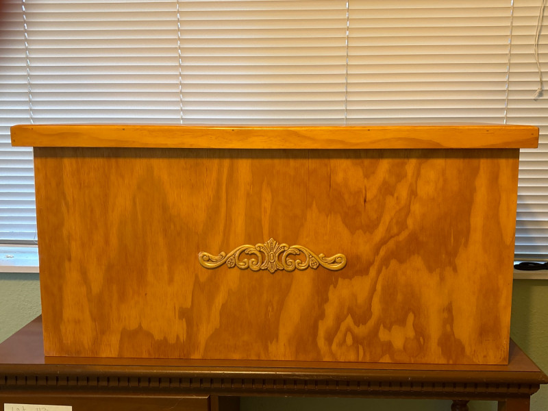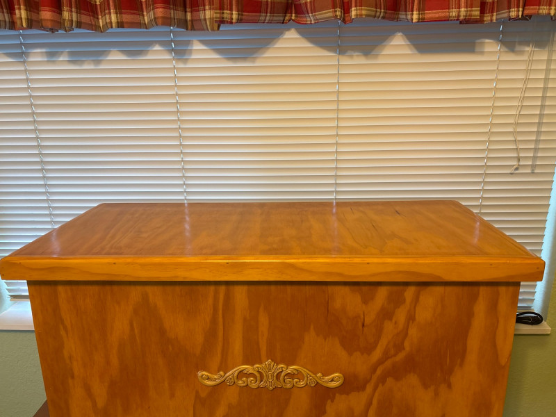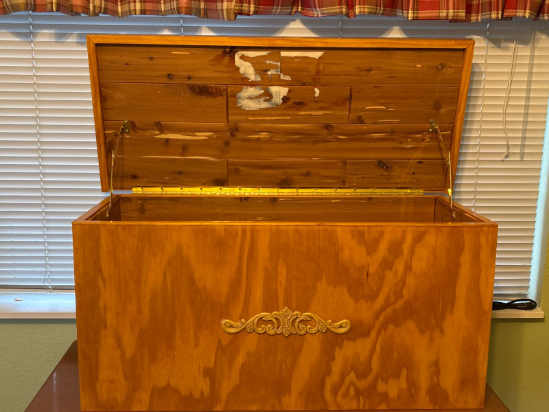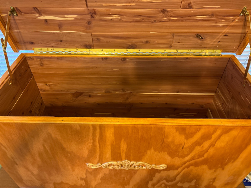 Naturally fresh, beautifully crafted—protect what matters in style. Bring both function and charm to your space with this beautifully crafted cedar-lined blanket chest. Designed to safely store linens, blankets, seasonal clothing, or keepsakes, the natural cedar interior helps protect contents while adding that signature fresh cedar scent buyers love. The warm wood exterior features a classic, clean design with a decorative front accent, making it a versatile piece that works equally well at the foot of a bed, in a living room, or entryway. The hinged lid opens smoothly to reveal a spacious interior, perfect for organized storage with timeless appeal. Fully cedar lined interior – ideal for protecting fabrics and keepsakes. Approximate Measurements: Good condition overall. Solid and functional with light wear consistent with use. Interior is clean and retains cedar lining. Please review photos for full details. No shipping available for this item. Local pickup only.