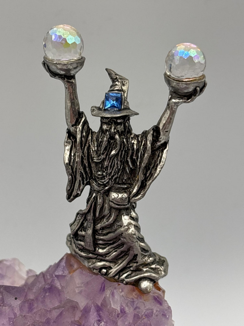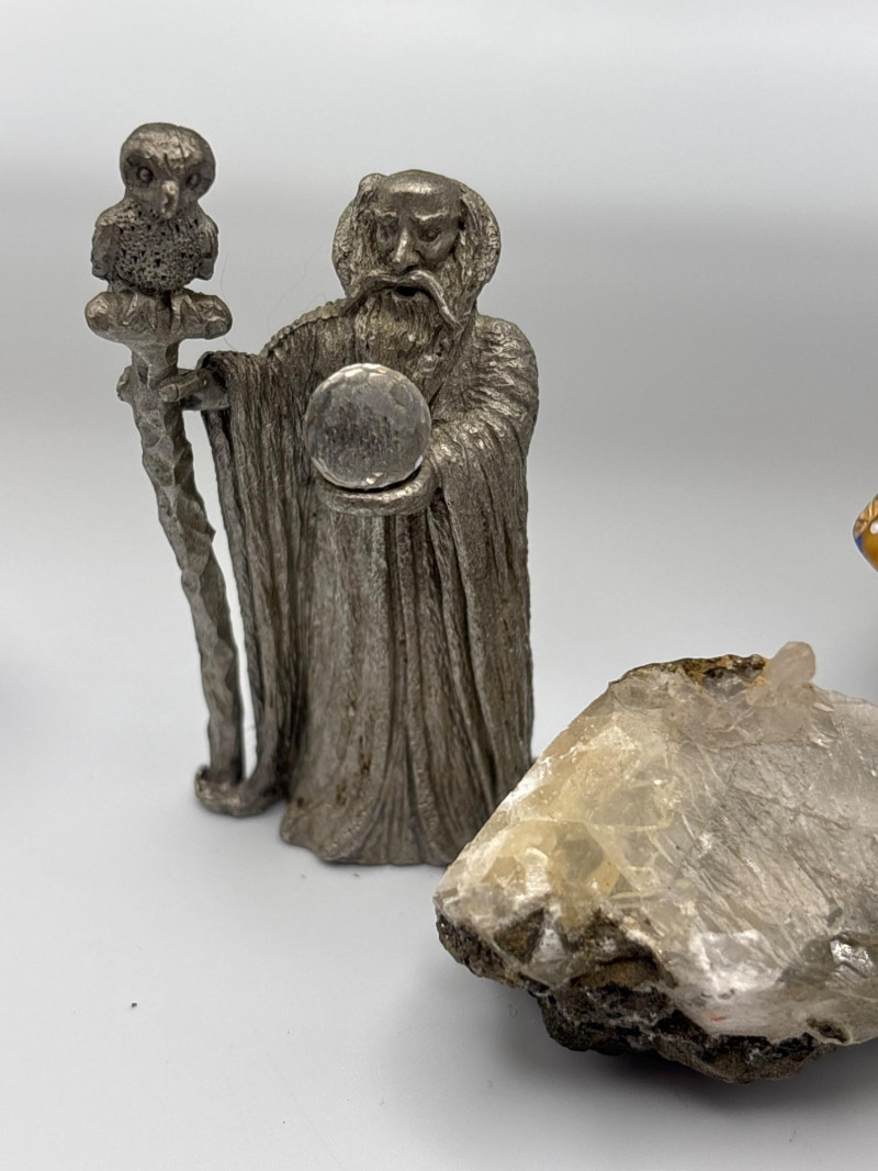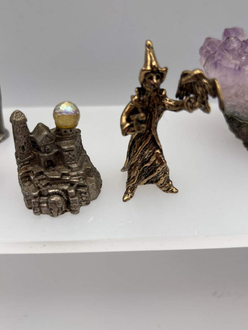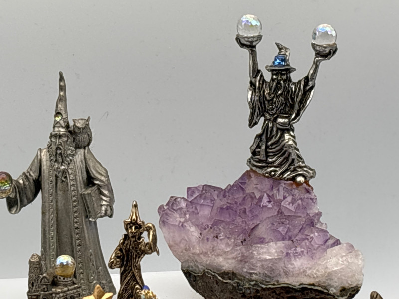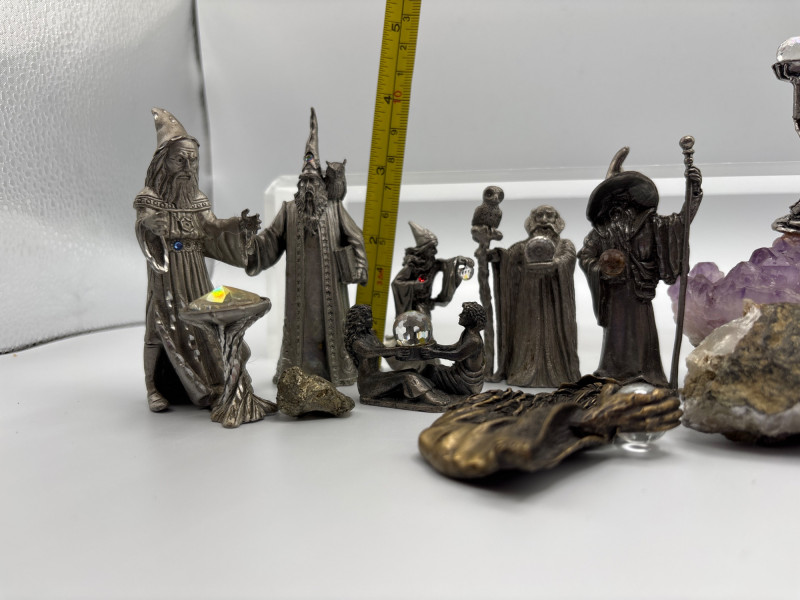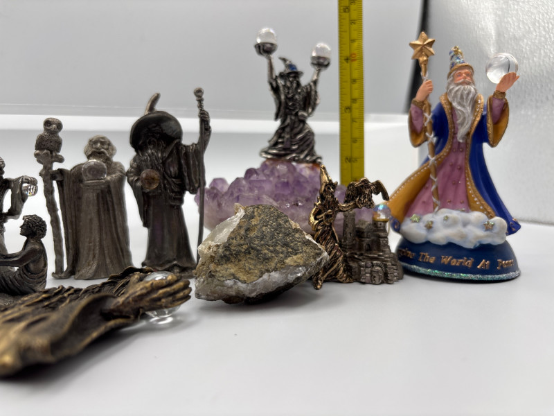 A magical collection ready to cast charm into any space. Step into a world of fantasy with this unique collection of wizard figurines, mystical accents, and natural crystal pieces. This eclectic lot features multiple wizard figures in varying styles—from detailed metallic finishes to colorful, character-rich designs—alongside crystal specimens including a striking amethyst cluster and natural stone pieces. Perfect for collectors, fantasy enthusiasts, or anyone looking to add a touch of magic to their décor, this set displays beautifully on shelves, desks, or in themed spaces. The mix of textures, finishes, and materials creates a visually interesting and conversation-starting display. Whether you’re building a wizard-themed collection or looking for standout decorative accents, this lot offers great variety and character. Approximate Size Range: Good overall condition with light wear consistent with display and age. No major damage noted. Please review photos for full condition details. Shipping available. We are happy to combine shipping on multiple items when possible.