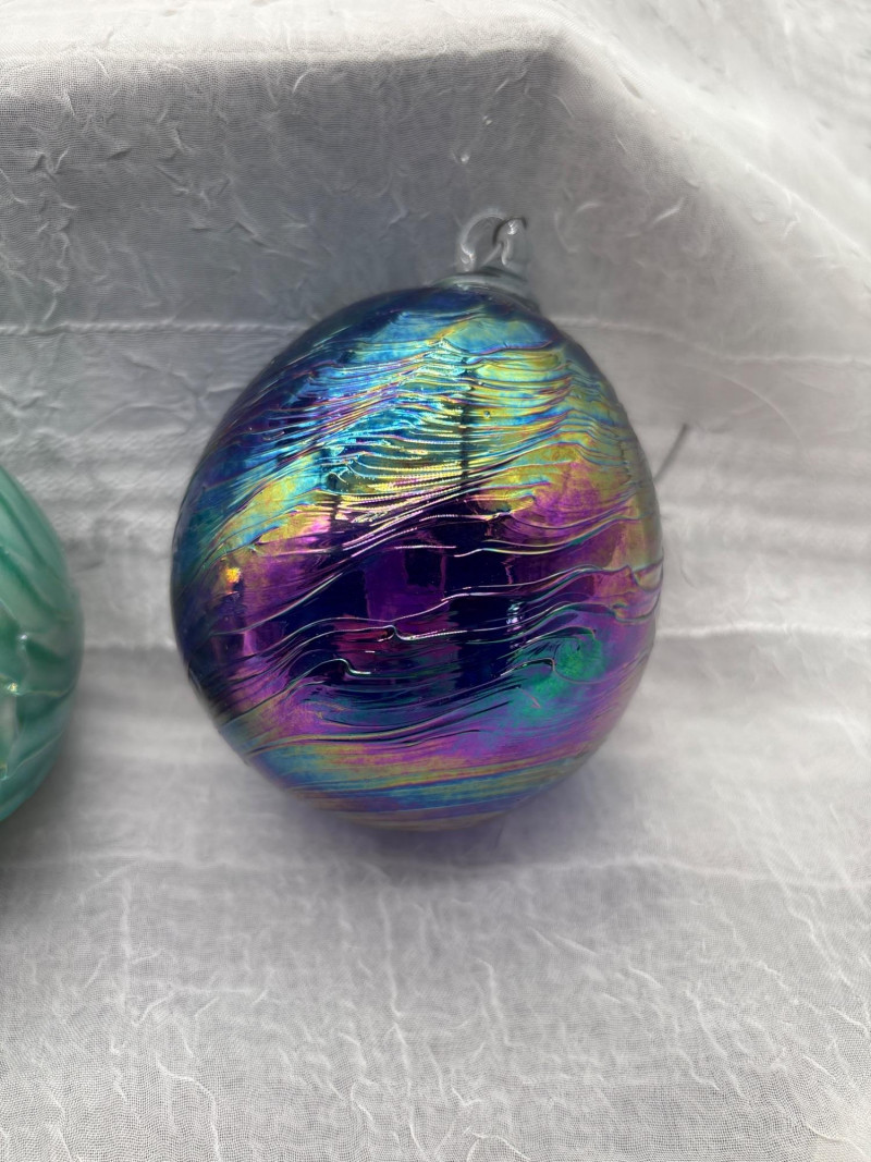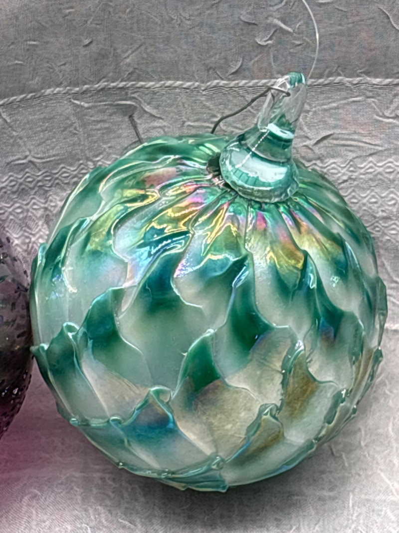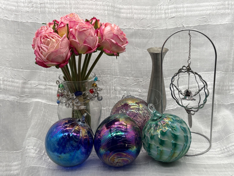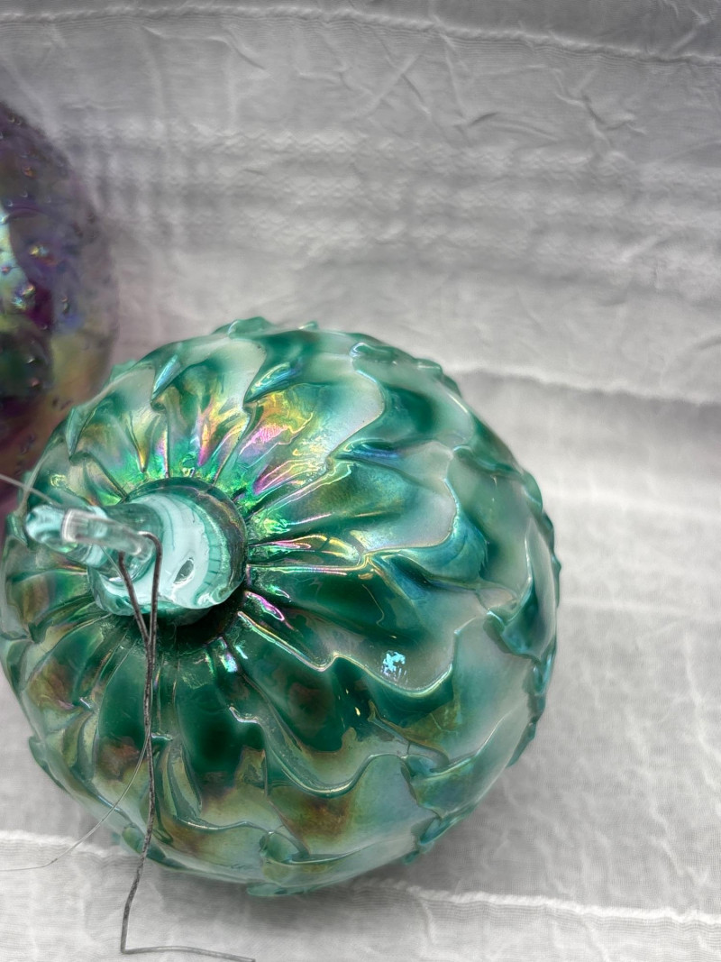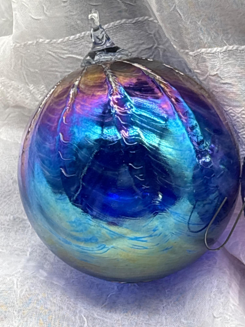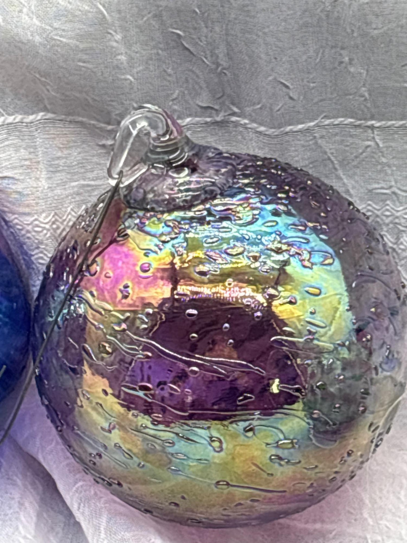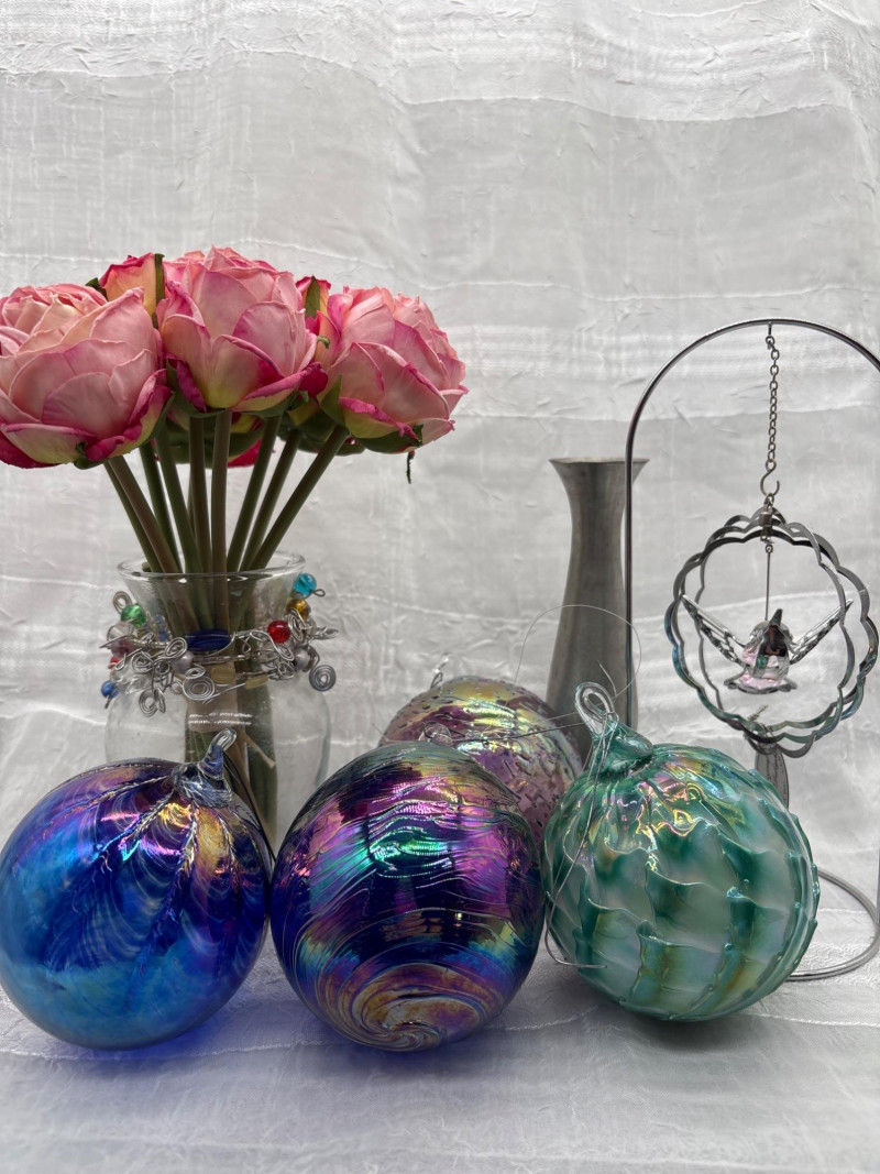 • 4 iridescent art glass orbs (approx. 10" around) with rich swirling colors