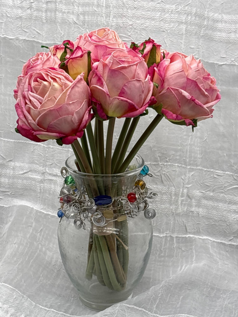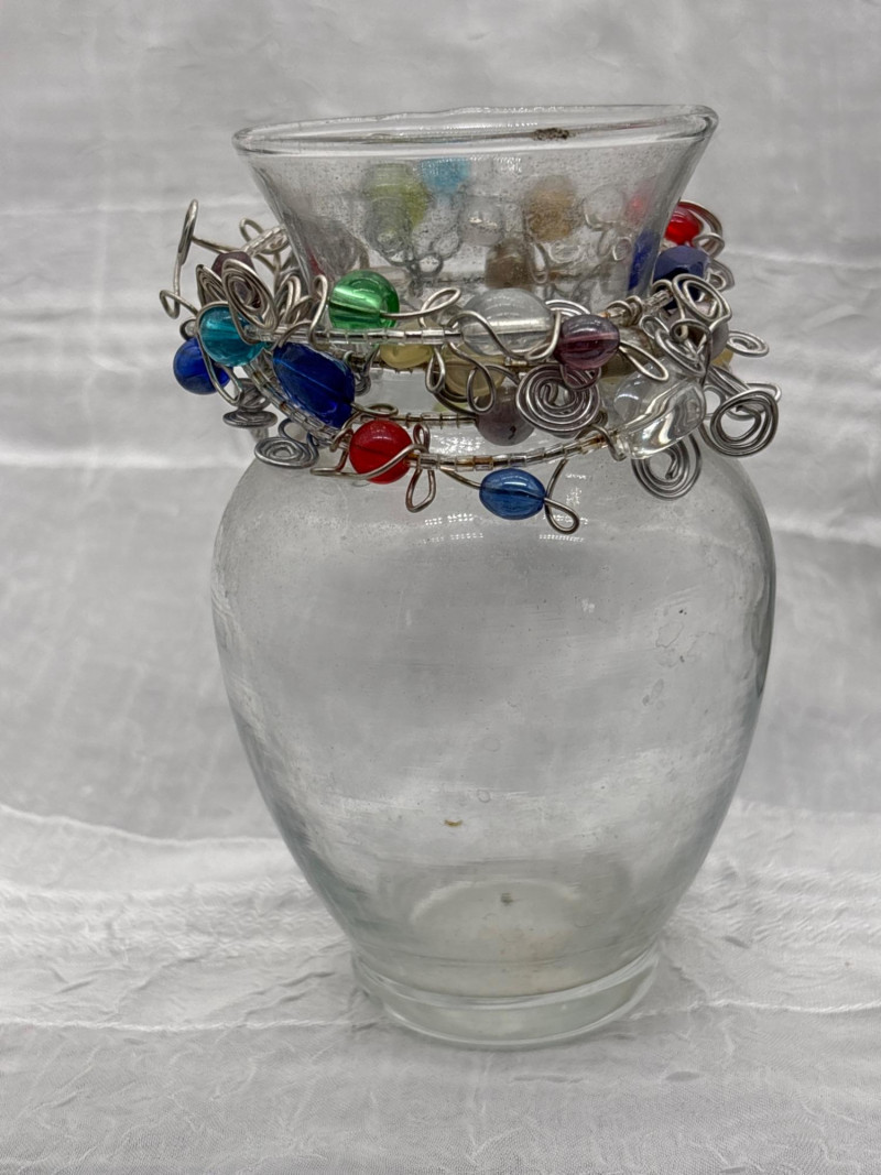 • Glass vase (approx. 5" tall) with decorative wire wrap accents