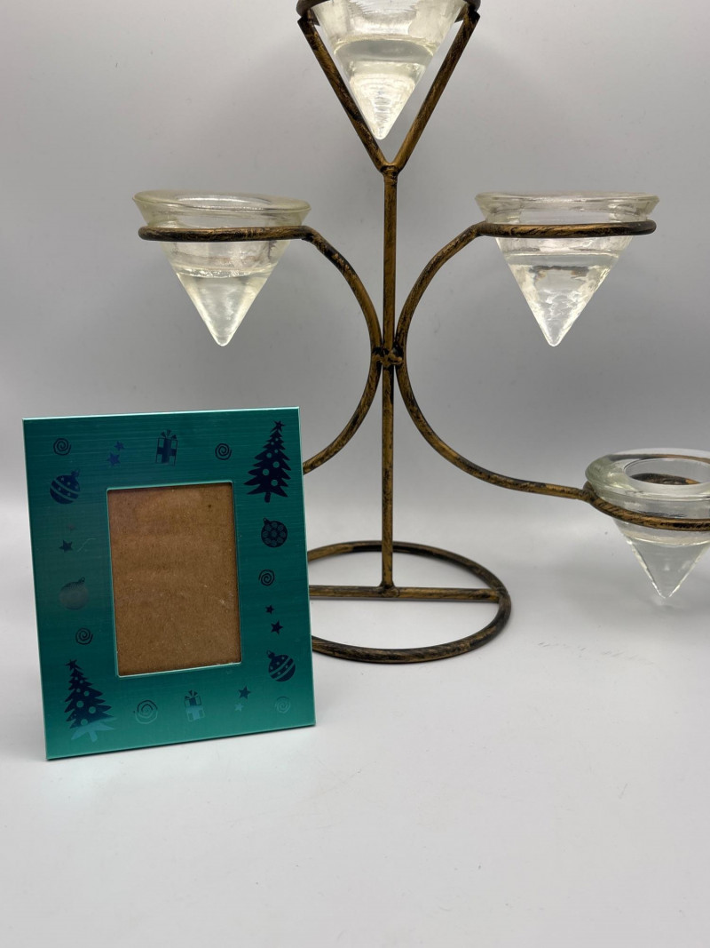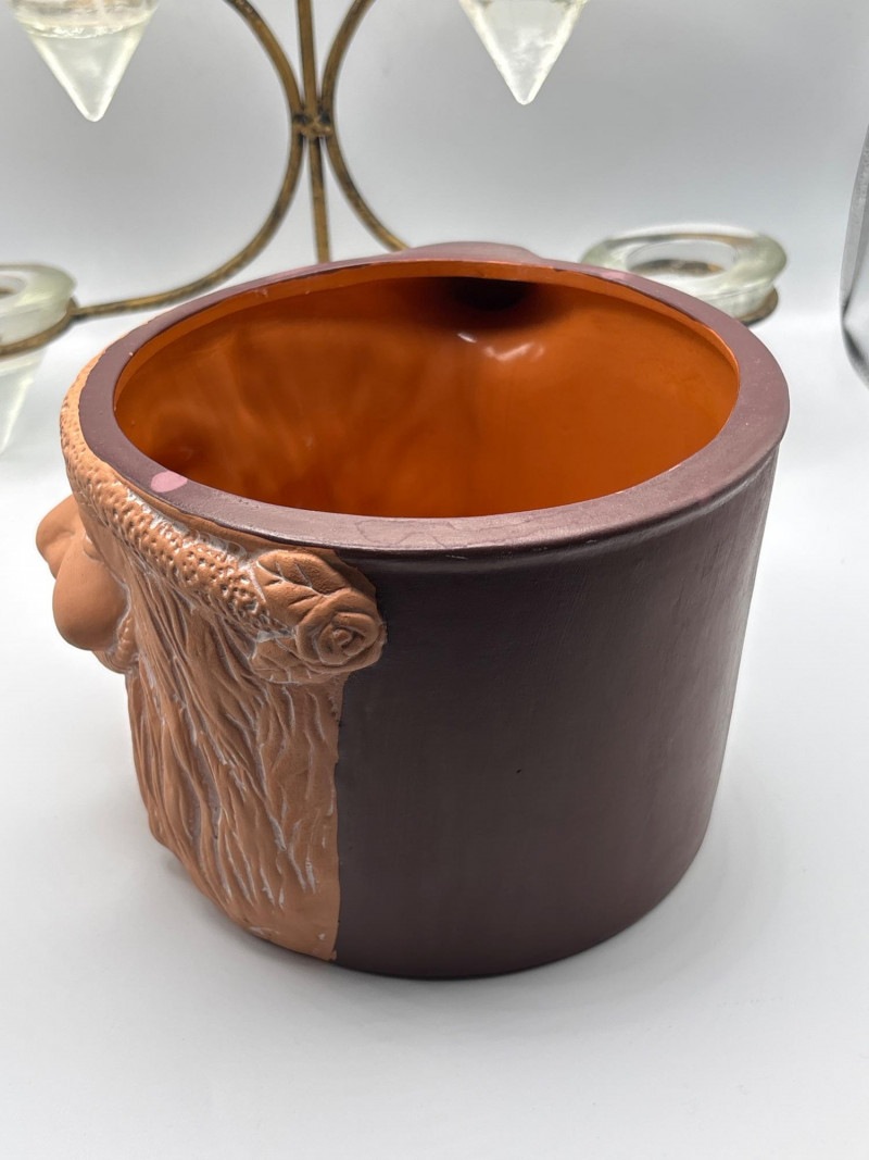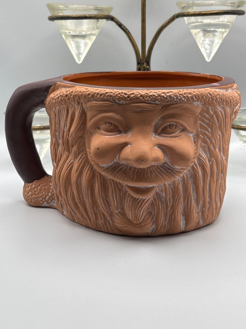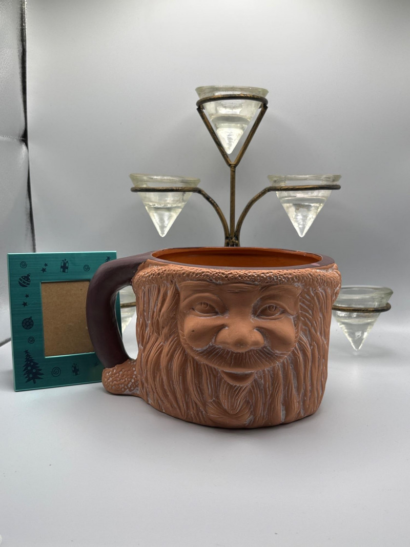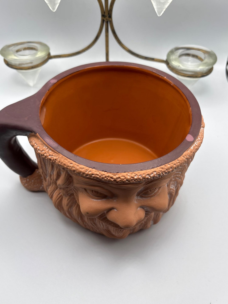 Whimsical character piece with unique décor accents. Eclectic décor lot featuring a vintage-style face mug/planter with a carved bearded character design, paired with additional decorative items. The standout piece is a large ceramic mug or planter with a detailed face motif, perfect for use as a planter, utensil holder, or conversation-starting décor. Also included is a multi-arm candle holder with glass cups and a small decorative frame. A fun mix ideal for collectors, quirky décor lovers, or resale. Pre-owned with light wear consistent with use. No major damage noted. Sold as-is—please review photos for condition and contents. Yes – shipping available. Combined shipping offered when possible.
