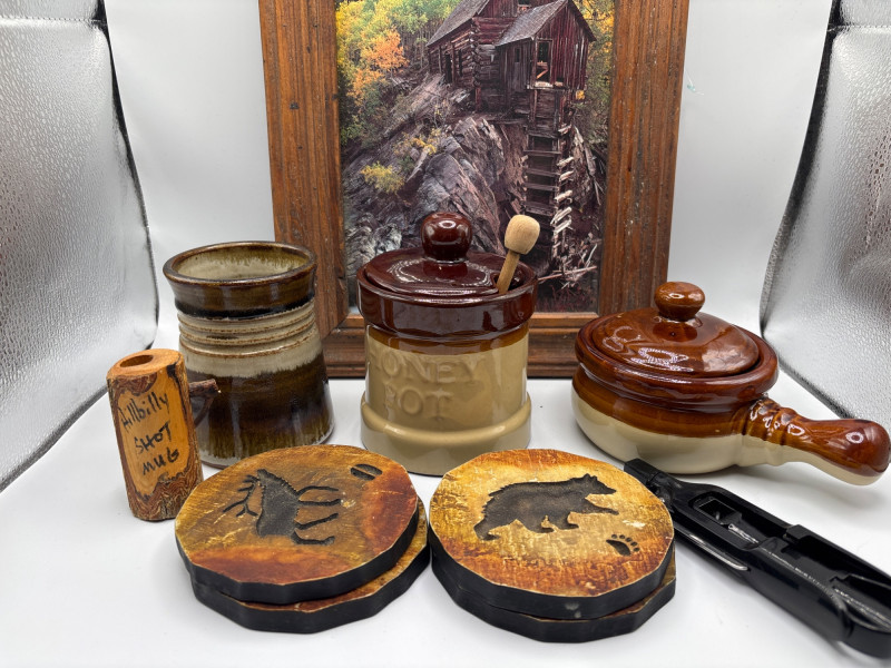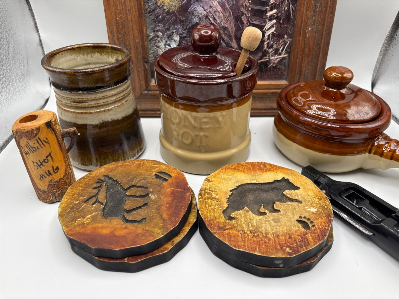 Lot # 154 - Rustic Cabin Decor Lot Frame Honey Pot Wood Coasters Bear