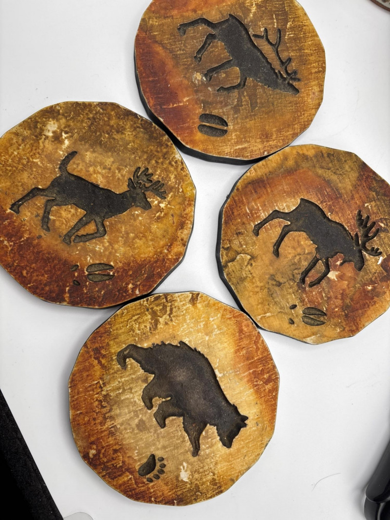 • Set of wood coasters featuring wildlife (bear & moose designs)