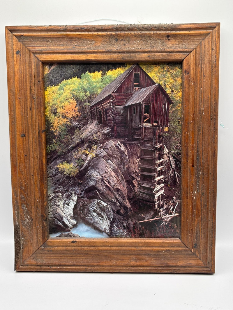 • Framed rustic cabin scene artwork (shown in background)