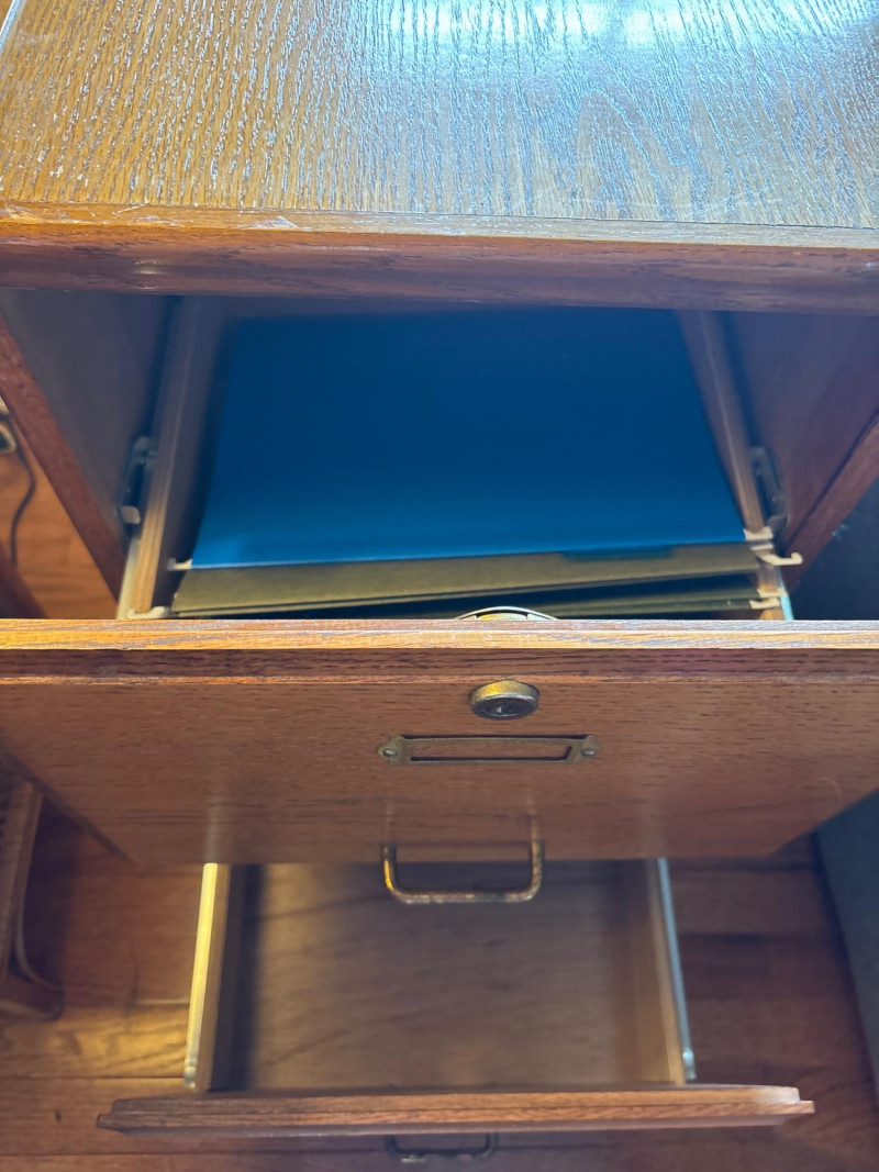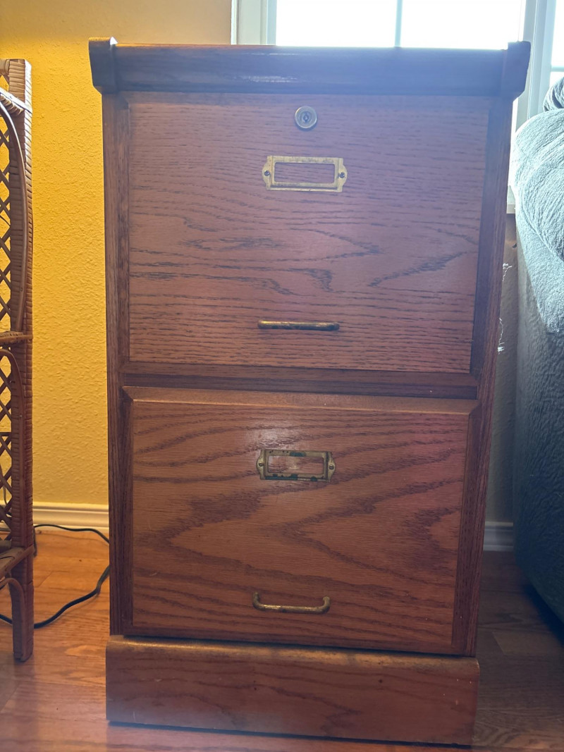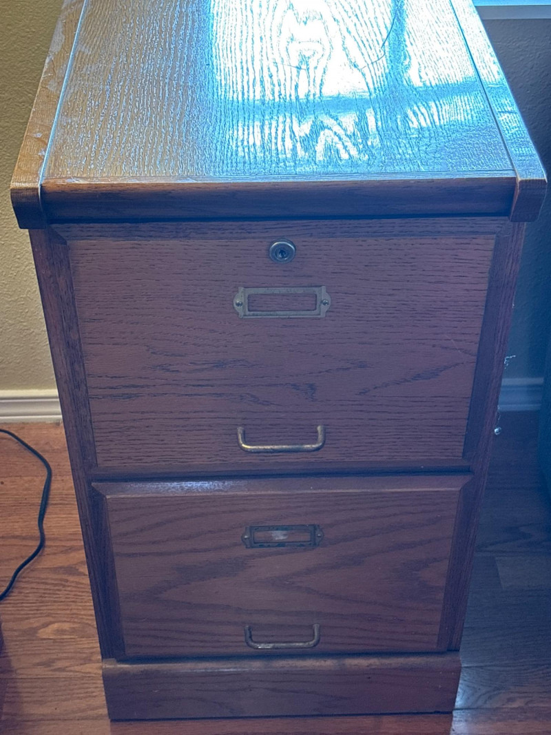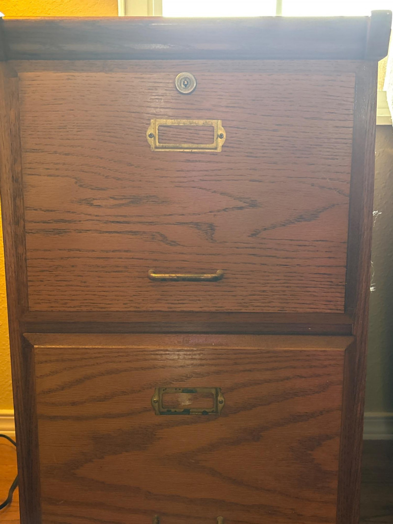 Solid and functional vintage oak 2-drawer file cabinet featuring classic industrial styling with warm wood grain and brass hardware. A great blend of durability and character, perfect for home office, workshop, or vintage-inspired spaces. Each drawer includes a label holder and sturdy pull handle, giving it that timeless office look while still being highly practical for everyday storage. Features: Dimensions: Condition Please review photos carefully—they are part of the description. Shipping