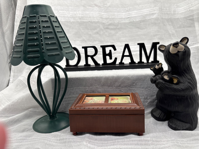 Lot # 163 - Cabin Bear Decor Lot Music Box Lamp Dream Sign Rustic Lodge