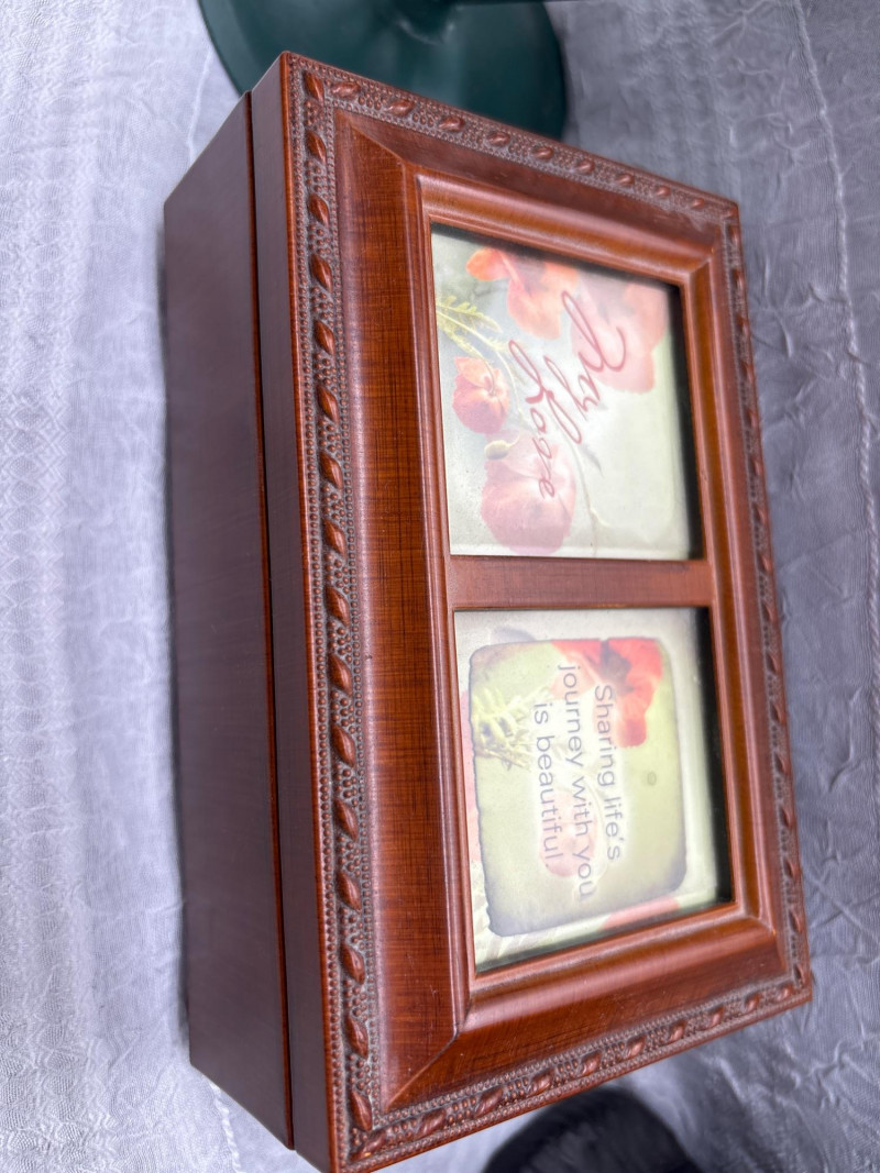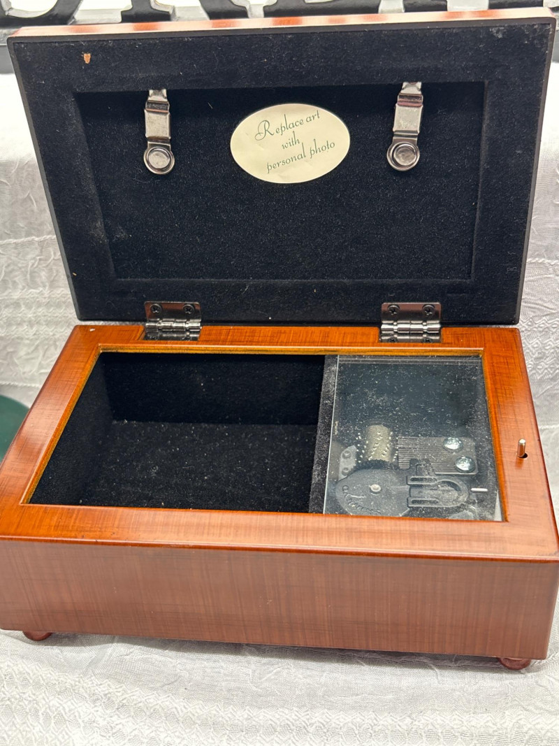 • Wooden music box – approx. 6" x 6" x 2.5" (tested and working)