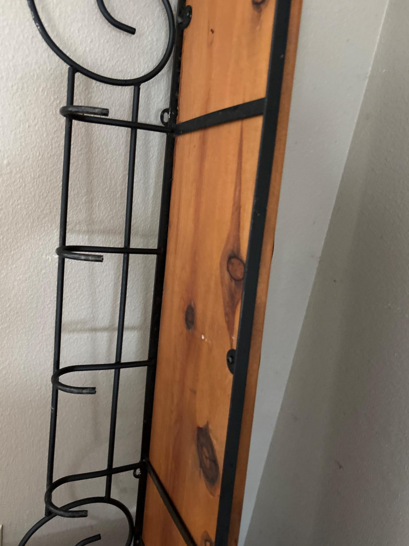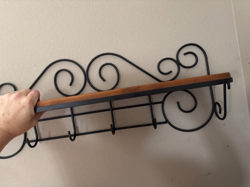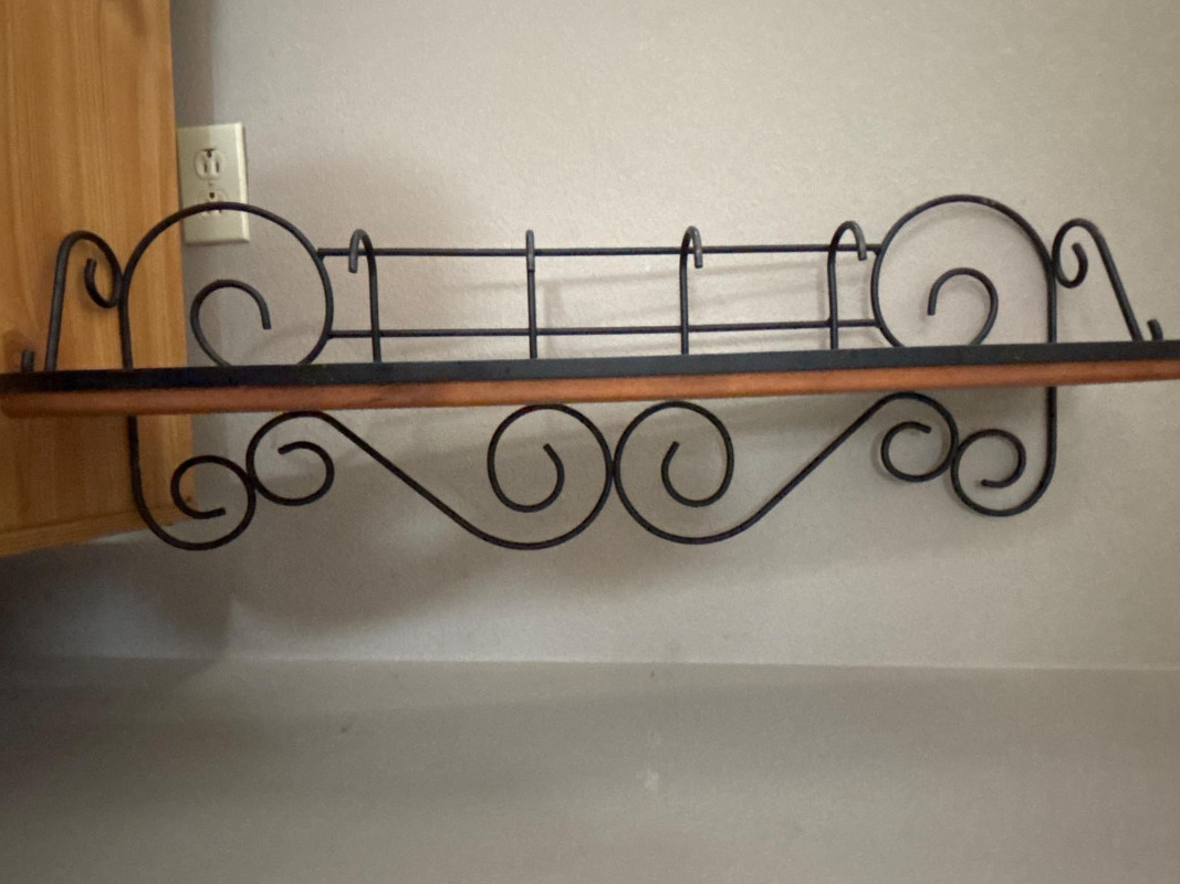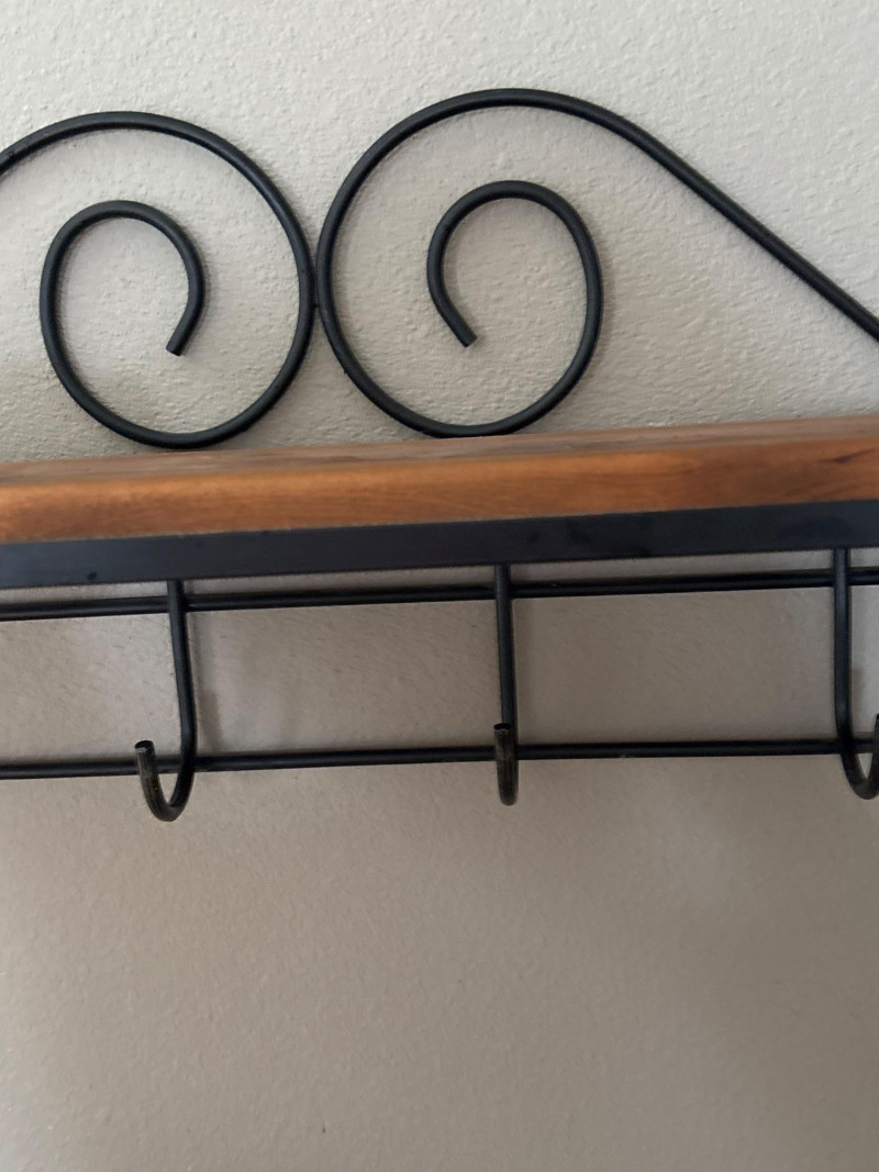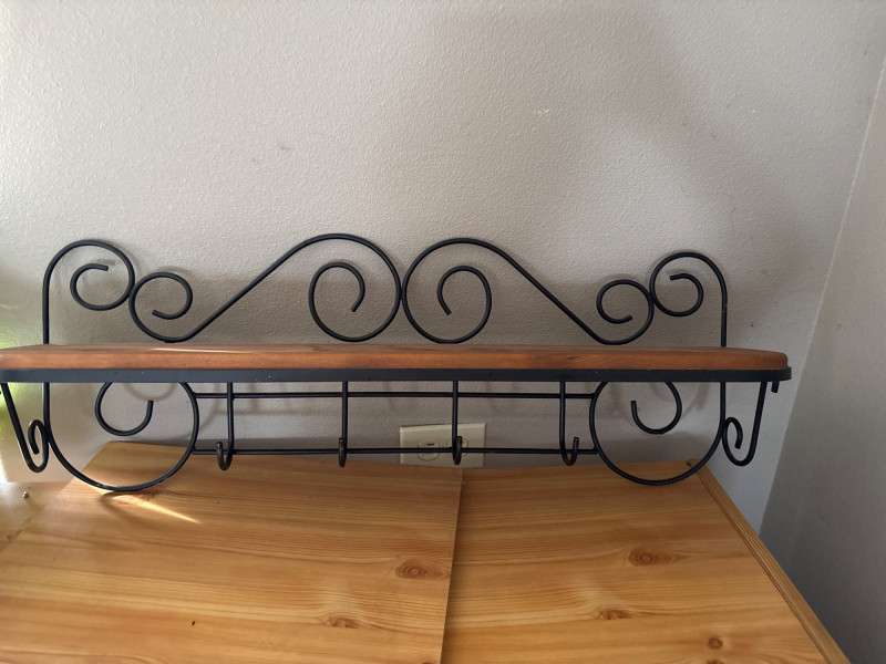 Functional and decorative, this wrought iron wall shelf with built-in hooks is the perfect entryway or kitchen piece. Featuring elegant scrollwork and a warm wood shelf, it combines storage and style in one compact design. The lower hooks are ideal for hanging coats, bags, towels, or keys, while the top shelf provides space for décor, baskets, or everyday essentials. A great solution for keeping spaces organized while adding a touch of classic charm. Perfect for entryways, mudrooms, kitchens, or bathrooms. Good used condition. Shows light wear consistent with normal use. Hooks and structure are solid and functional. Please see photos for full condition details. No