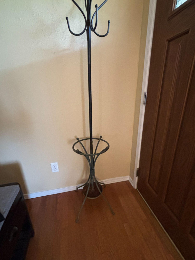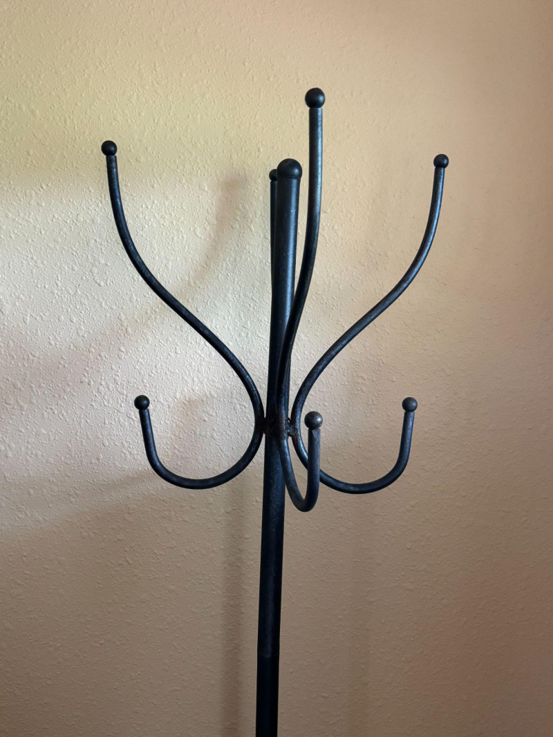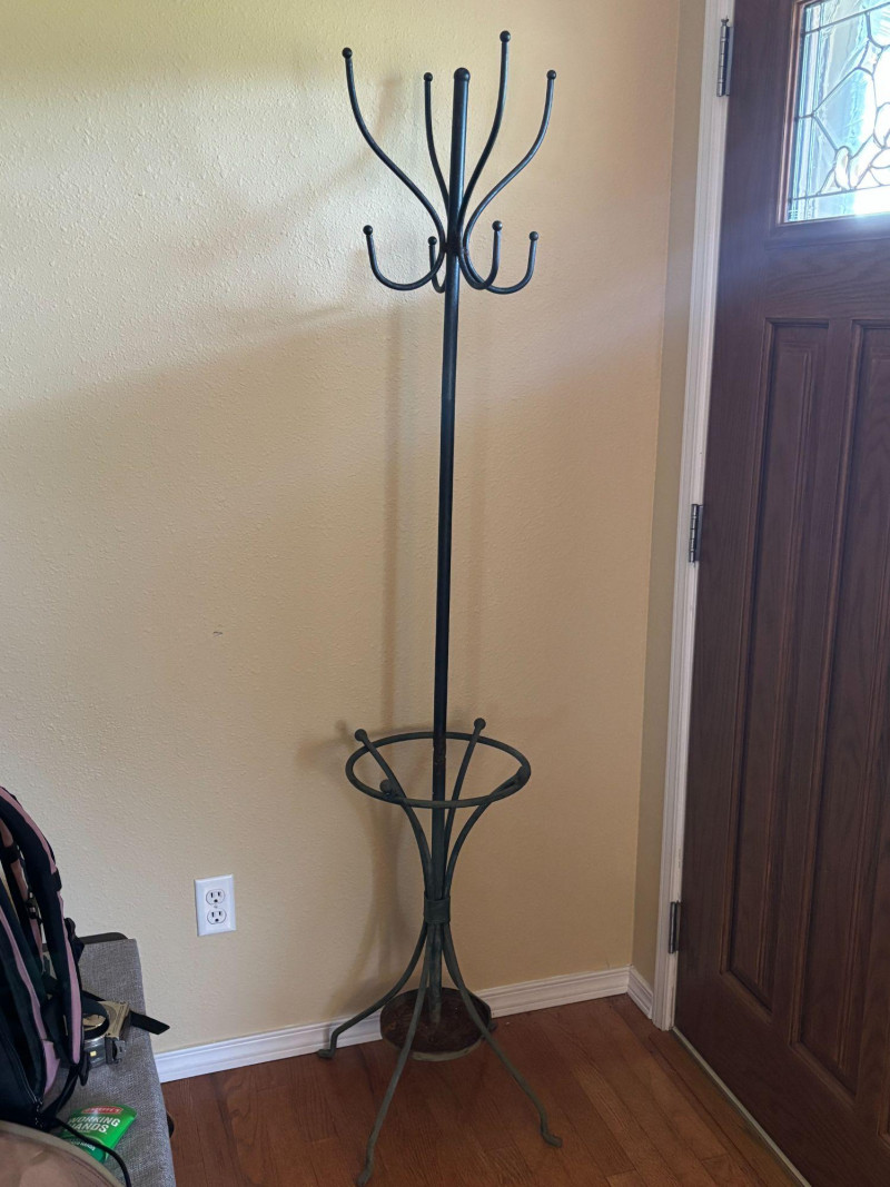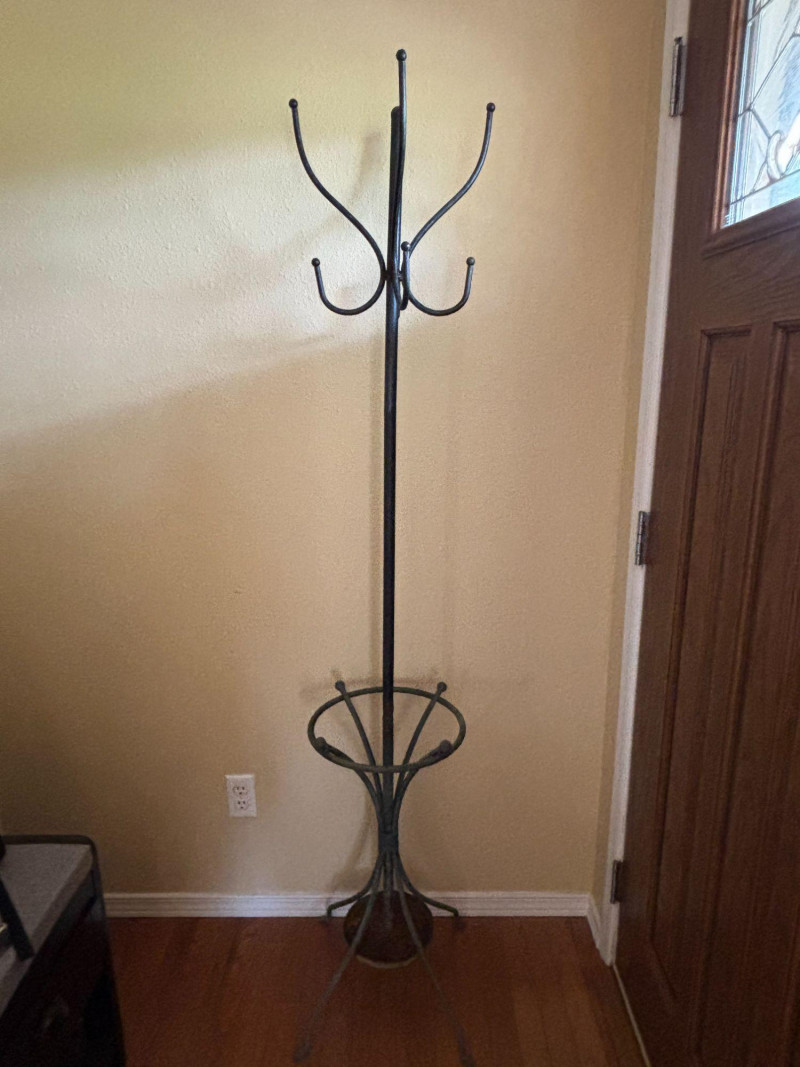 Organize your space with style and function. A sleek and functional tall metal coat rack stand featuring multiple hooks for coats, hats, and bags, along with a built-in lower ring designed to hold umbrellas or accessories. Standing approximately 69 inches tall, this piece is perfect for entryways, mudrooms, offices, or bedrooms. The simple, classic design blends easily with a variety of décor styles while offering practical everyday use. A great solution for keeping your space tidy and organized without taking up much floor space. Good overall condition with light wear consistent with use. Structurally solid and functions as intended. Sold as-is. Please review photos for details. Local pickup recommended due to size. Please bring help for loading.
