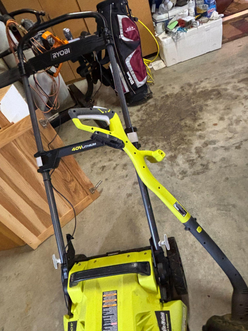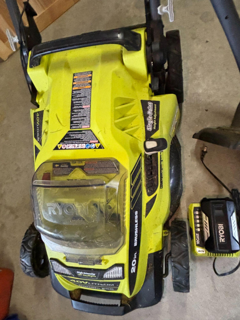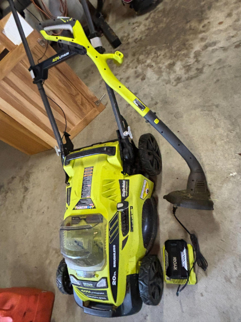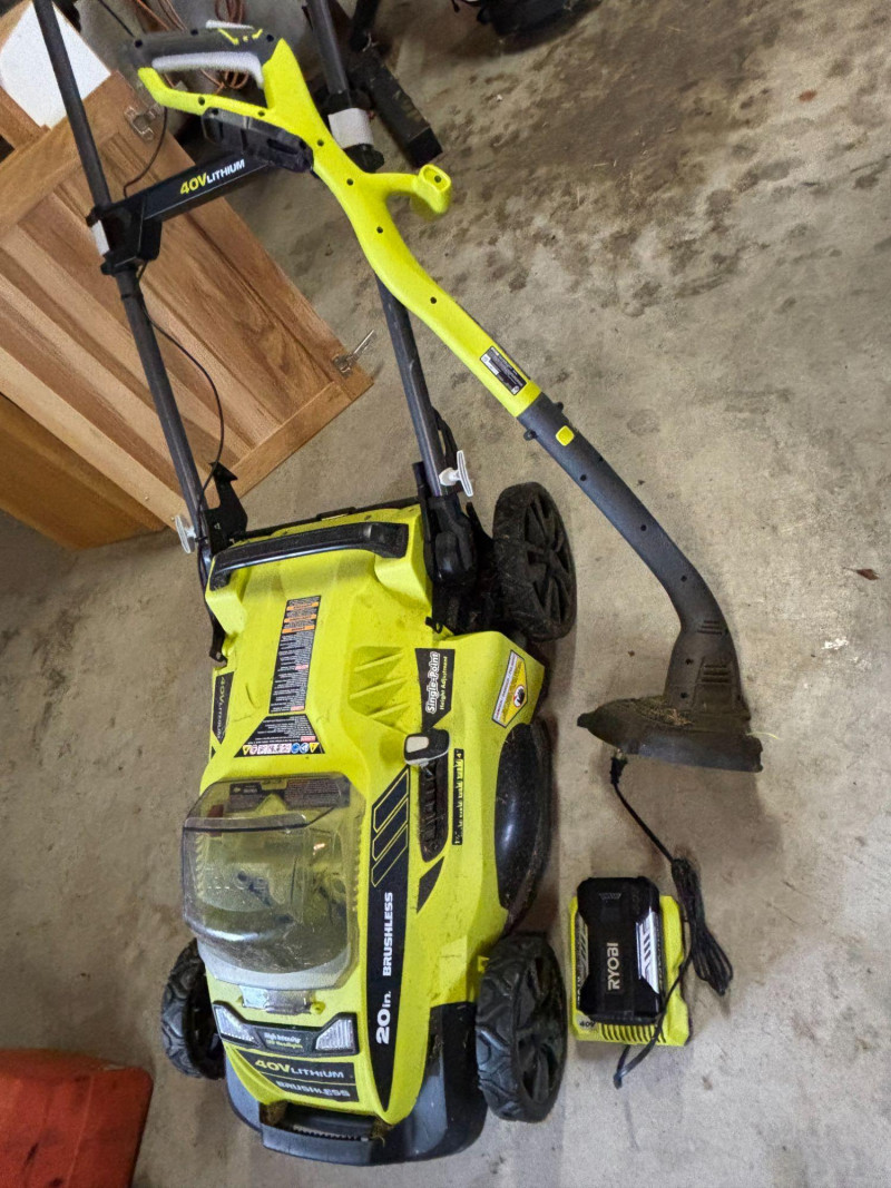 Upgrade your yard game with this Ryobi 40V lithium lawn care combo, featuring a 20” brushless push mower and matching string trimmer. This is the setup buyers want—cordless convenience, strong battery power, and easy operation without gas, oil, or pull starts. The mower features a brushless motor for longer life and better performance, while the included trimmer handles edges and tight spots with ease. A great all-in-one solution for maintaining your lawn. Includes: Perfect for homeowners looking to ditch gas and go electric. Good used condition. Shows normal wear from use. Powers on and runs when tested. Please see photos for full condition details. No