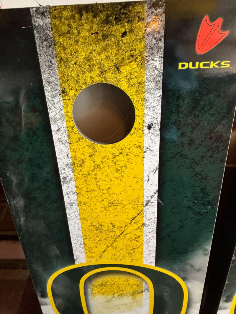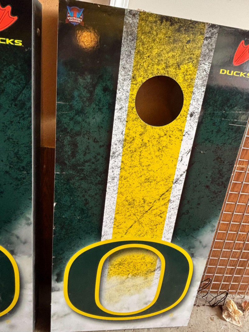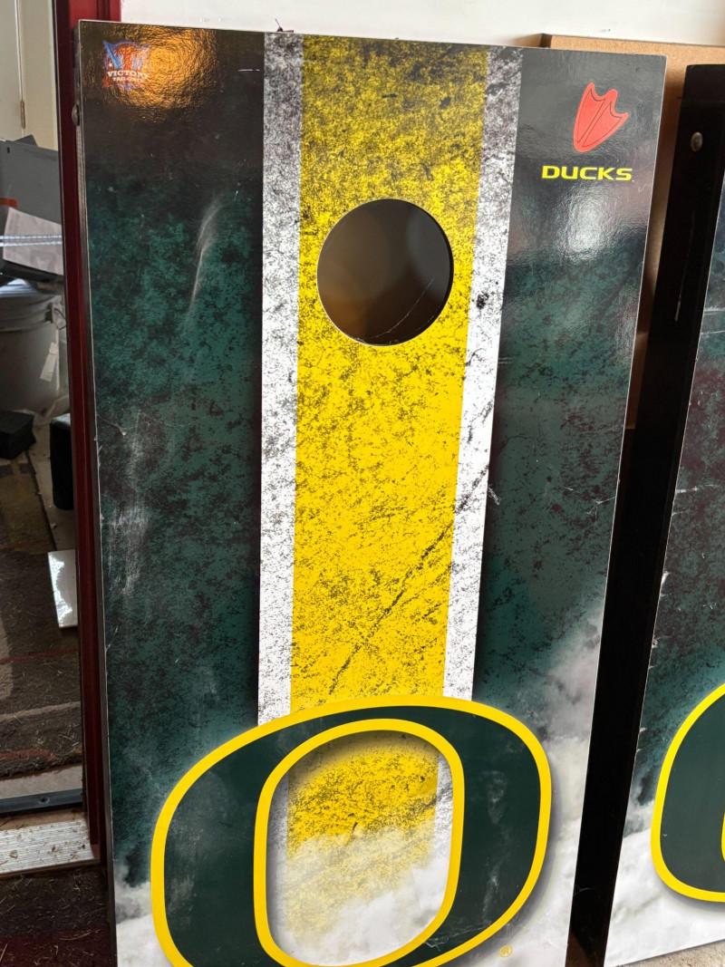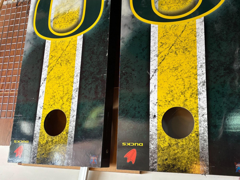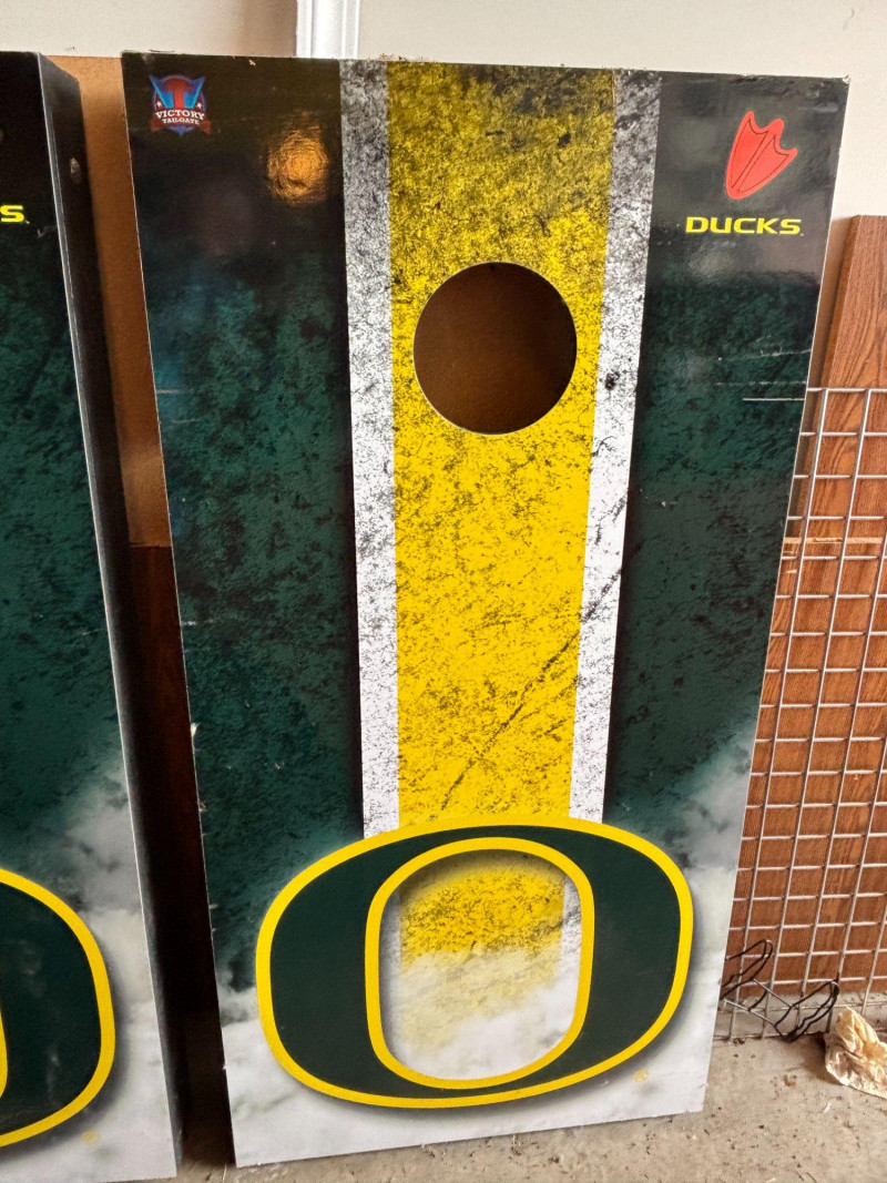Fun and ready for game day! This lot includes a pair of Oregon Ducks cornhole boards along with a metal Oregon Ducks parking/fan zone sign. Perfect for tailgating, backyard games, or showing off your Ducks pride. The boards feature bold team colors and graphics, and the included sign makes a great addition to a garage, shop, or game room. Includes: Great set for fans, collectors, or anyone building the ultimate tailgate setup. Used condition. Boards show visible wear from use including surface marks and finish wear (see photos). Sign appears in good overall condition with minor wear. Please review photos for full details. No